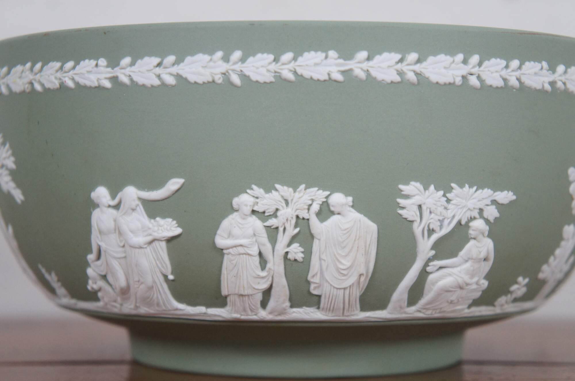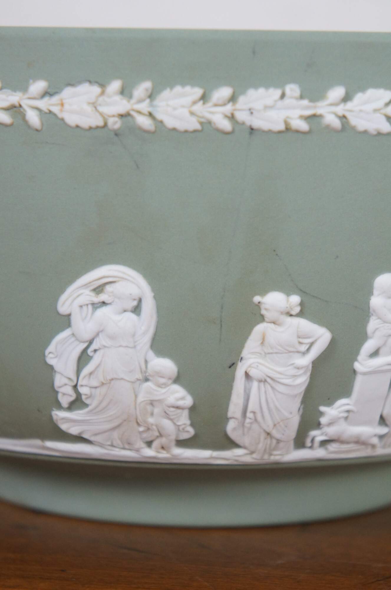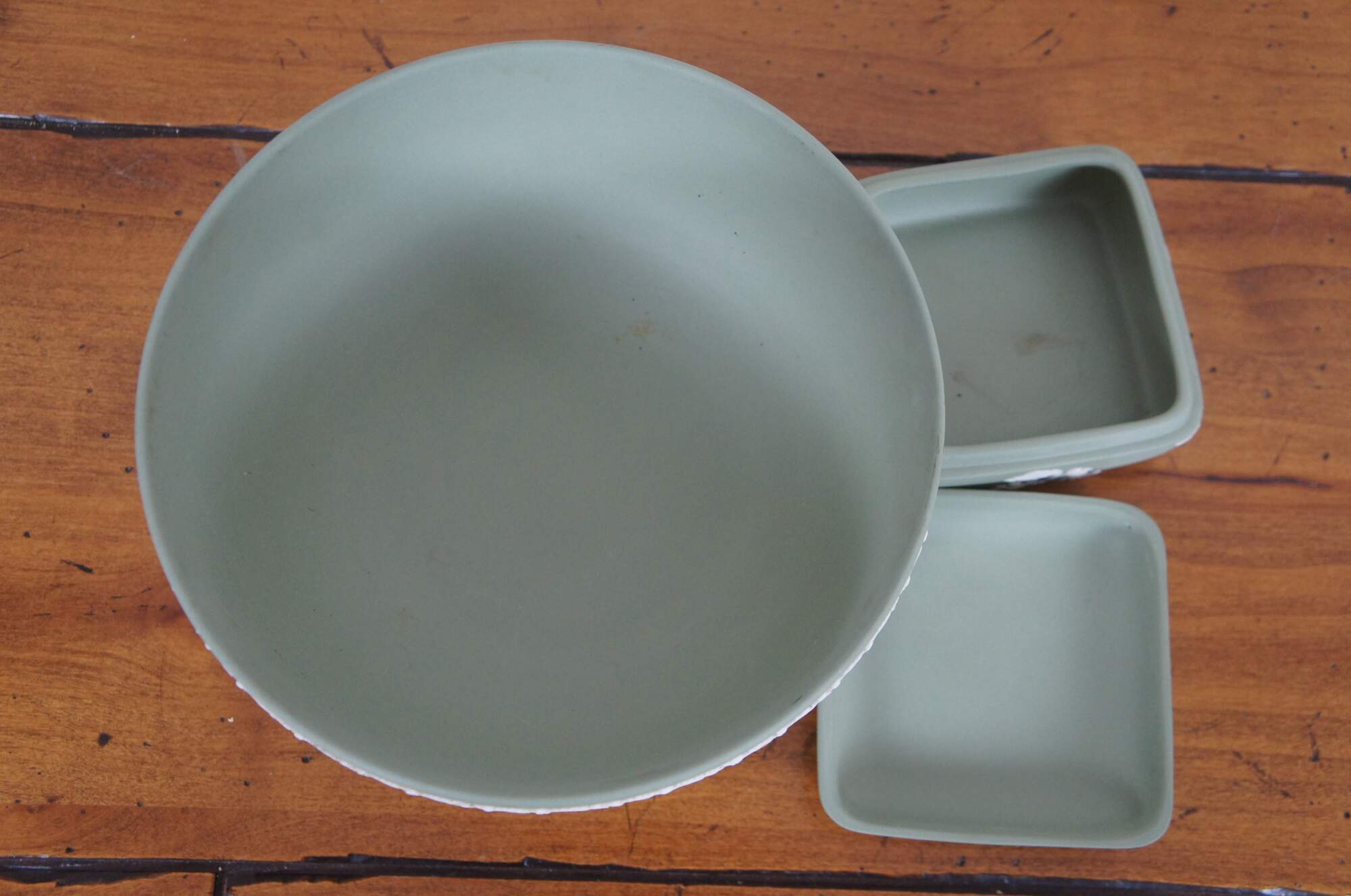 Vintage Wedgwood jasperware fruit bowl and square trinket box featuring neoclassical motifs in cream on matte celadon or sage green.