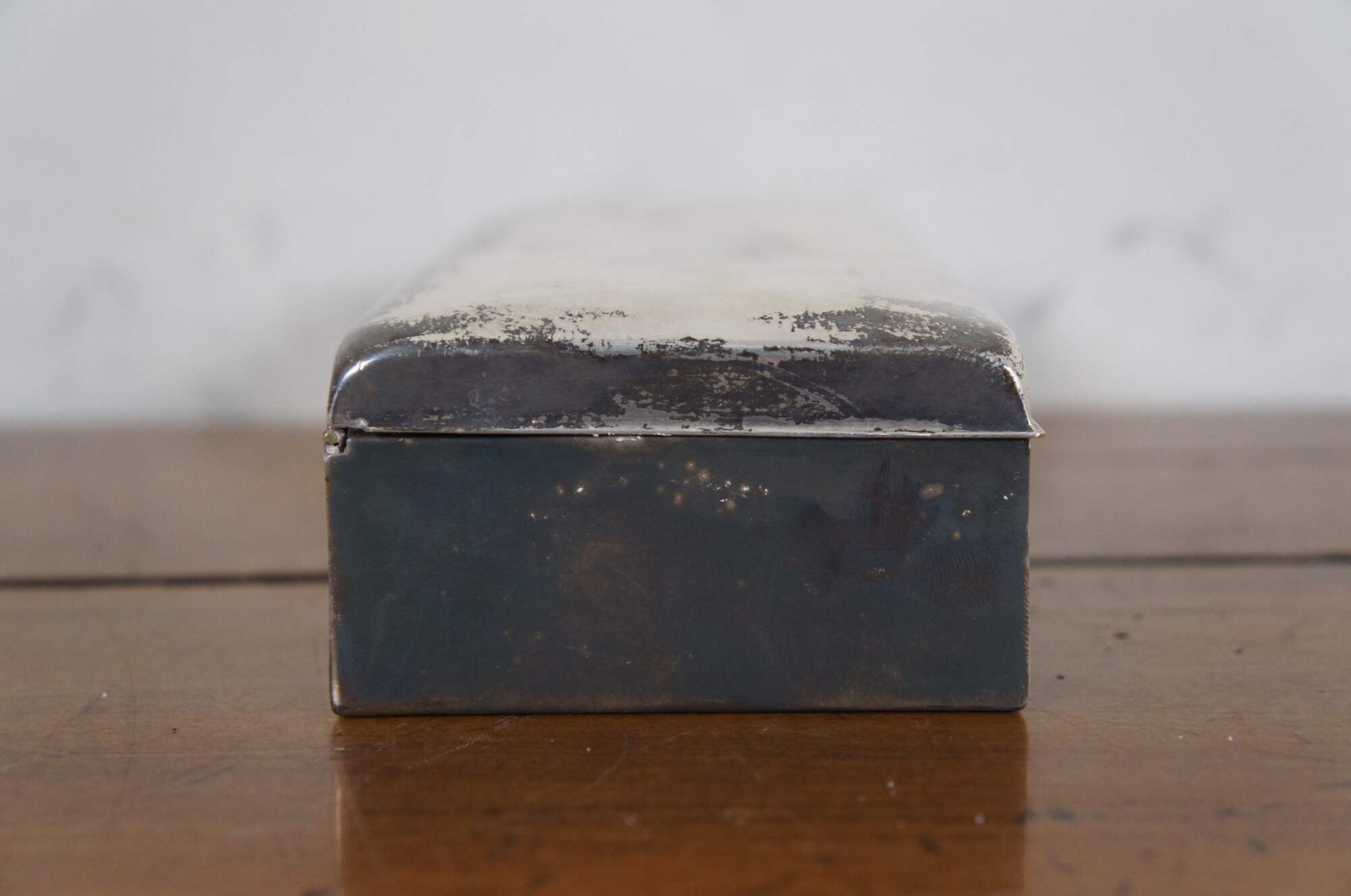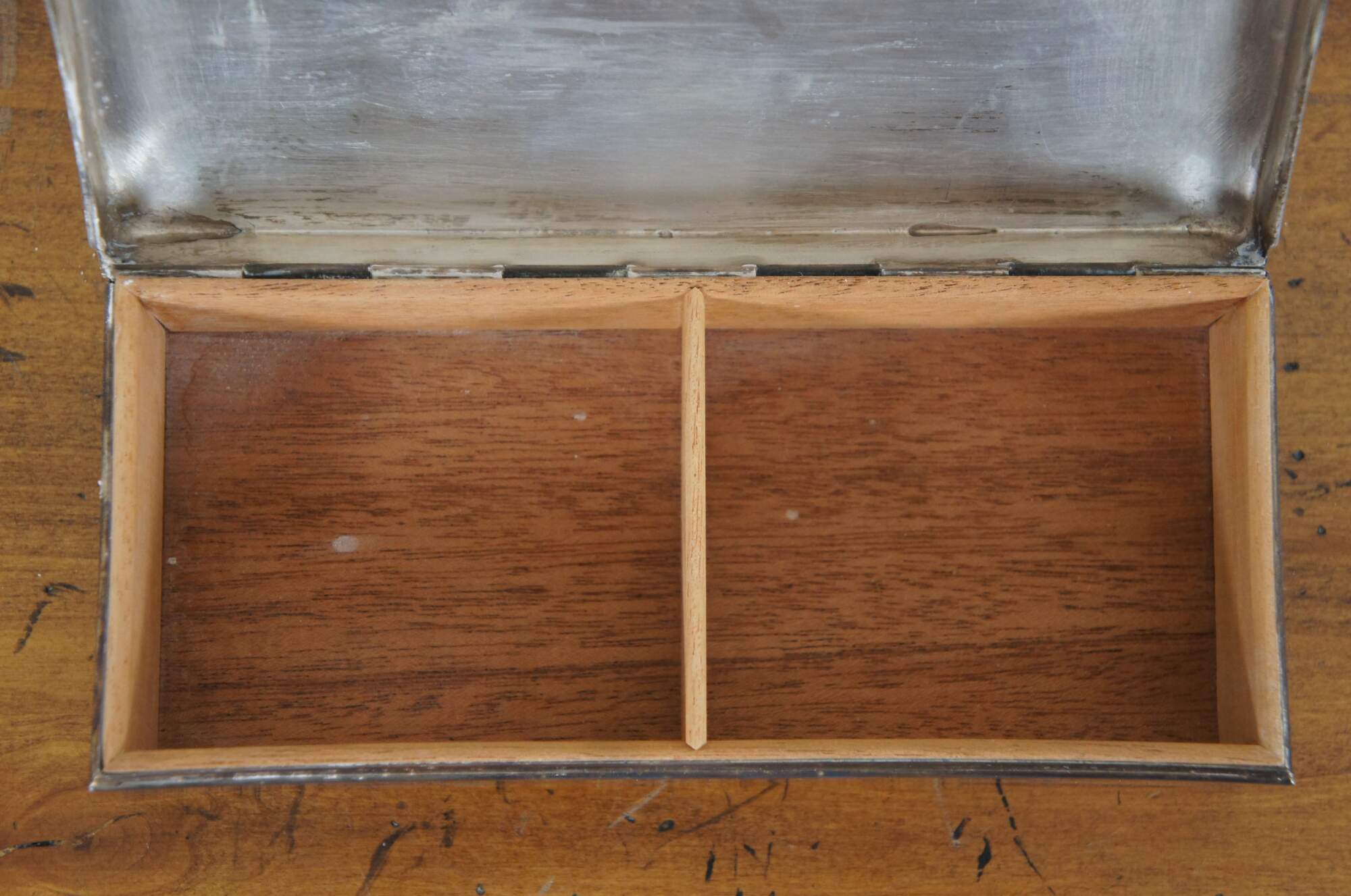 Vintage mid century EPCA Poole Silver Co number 2001 silver plate and cedar lined cigarette / cigar box. “Poole Silver Company was an American silver manufacturing company, active in Taunton, Massachusetts from 1892-1971. The Poole Silver Company was formed in 1892 by George Poole and Edward Roche in Taunton as Poole, Roche & Co., then established as a corporation on May 21, 1895, as an early manufacturer of silver products made with electroplating techniques. In 1900 it operated in a small two-room factory at 106 Whittenton Street, and later moved to 320 Whittenton Street. From 1946 the firm began to produce sterling silver flatware, holloware, and cutlery. In 1971 the company was bought by Towle Silversmiths. The intellectual property currently belongs to Lifetime Brands.”