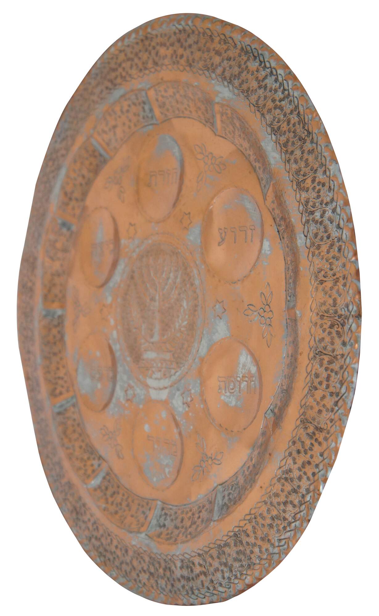 Vintage chased copper plate / platter for the Jewish celebration of the Passover Seder, with attached hook for displaying on the wall. Marked “Handmade in Israel” on hook. Attributed to Messica.