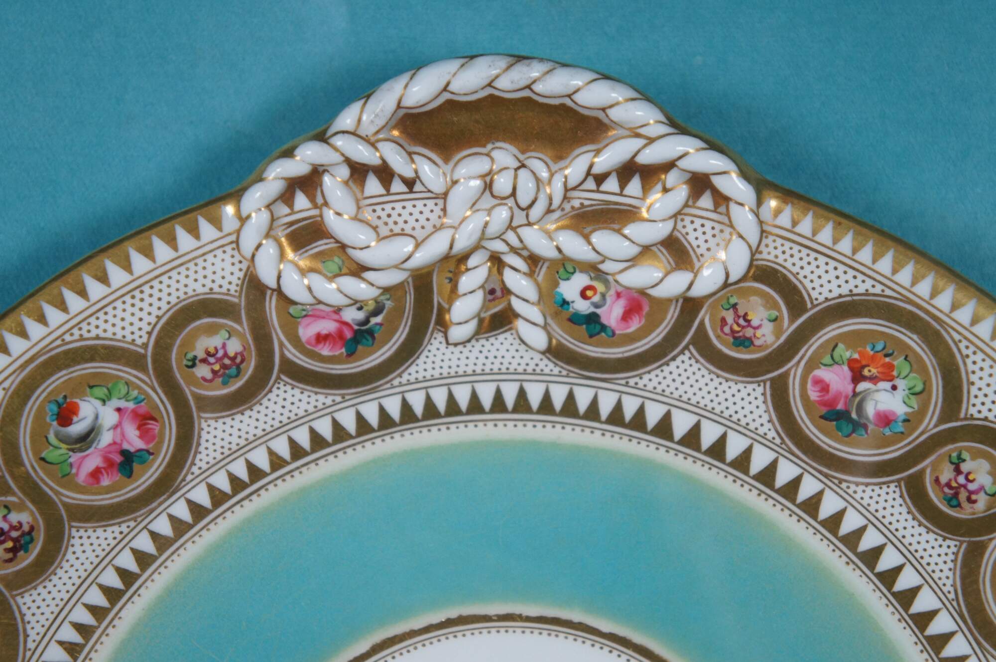 Rare antique Victorian English / British porcelain teacup / saucer and serving plate, painted turquoise, gold, and ringed with flowers and ribbon designs. Mounted in deep multi beveled frame shadowboxes with gold / blue / turquois and egg and dart bas relief molding. Date / Kite mark reads August or September (R or D) 25, 1868.