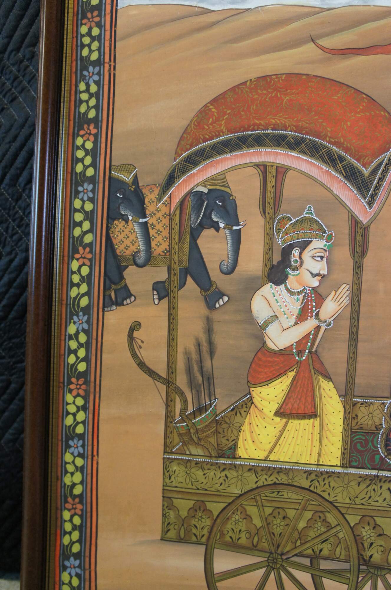 This Krishna Arjuna painting depicts the story of Mahabharata and the battle of Kurukshetra where Krishna was Arjuna's chariot driver and had spoken to him the words from the Bhagavada Gita.