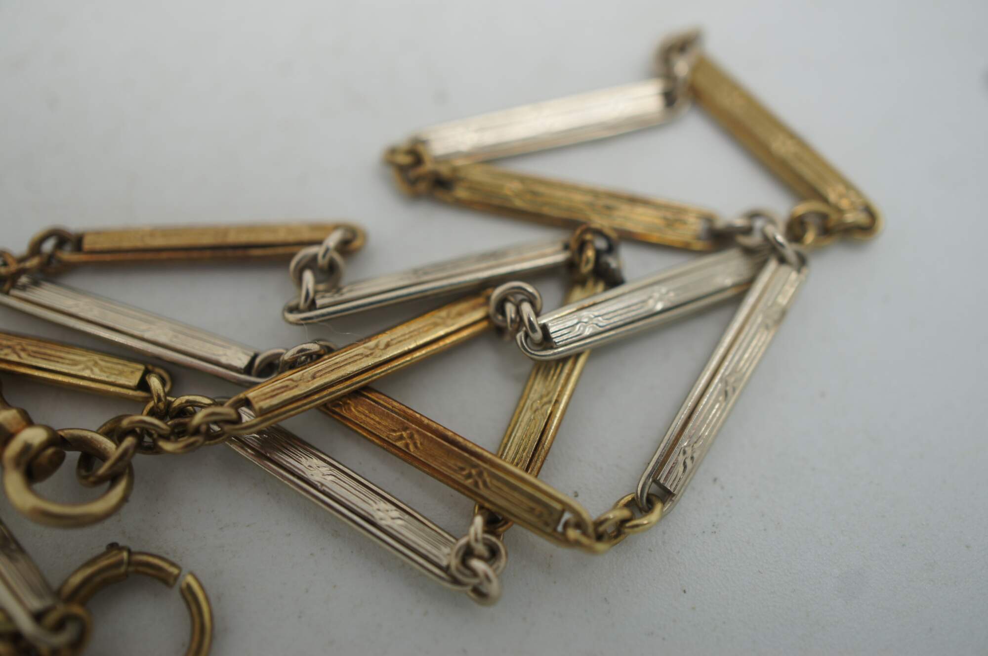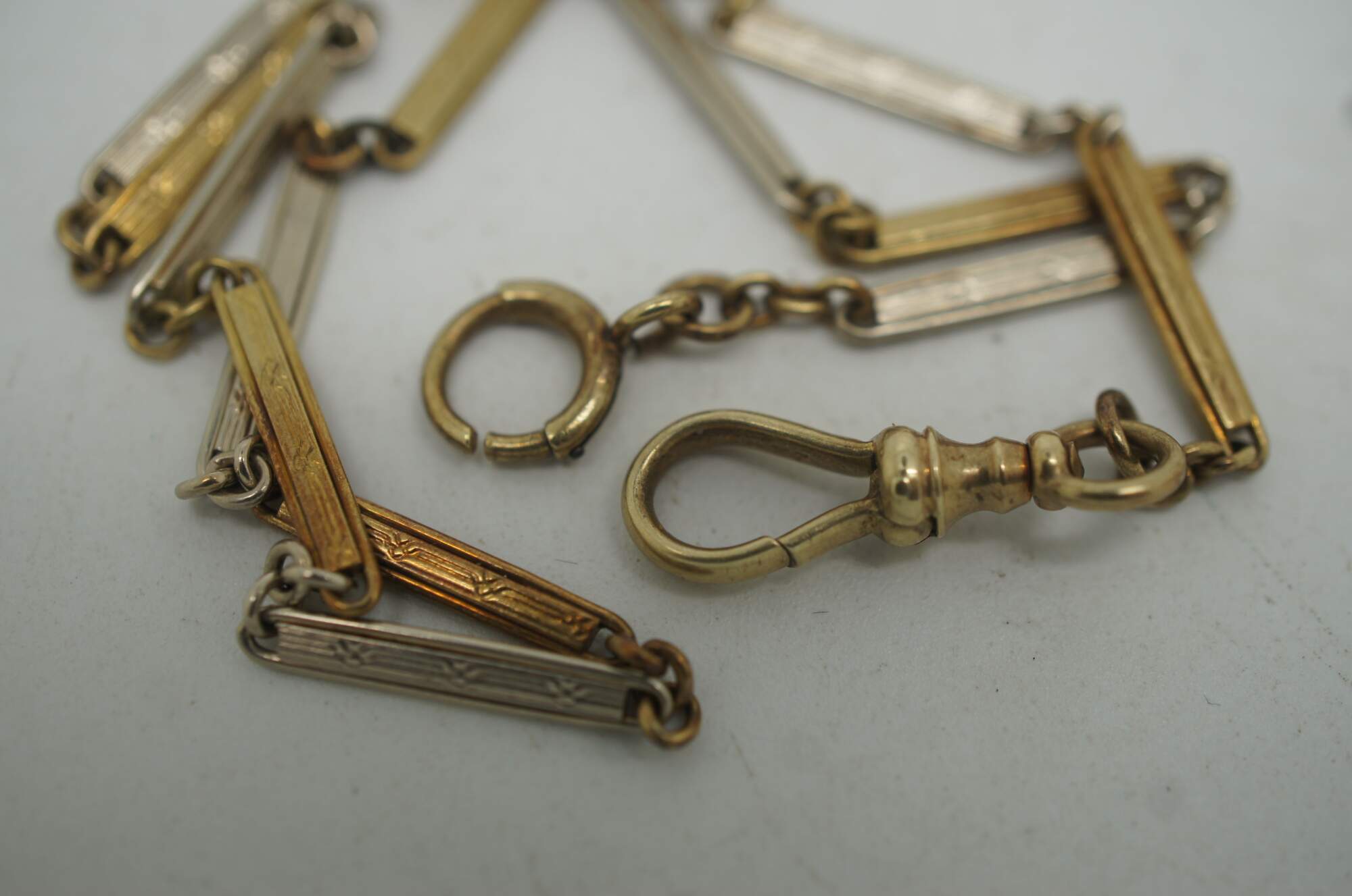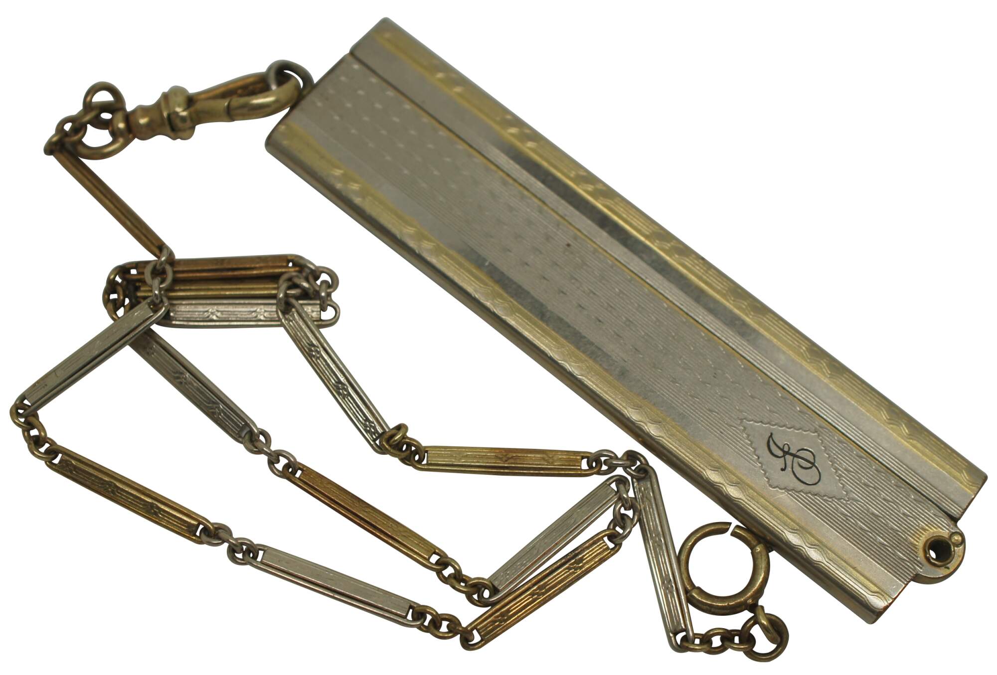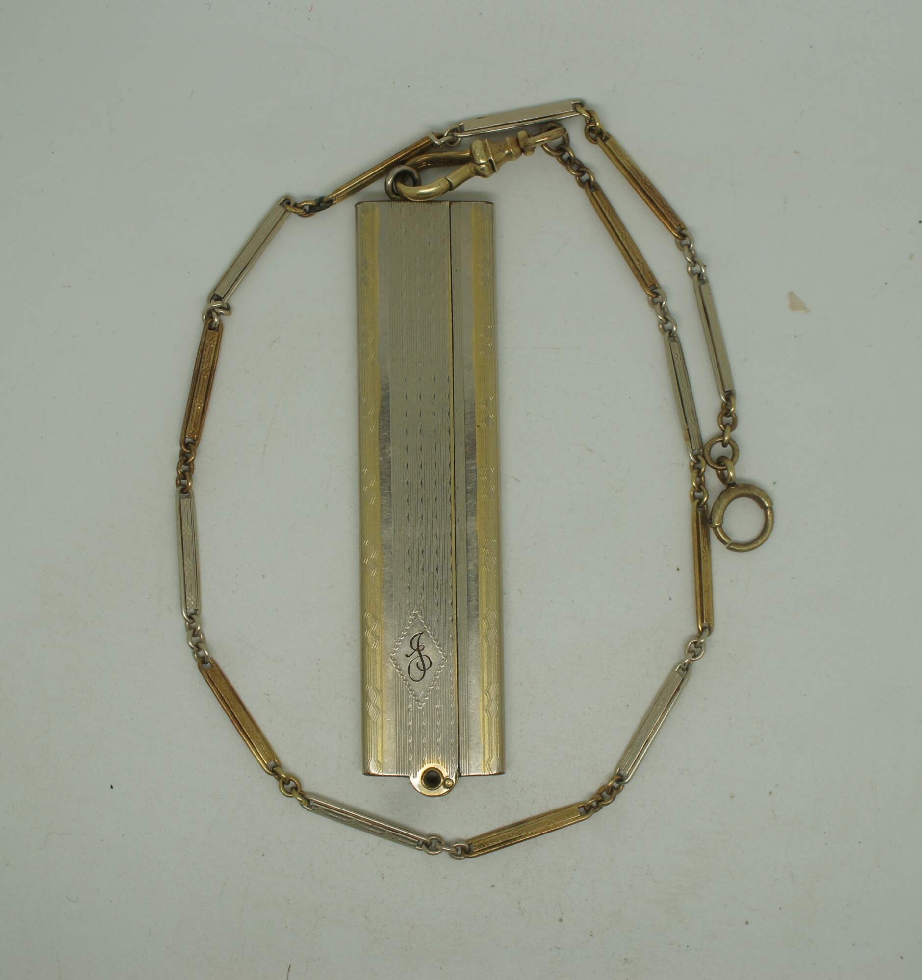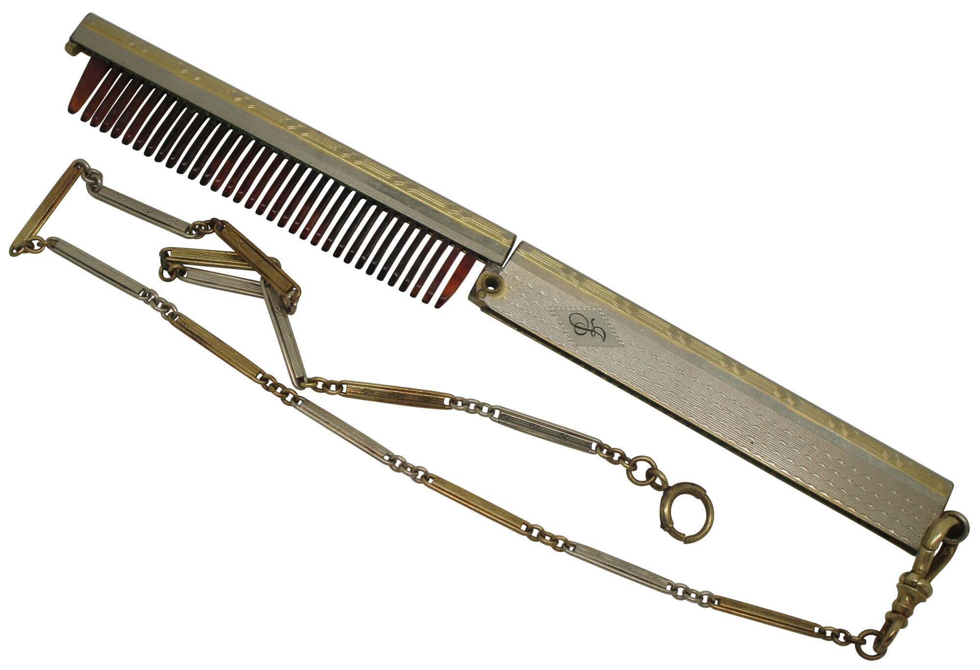 Antique Victorian folding comb with brown tortoiseshell colored celluloid teeth, monogrammed with a J, and attached to a silver and gold chatelaine chain marked 14K on the clasp.