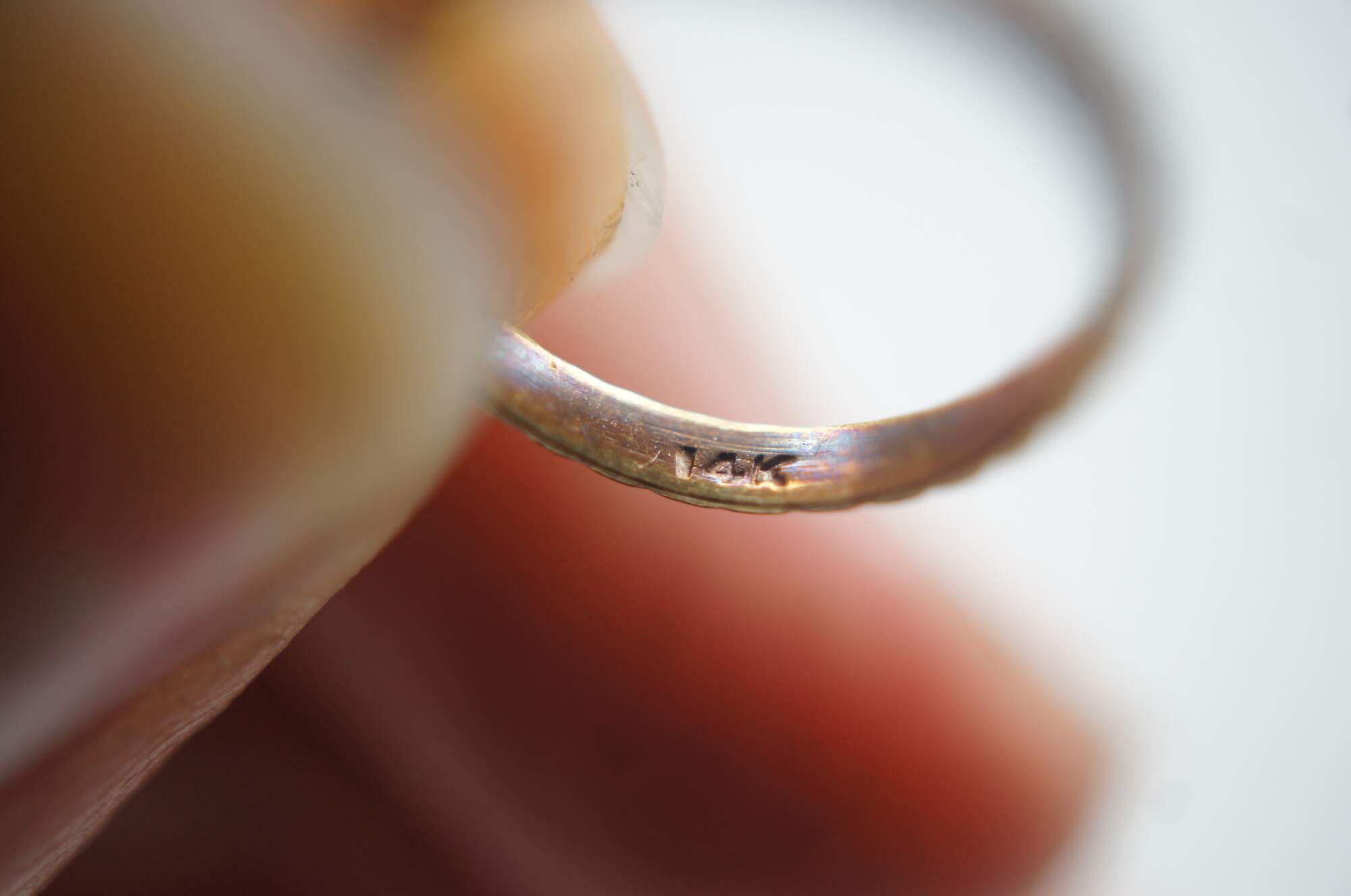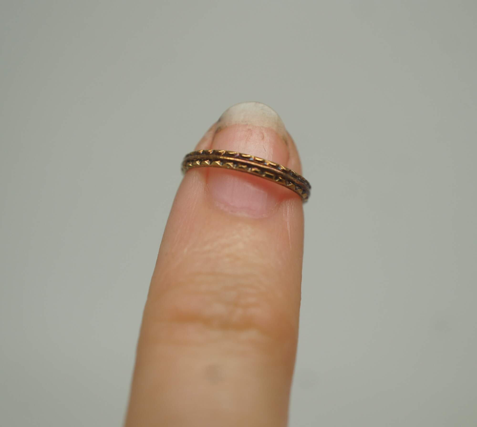 Tiny antique 14K gold baby sized ring with a sawtooth pattern divided by a ridge.