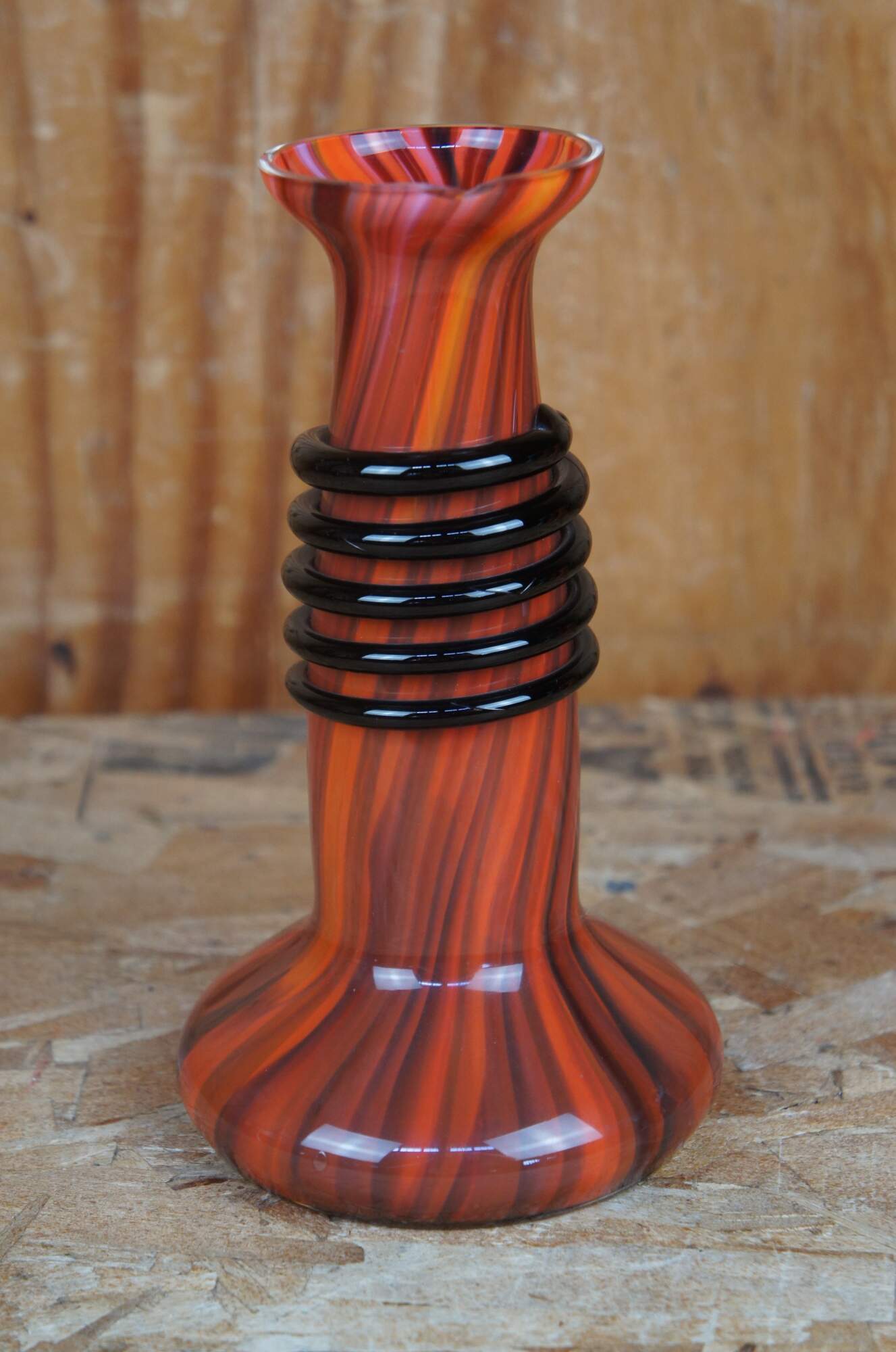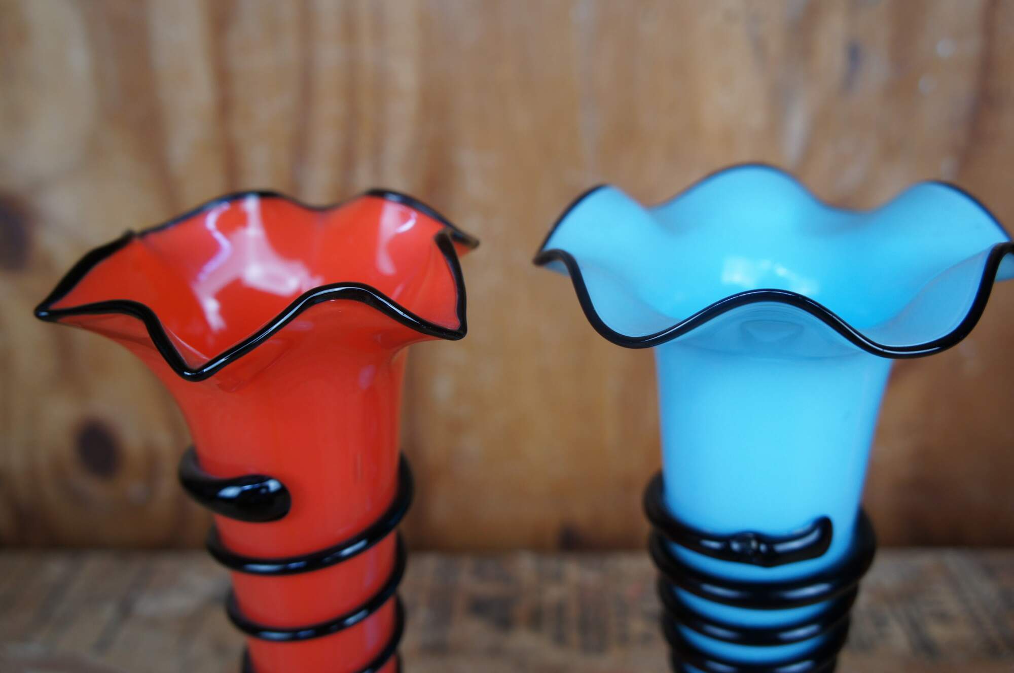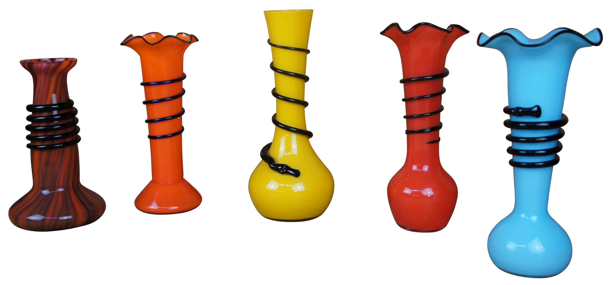 Five vintage Bohemian Czechoslovakian art glass bud vases featuring swirled / flared / ruffled designs with vibrant colors and black accents.