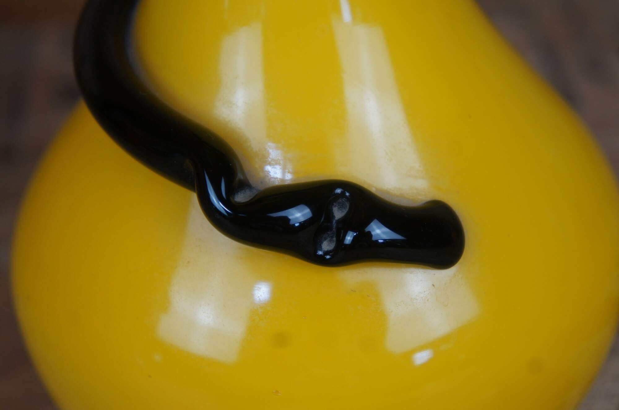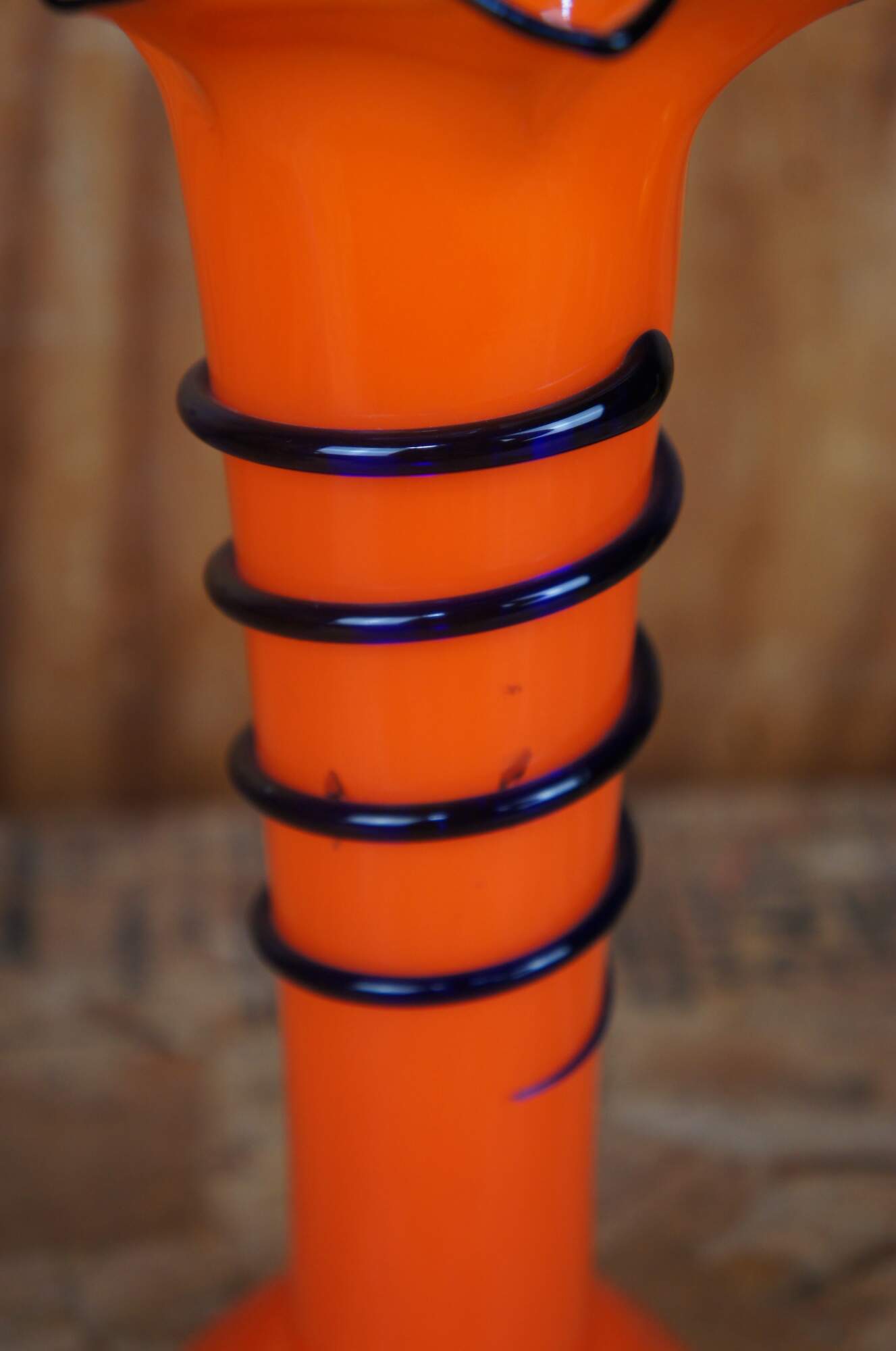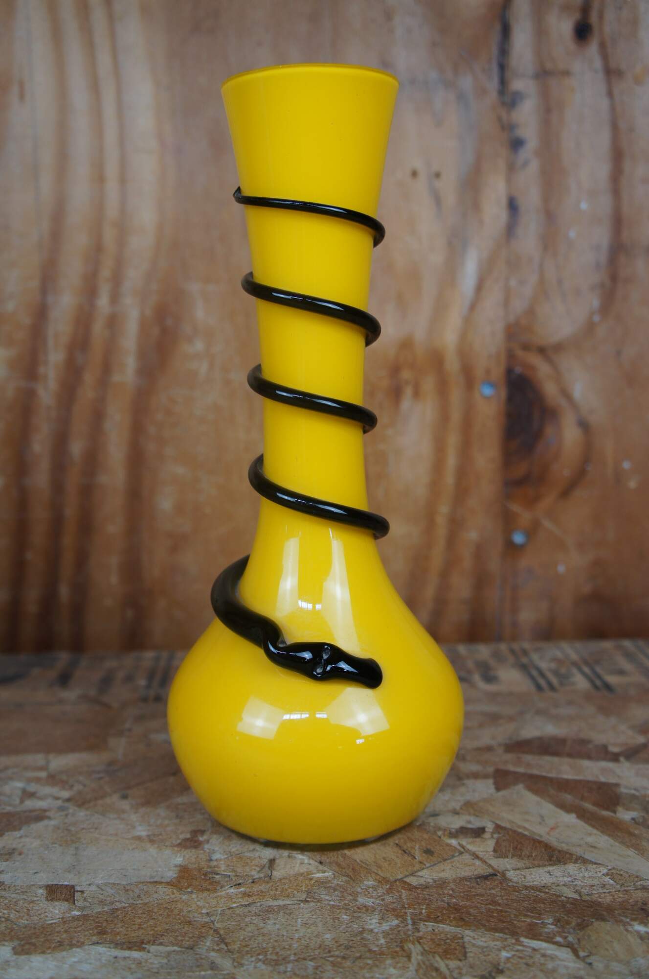 Five vintage Bohemian Czechoslovakian art glass bud vases featuring swirled / flared / ruffled designs with vibrant colors and black accents.