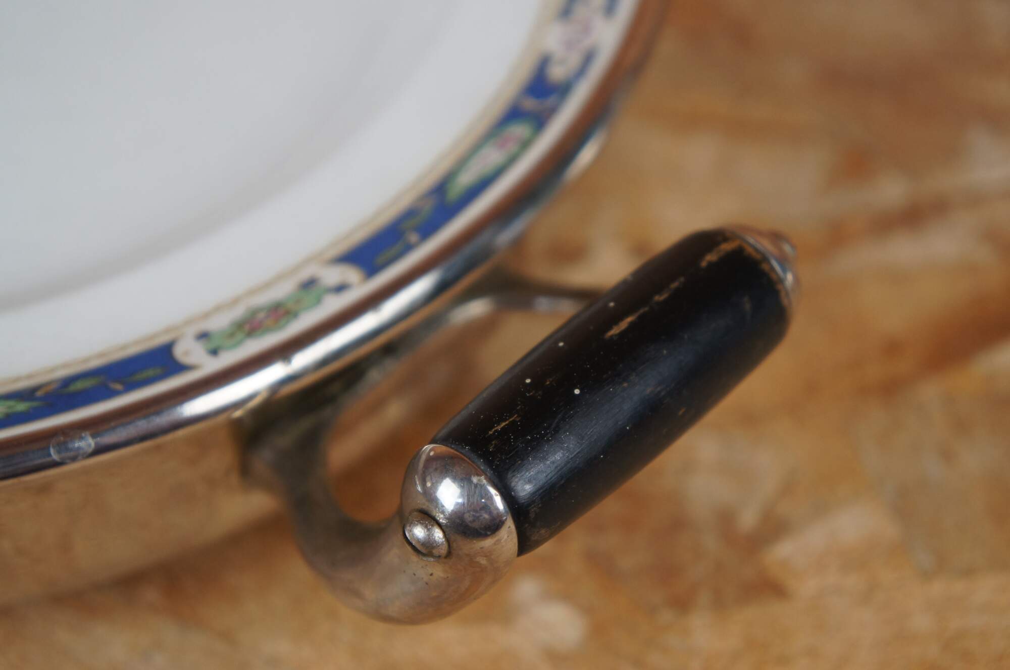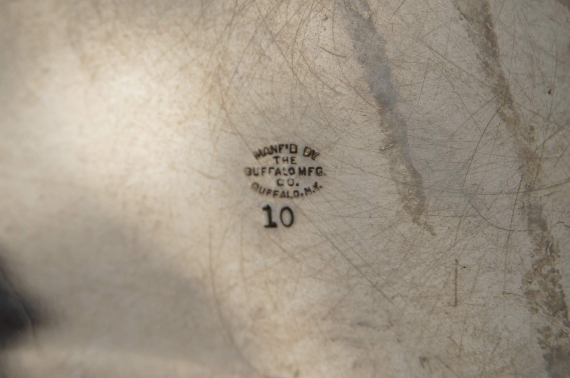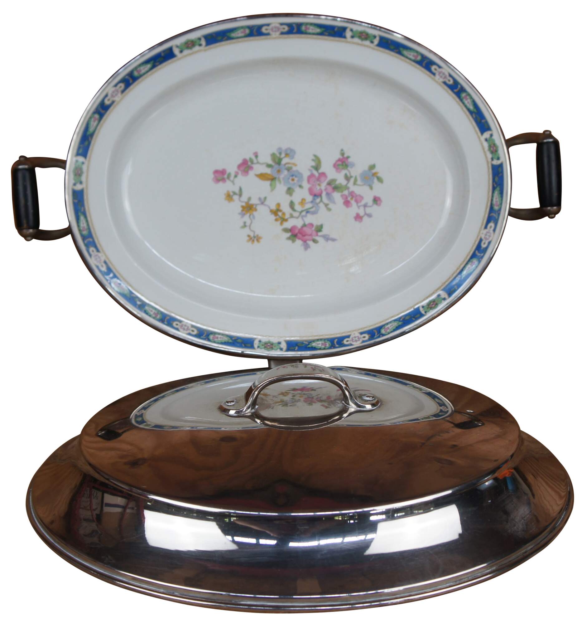 Antique silver plate covered warming platter / chafing dish featuring floral pattern made by Buffalo Manufacturing Company.