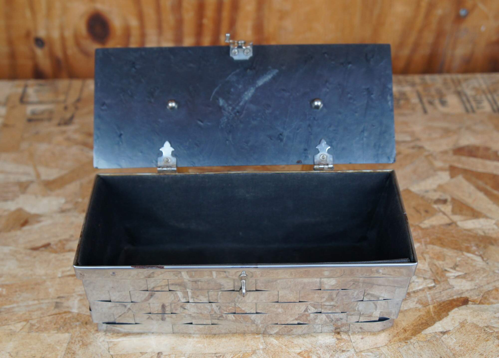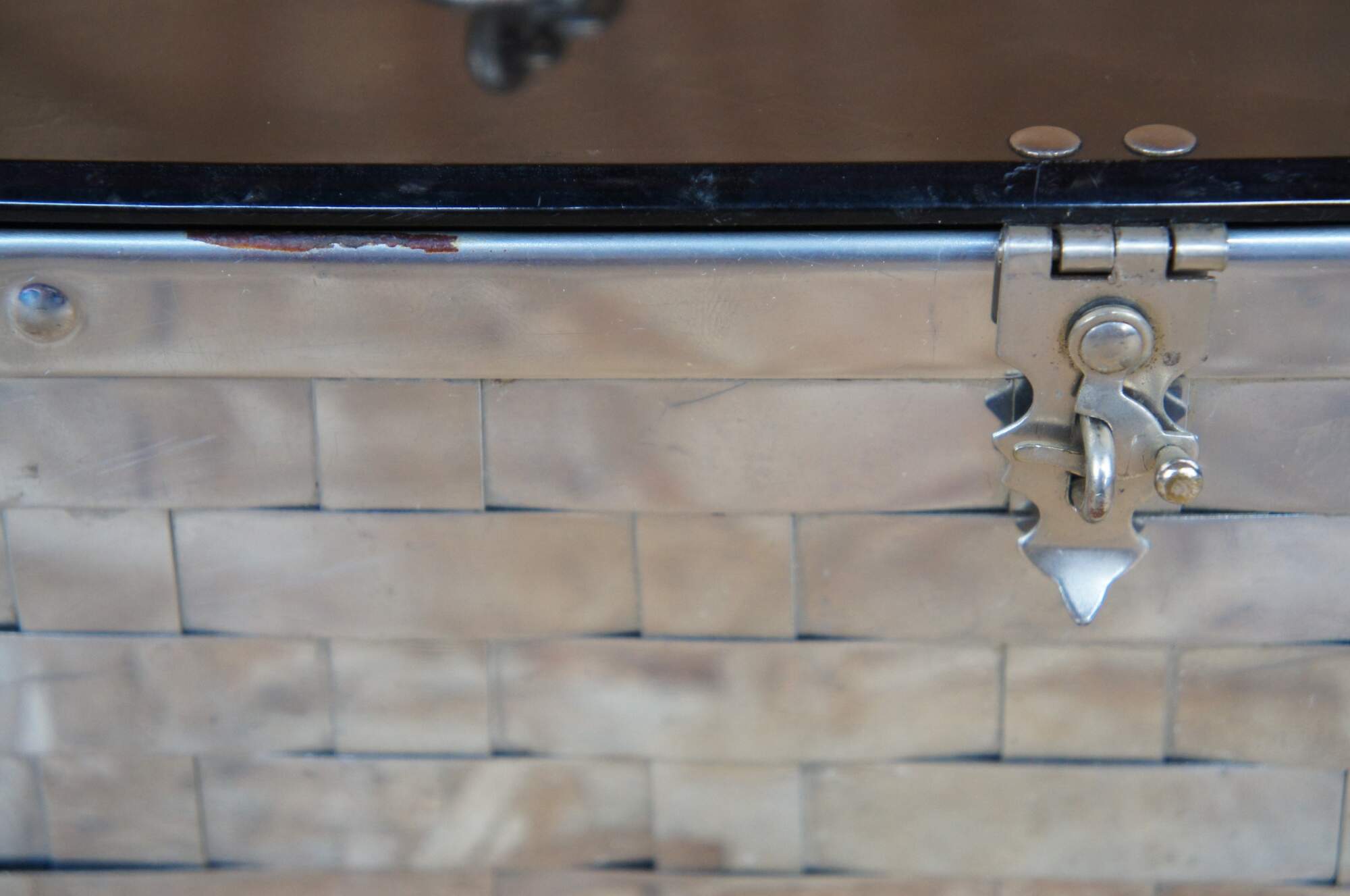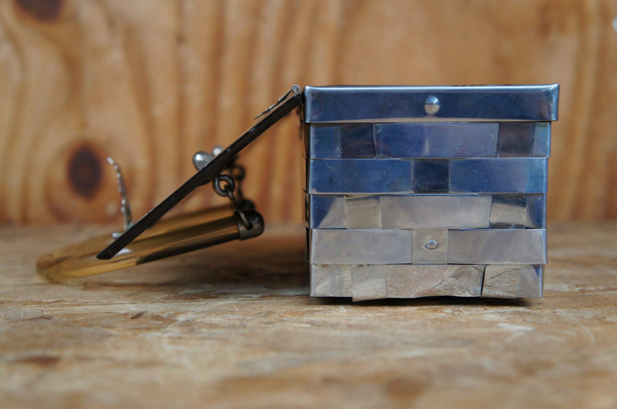 1950s mid century purse basket with bakelite top and clear lucite handle featuring basket woven metal bands and fabric lining.