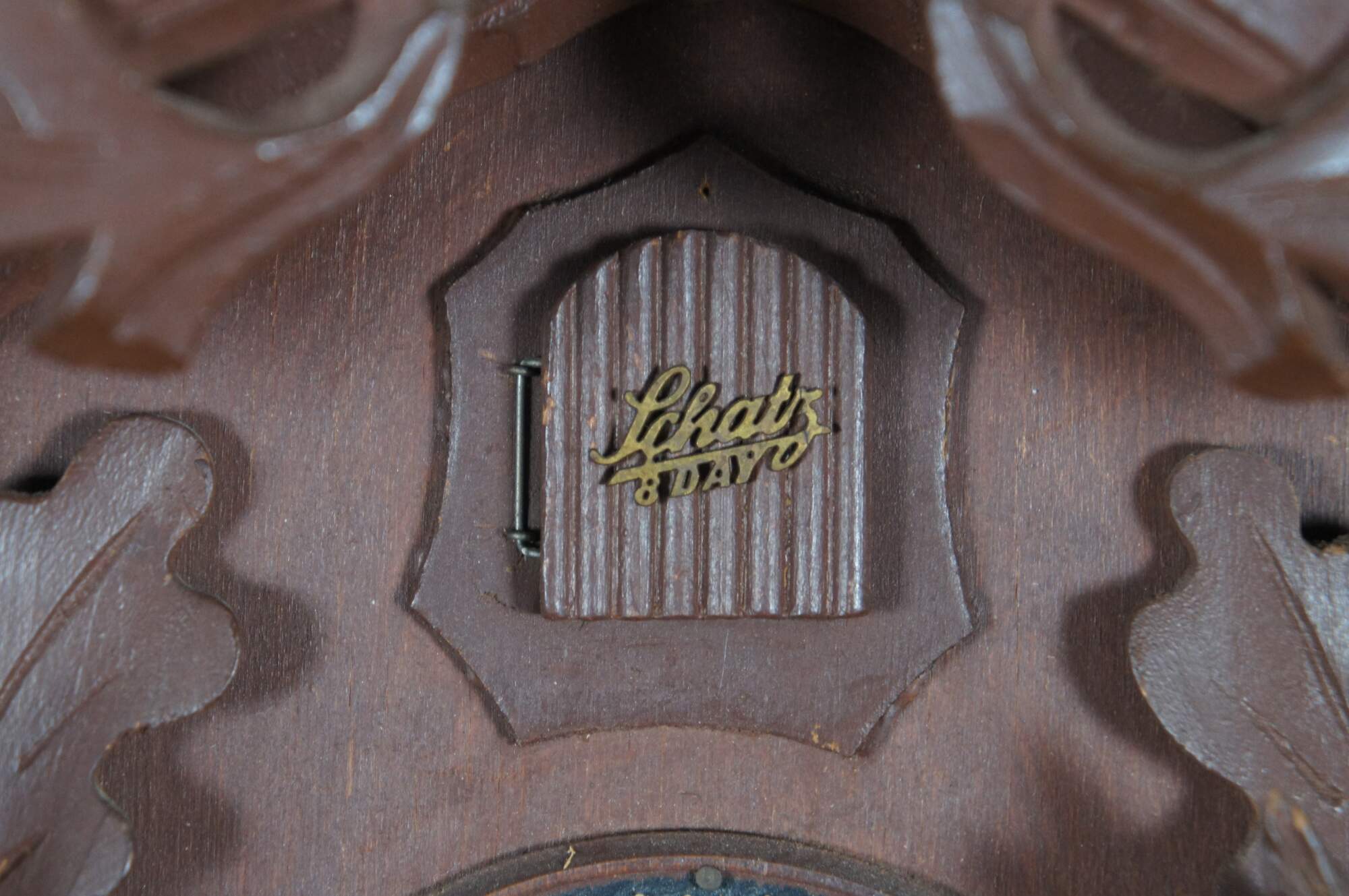 Antique German Schatz & Sohne Black Forest eight day cuckoo clock. Features hunt / game / taxidermy theme with carved deer / stag , rabbit, bird and mantel with gun and tote. Cast iron acorn weights.