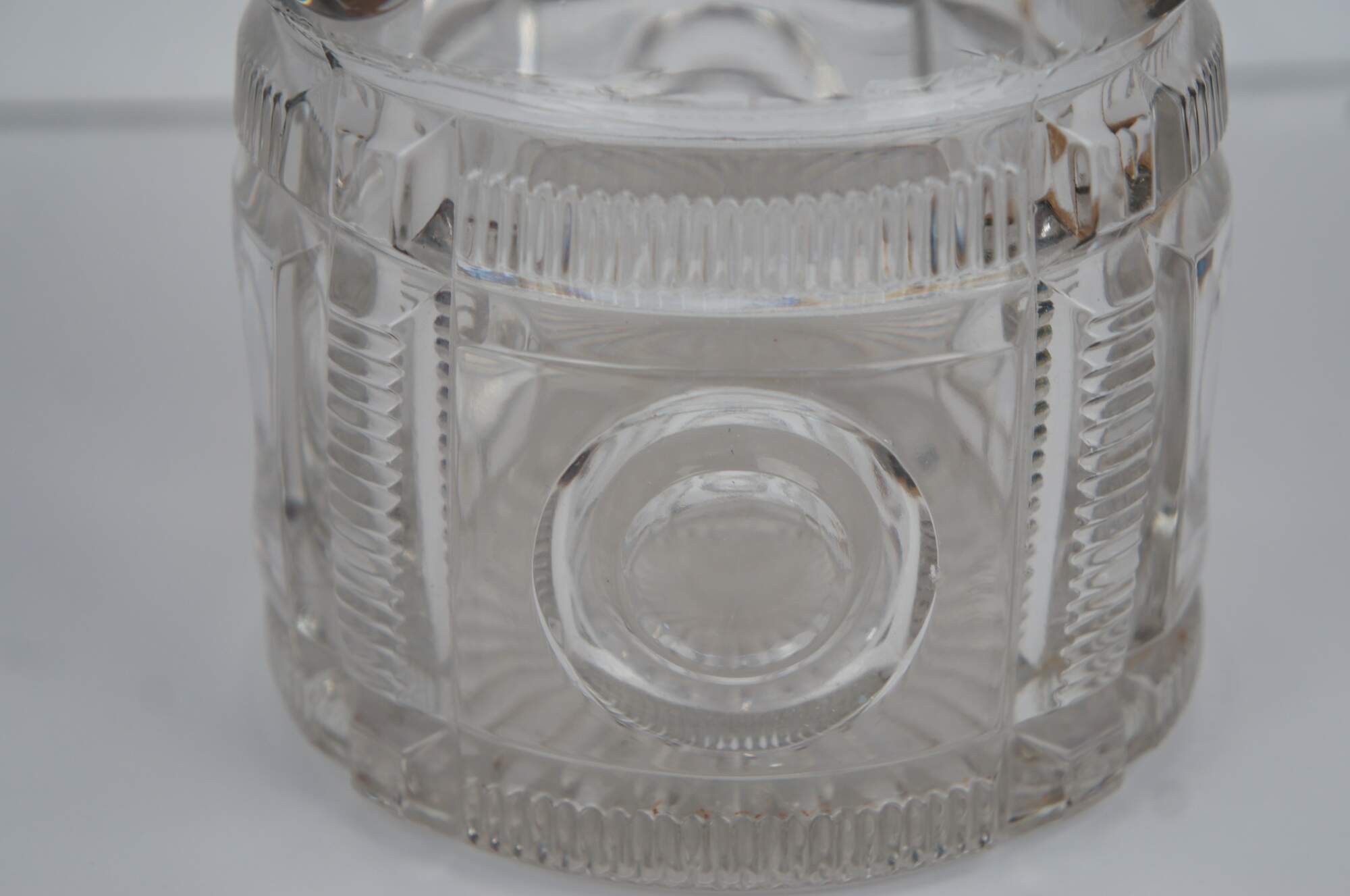 Antique pressed glass pitcher featuring smooth tapered upper and handle with geometric art deco base.