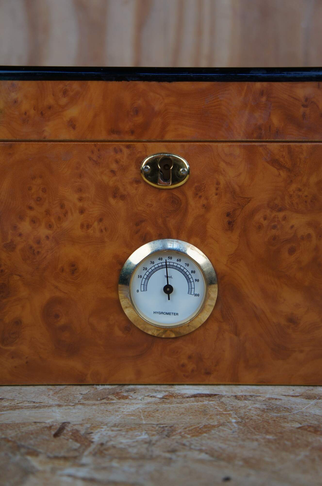 Vintage desktop birdseye maple cedar lined humidor with exterior hygrometer and extra cutters / guillotines.