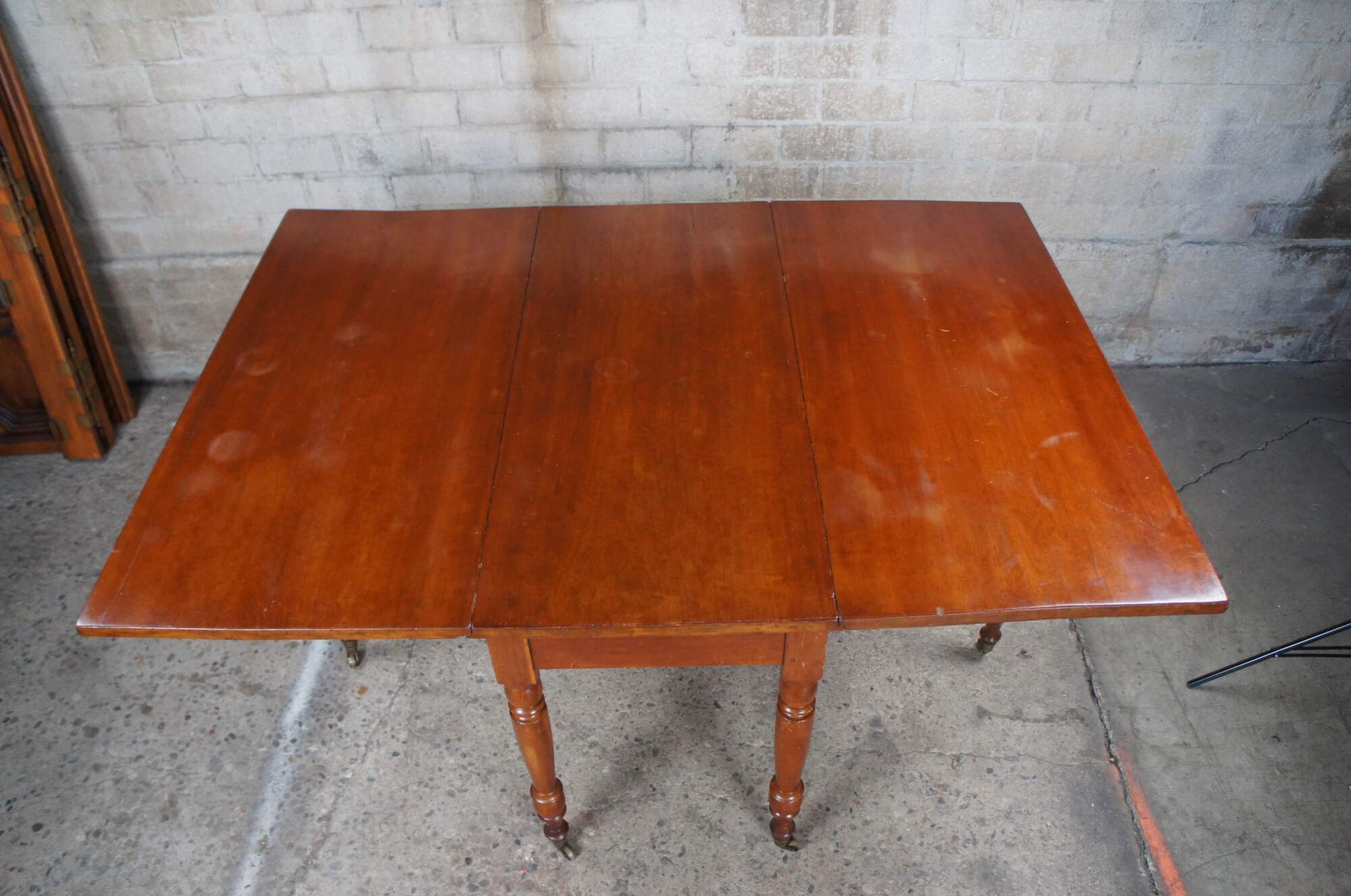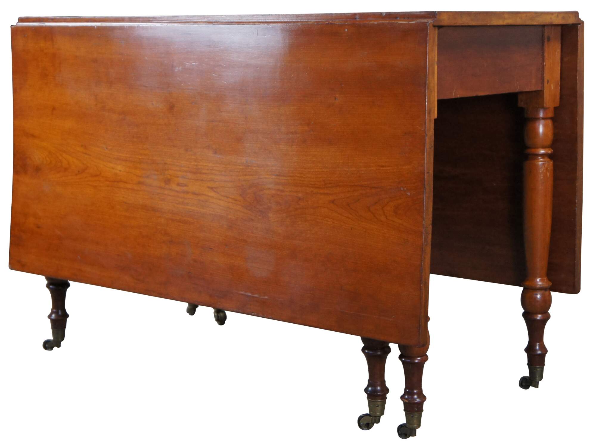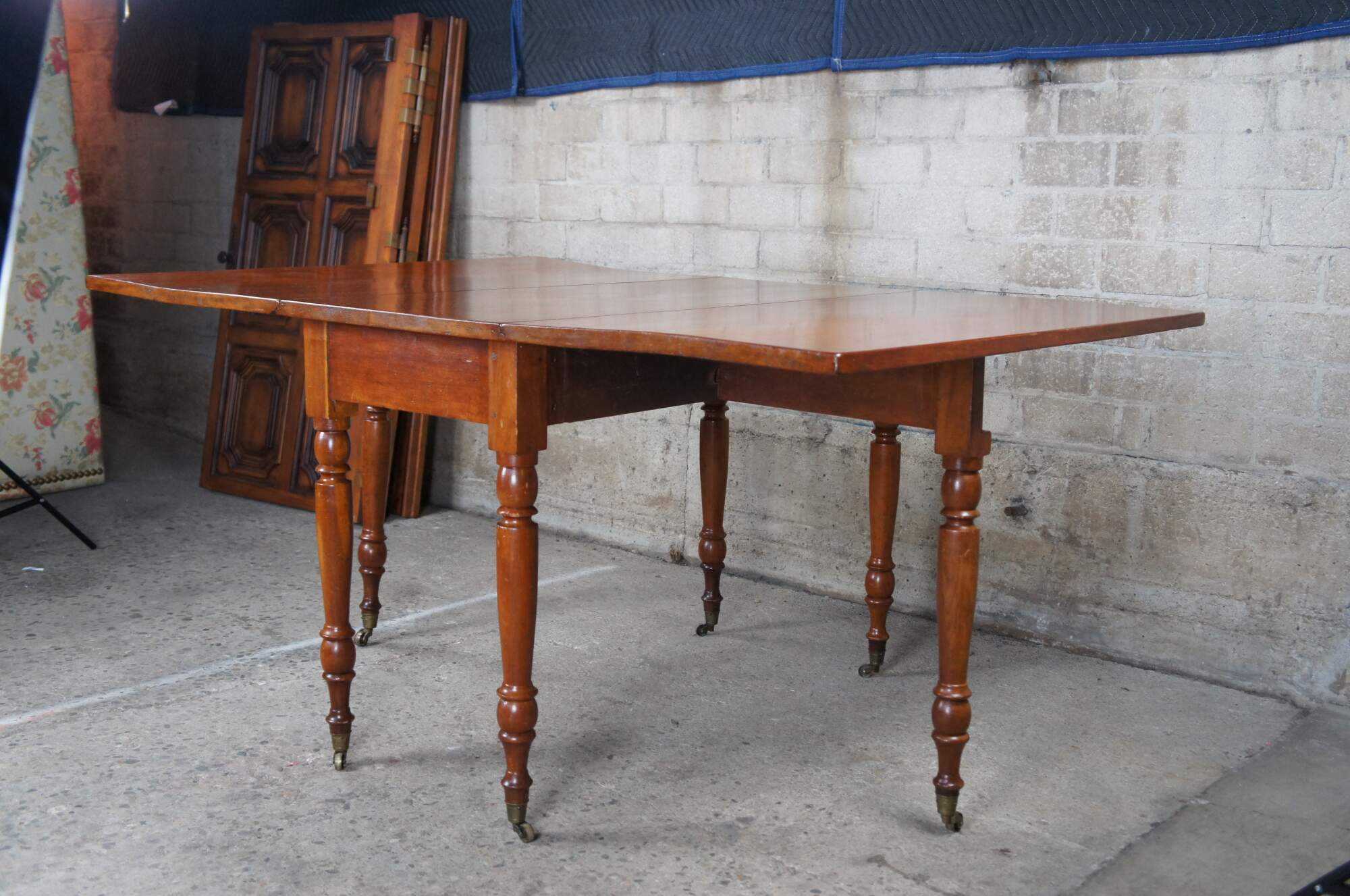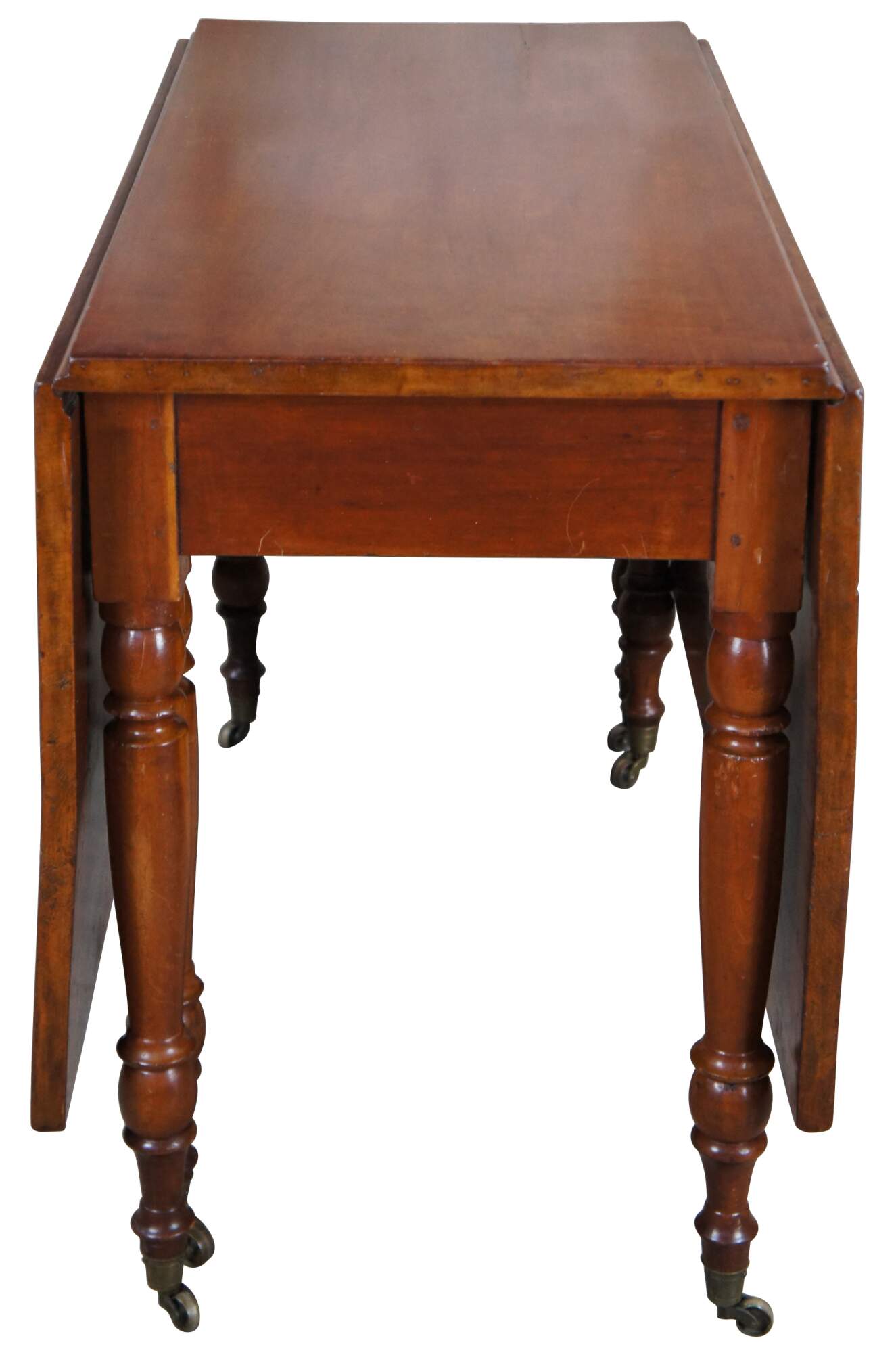 American antique 19th century dining or console table. Made from solid cherry with long drop leaves and tuned legs leading to brass casters.