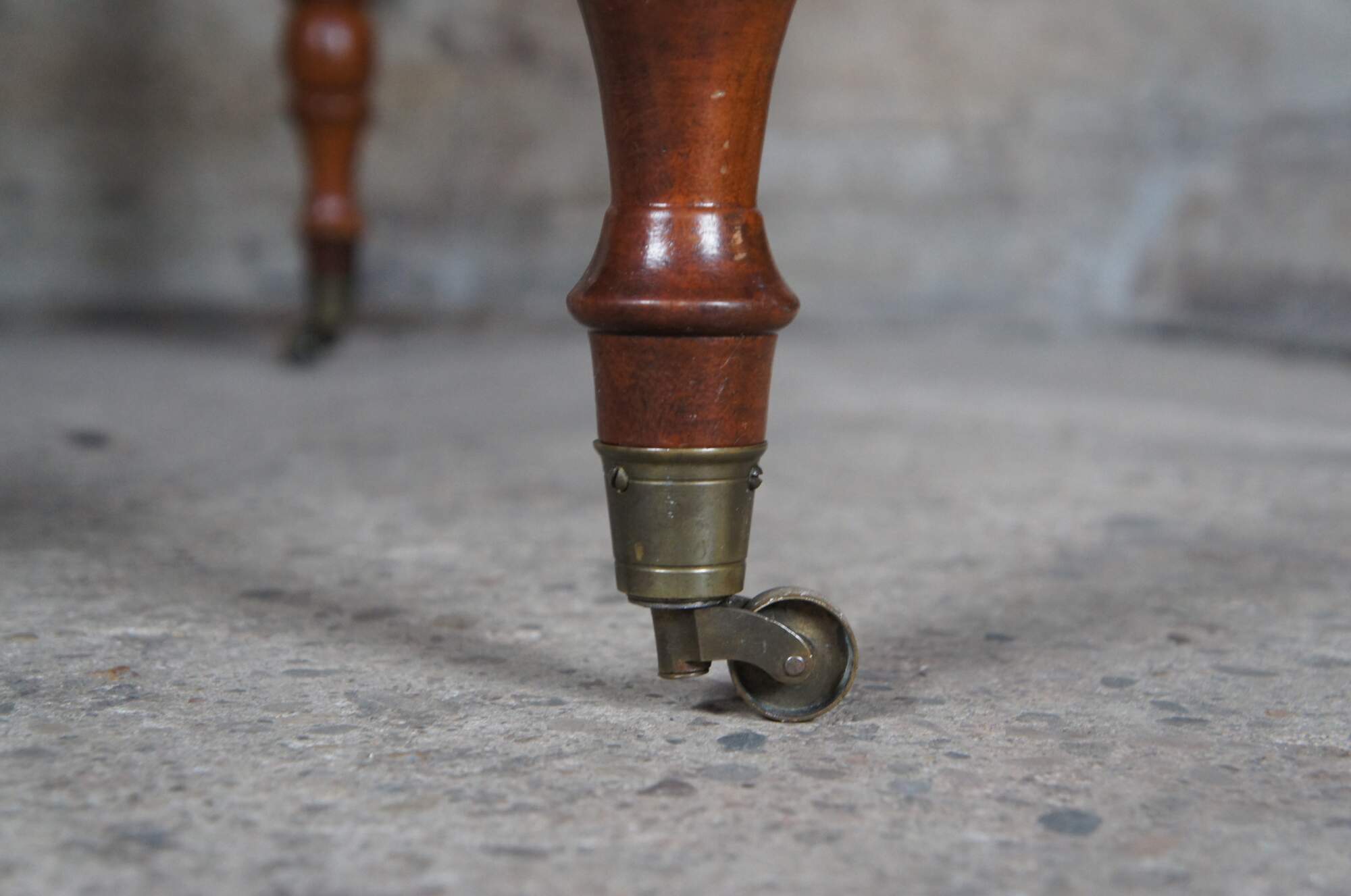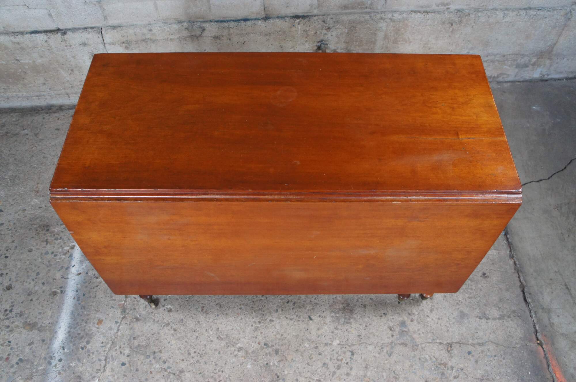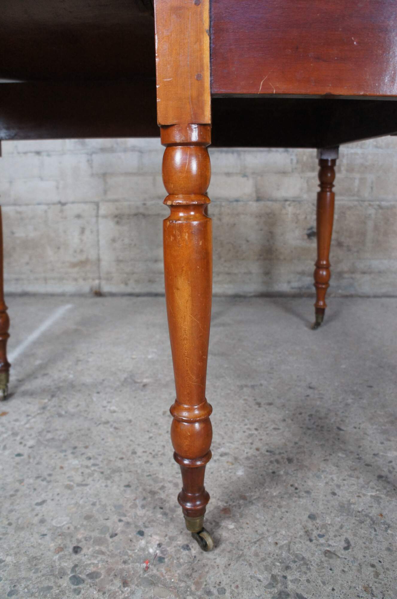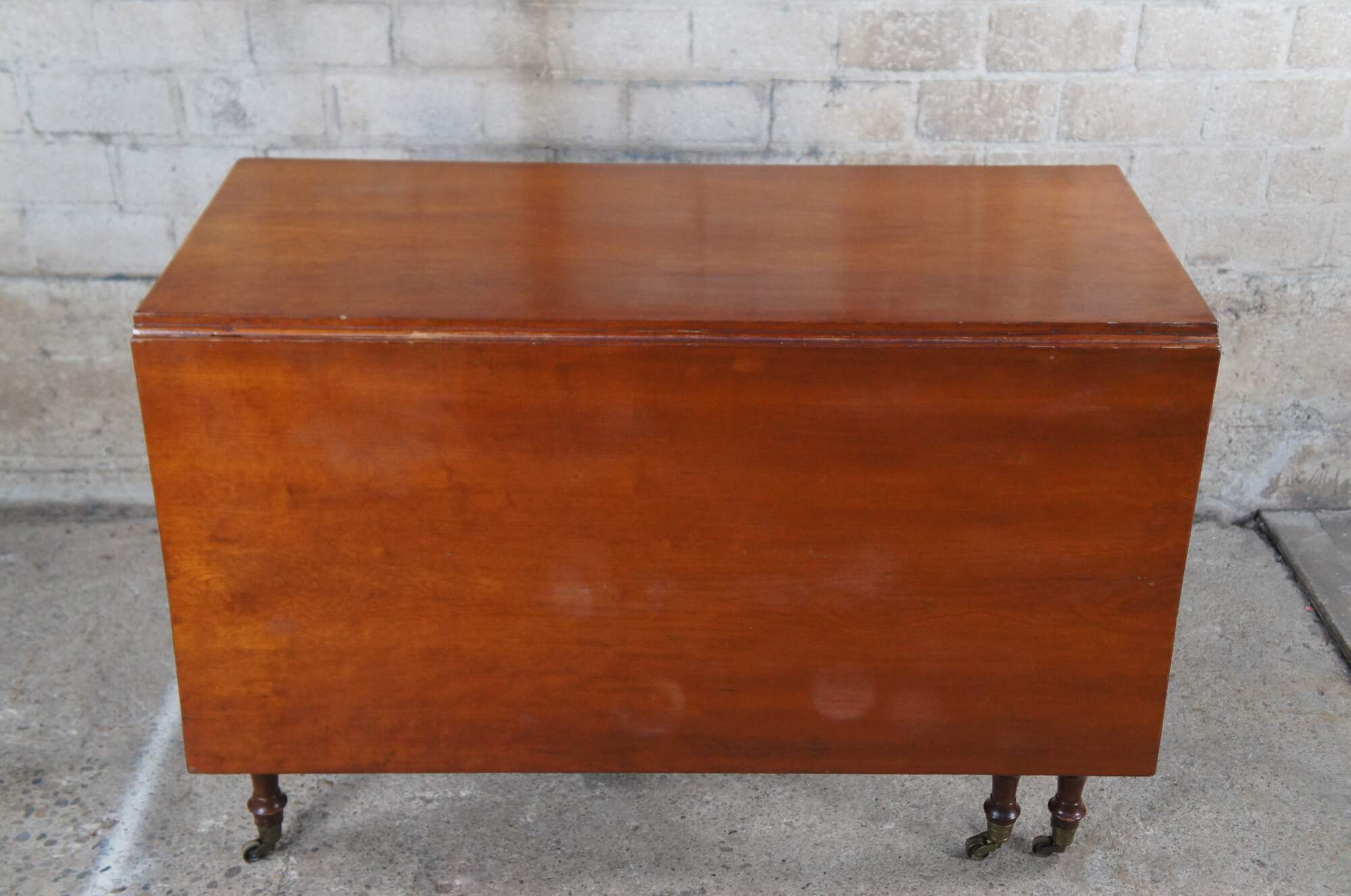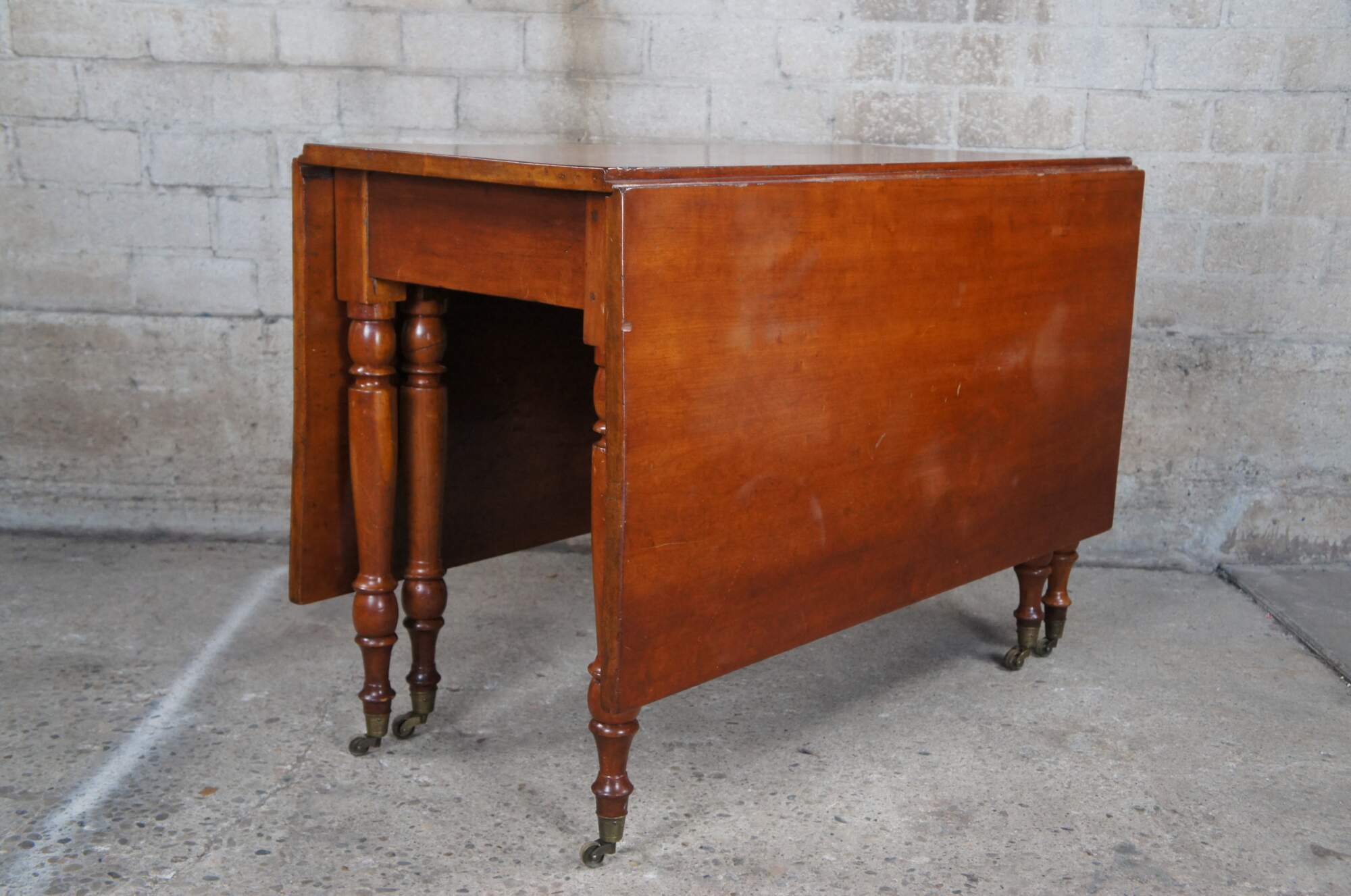 American antique 19th century dining or console table. Made from solid cherry with long drop leaves and tuned legs leading to brass casters.
