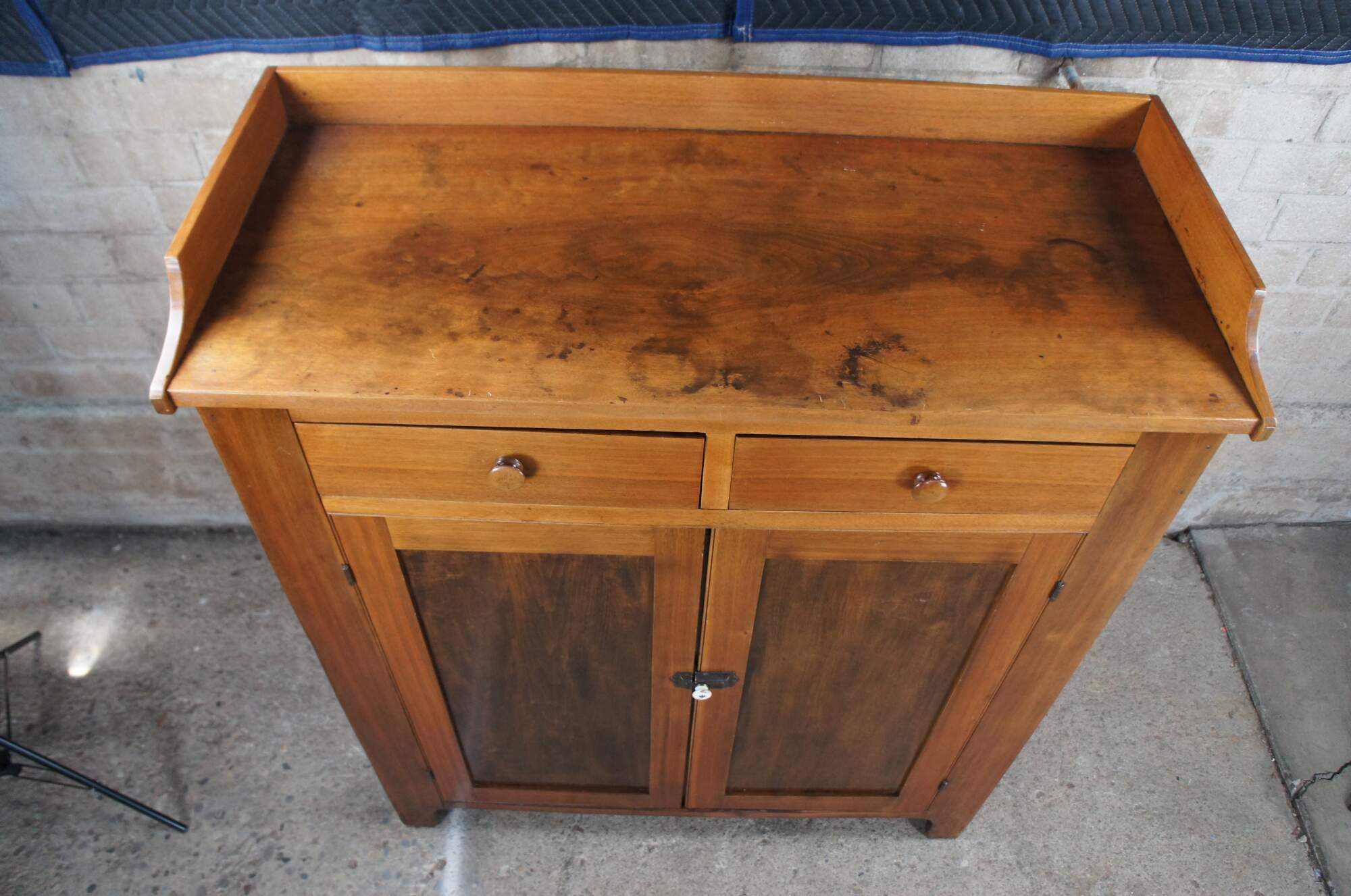 A warming handmade Mid 19th Century Early American Jelly Cabinet or Pantry Cupboard. A rectangular form made from American Walnut with an upper surface enclosed by a backsplash over two hand dovetailed drawers and lower cupboard with two shelves. Lower section latches via wooden catch and metal bracket with a porcelain knob.