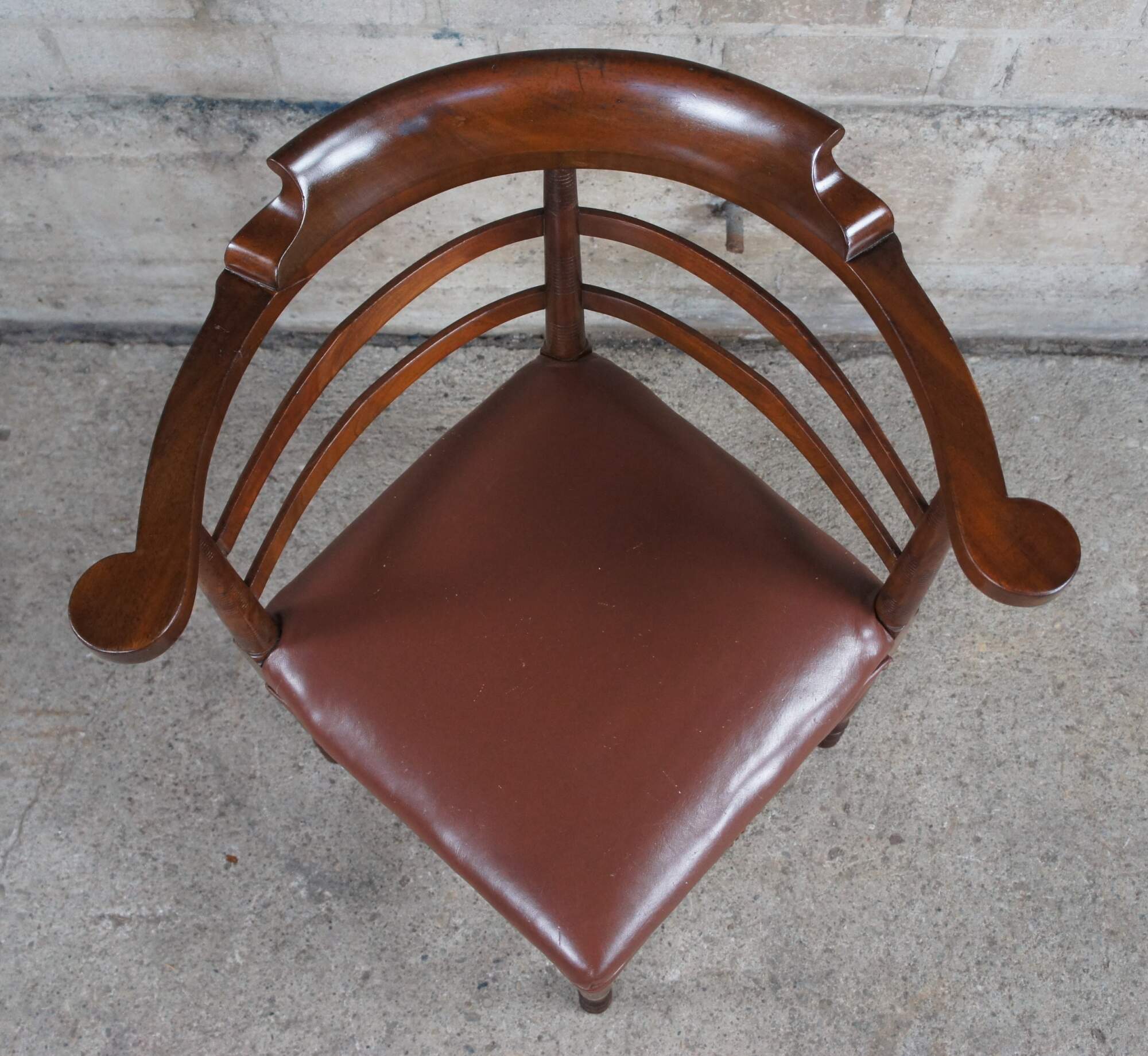 Antique English Country roundabout corner armchair. Made of mahogany featuring rounded form with ladderback supports over turned posts and supports, vinyl seat and nailhead accents,