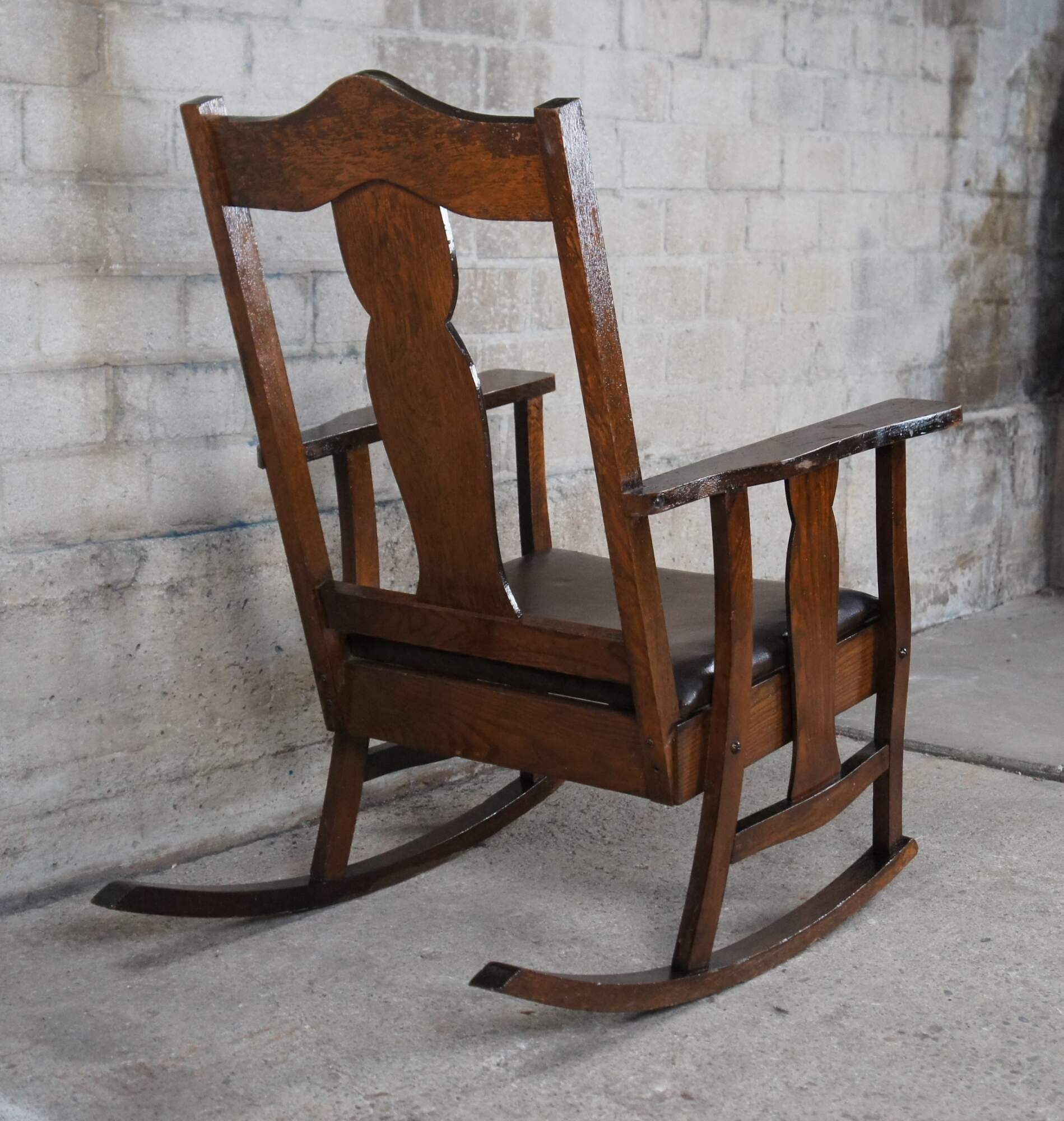 Early 1900s oak rocking chair. Made from oak with vase shaped splat and leather seat.