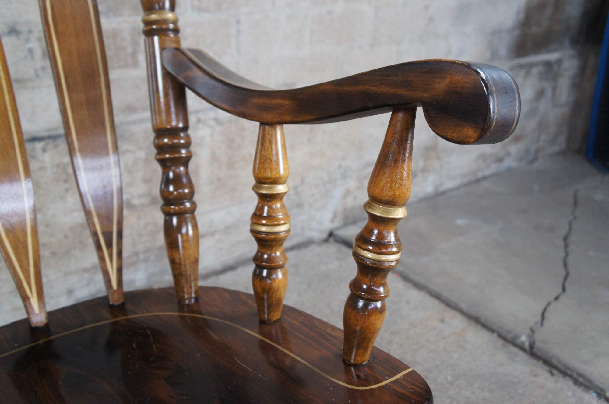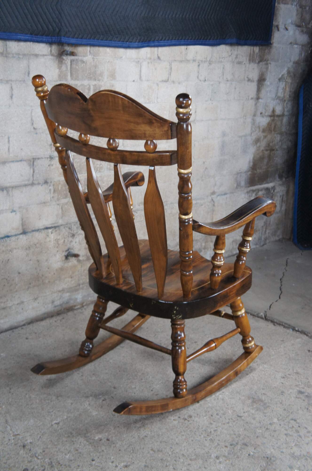 Virginia House Tavern Pine Rocking Chair, circa 1970s. A robust chair with thick saddle seat, stencilled back, gold trim and arrow splats.