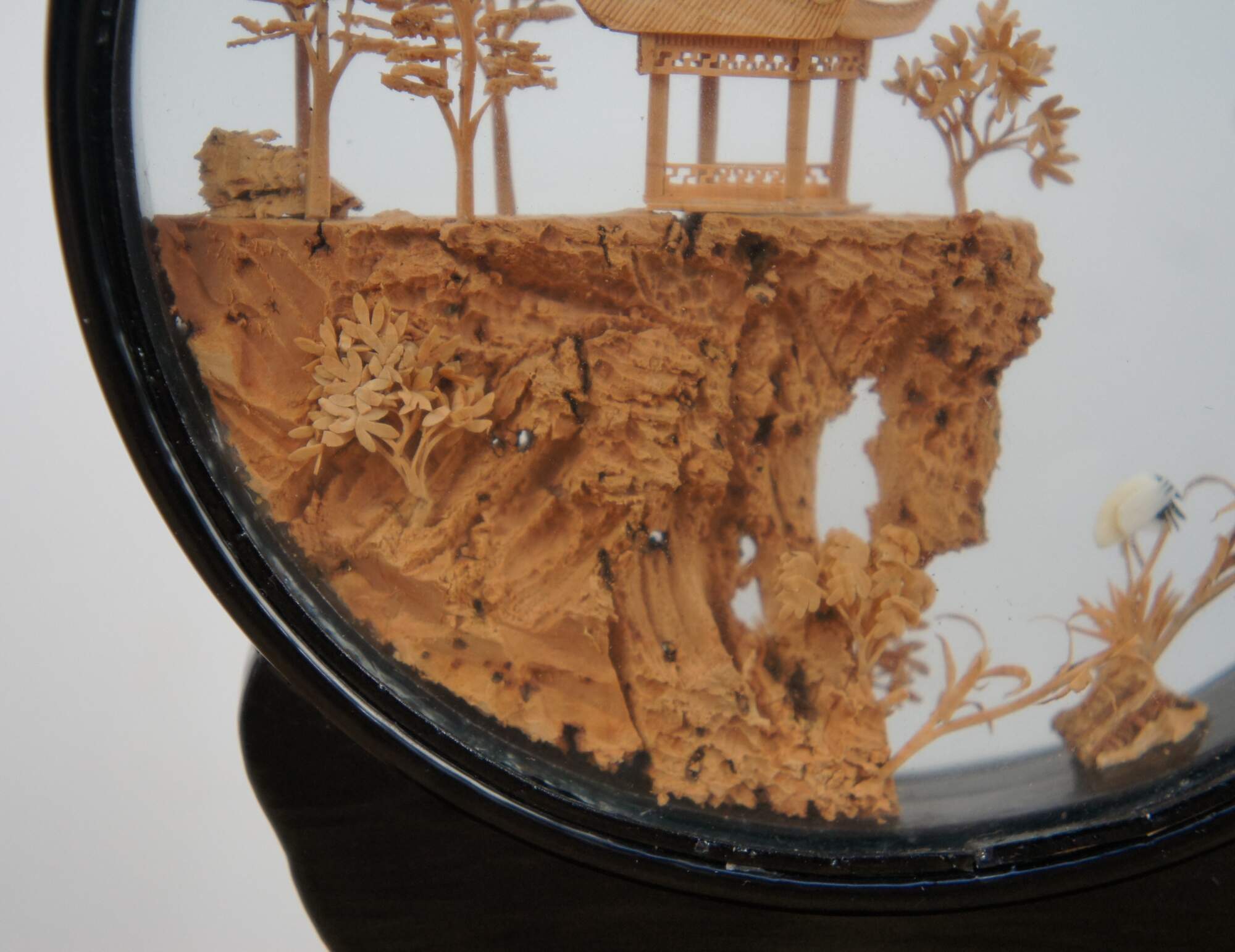 Two vintage Japanese carved cork diorama folk art shadow box displays depicting landscape scenes that feature a bridge, cranes and pagodas or Temples. Each lacquered box sits on a stand, one is circular and one hexagonal.