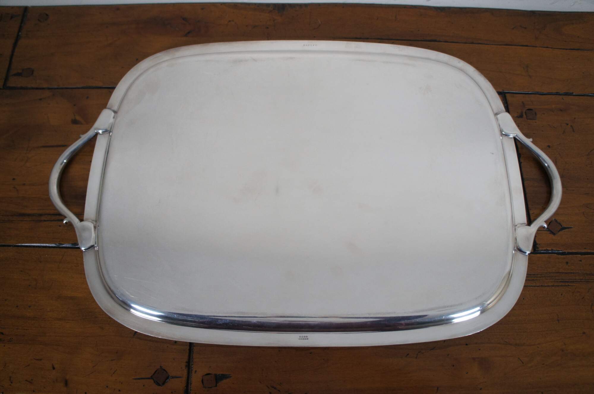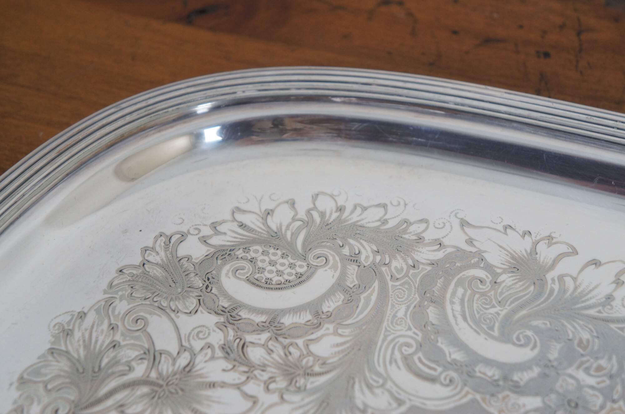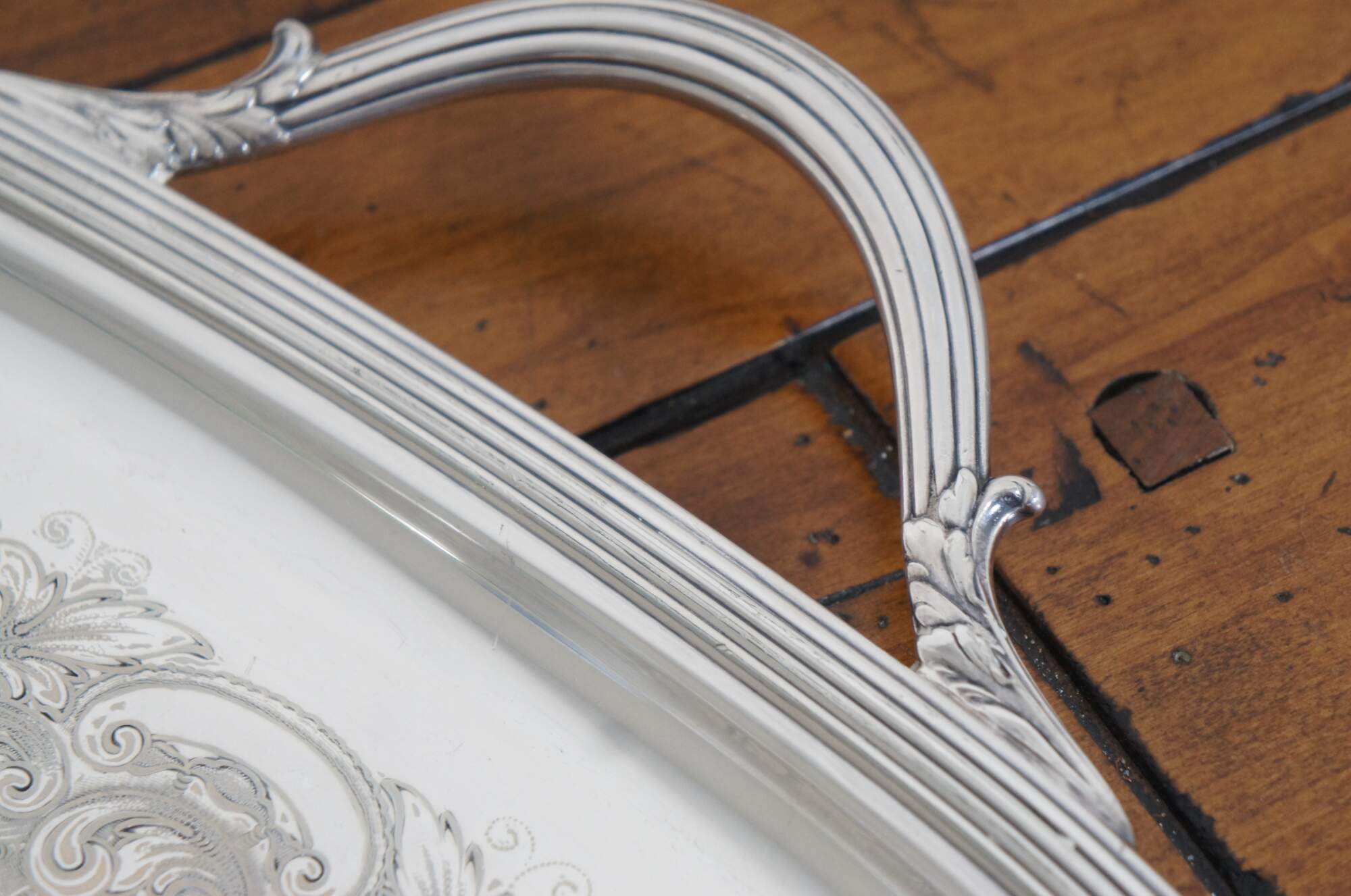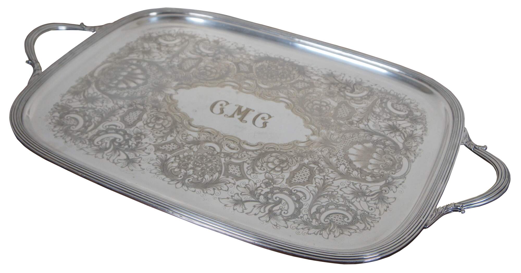 Early 20th century silver plate rounded rectangular serving tray number 8621/9 by E.G. Webster & Son, with a fluted art nouveau border and handles accented with leaves, surface etched with scallops and flowers, engraved with the initials CMC.