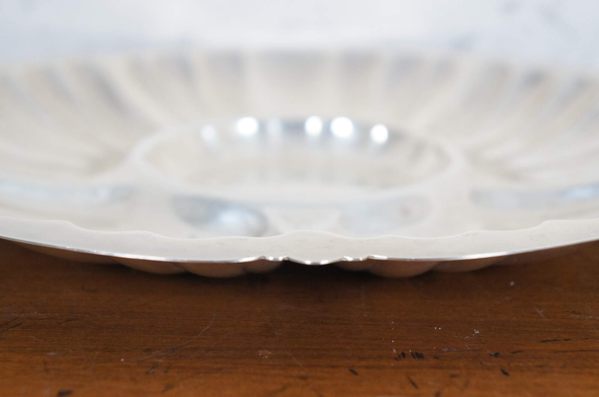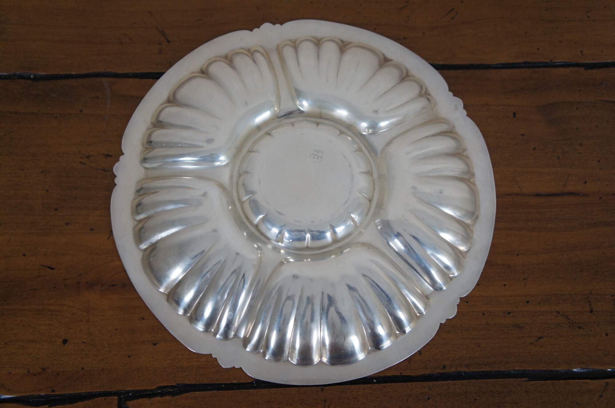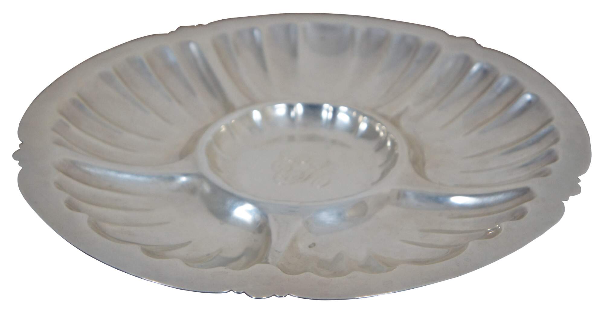 Vintage Frank M. Whiting number C607 six sectioned / divided shrimp, appetiser, cocktail serving plate or tray with round scallop form and shell design, engraved in the center with the initials CMC. “North Attleboro, MA - Origin as Holbrook Whiting & Albee in the 1870s. The firm was changed to F.M. Whiting & Co (1878), F.M. Whiting (1891), F.M. Whiting Co (1895) and Frank M. Whiting & Co (1896). From 1940 became a division of Ellmore Silver Co and went out of business 1960 c.