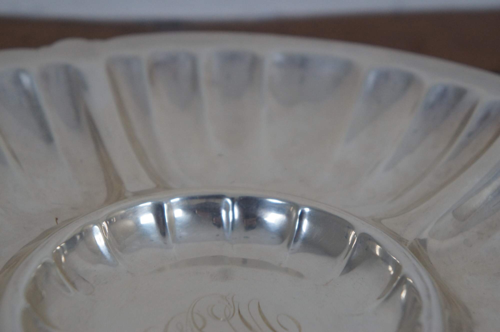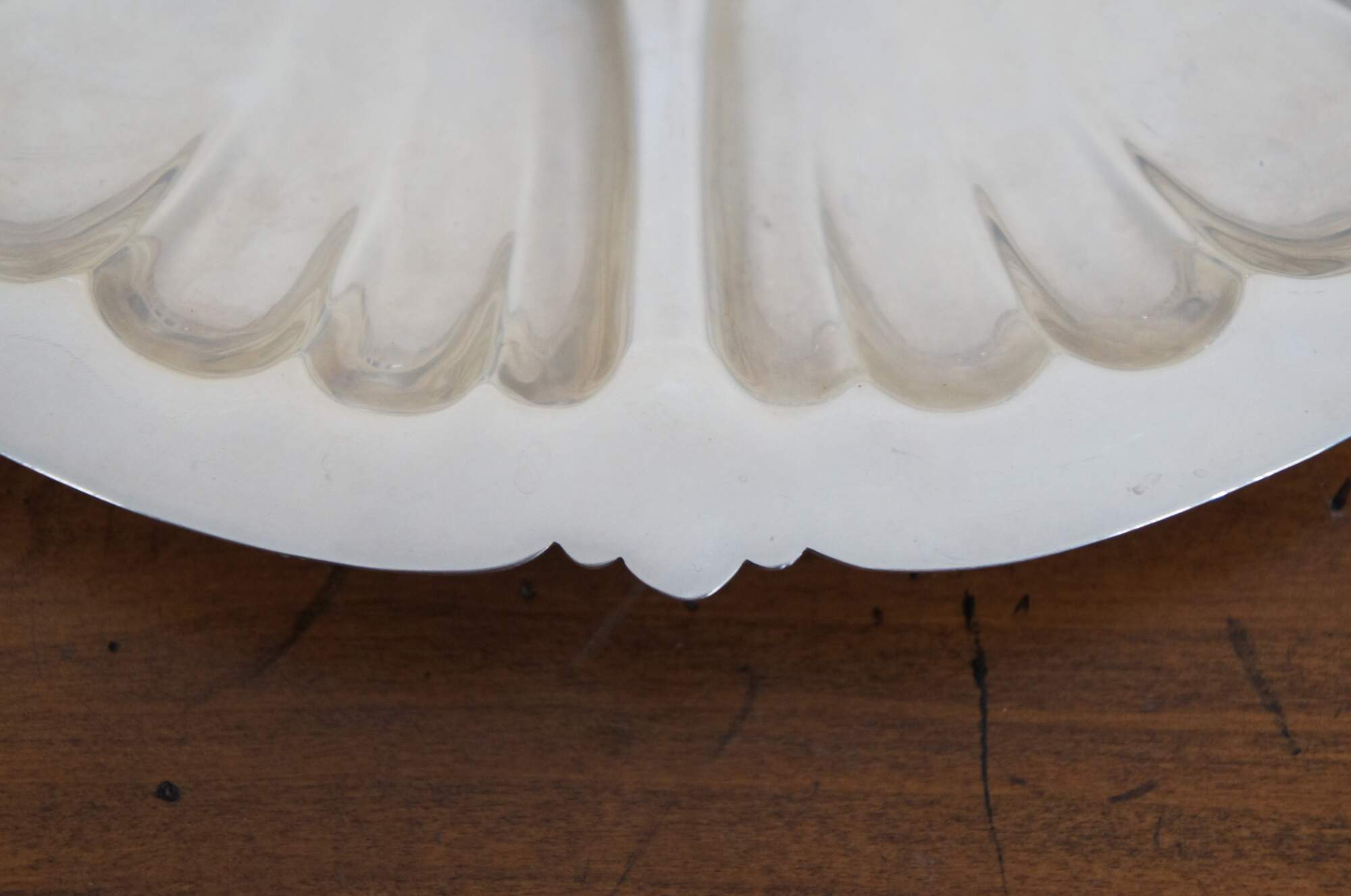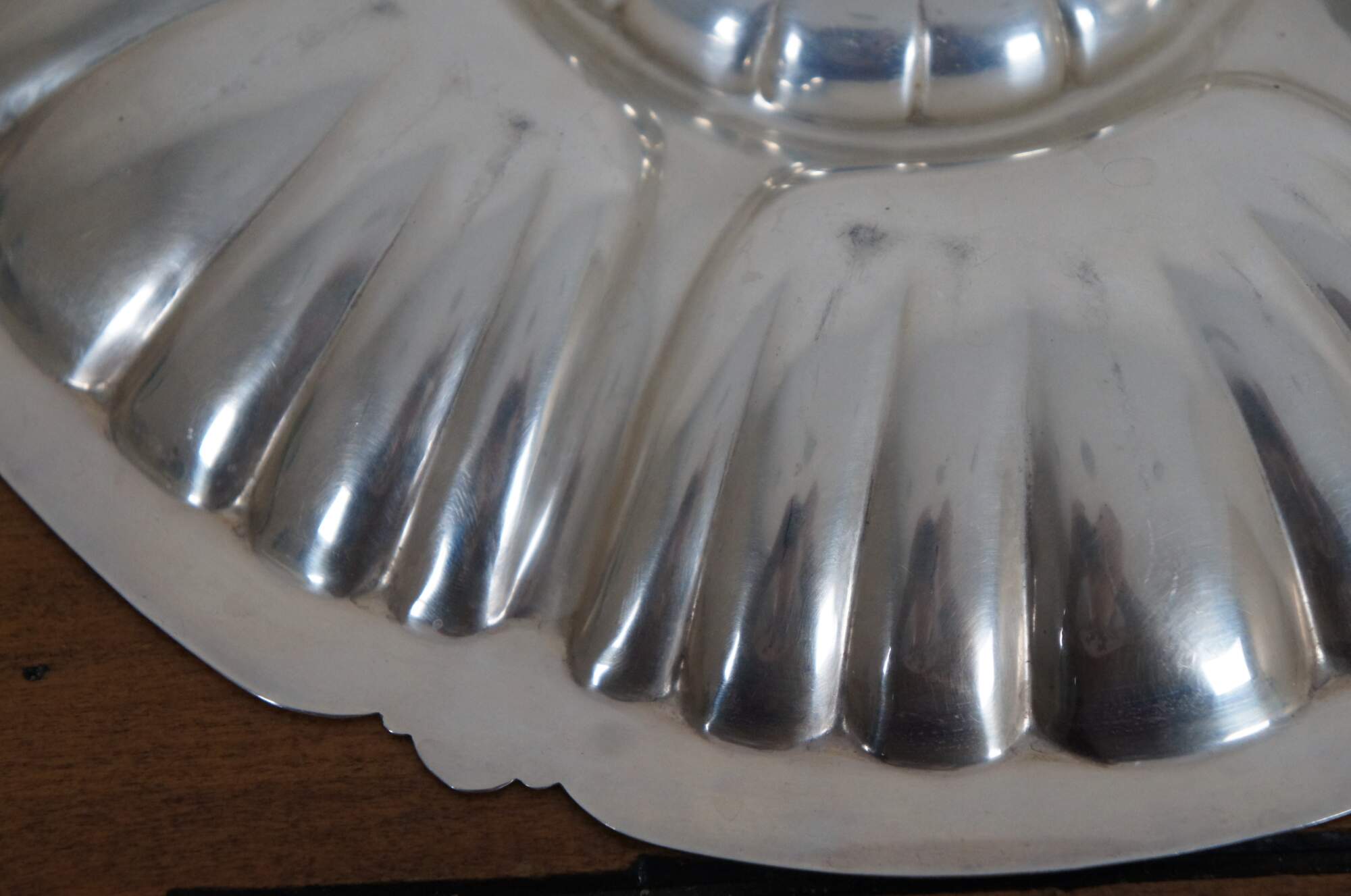 Vintage Frank M. Whiting number C607 six sectioned / divided shrimp, appetiser, cocktail serving plate or tray with round scallop form and shell design, engraved in the center with the initials CMC. “North Attleboro, MA - Origin as Holbrook Whiting & Albee in the 1870s. The firm was changed to F.M. Whiting & Co (1878), F.M. Whiting (1891), F.M. Whiting Co (1895) and Frank M. Whiting & Co (1896). From 1940 became a division of Ellmore Silver Co and went out of business 1960 c.