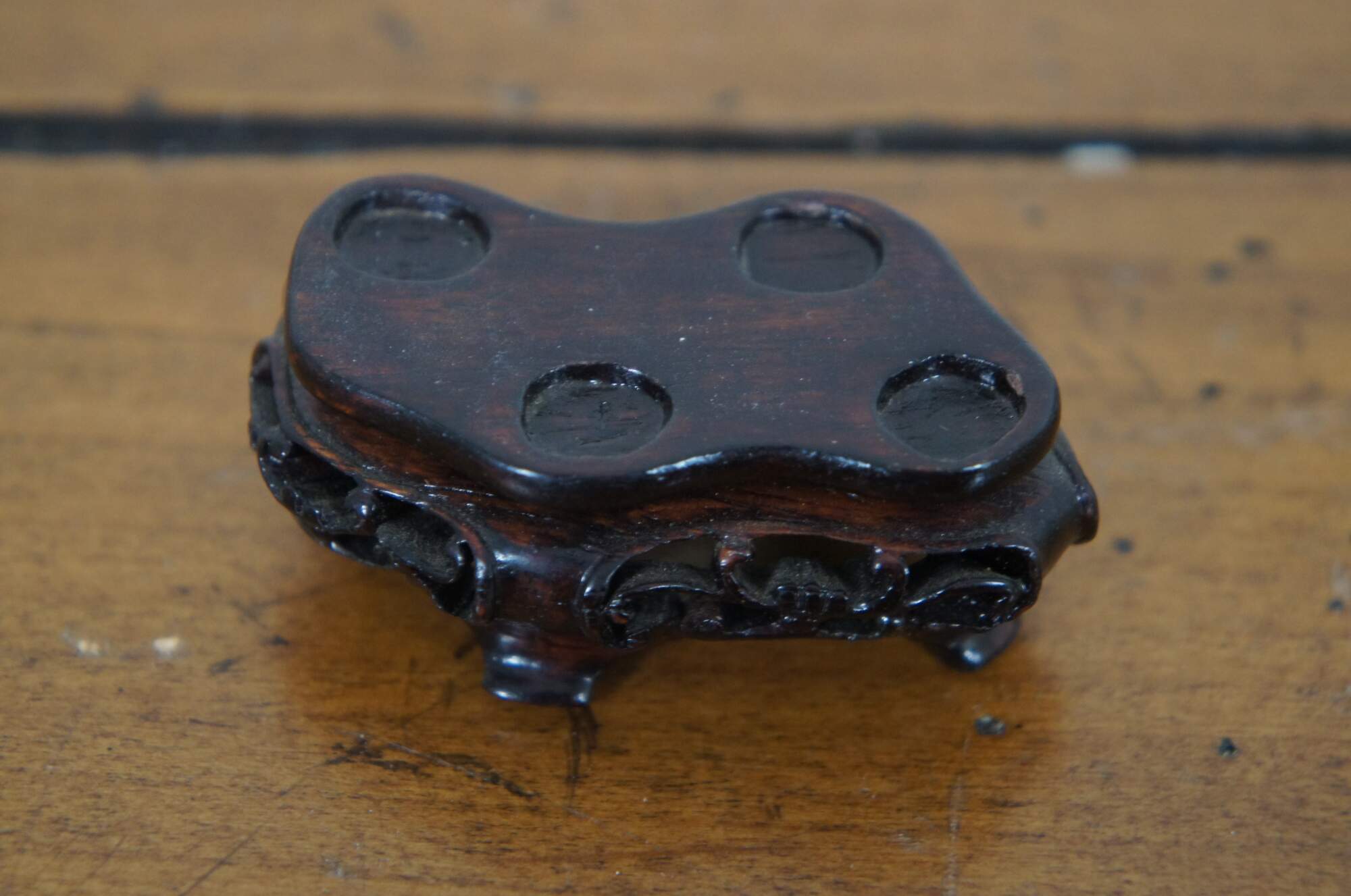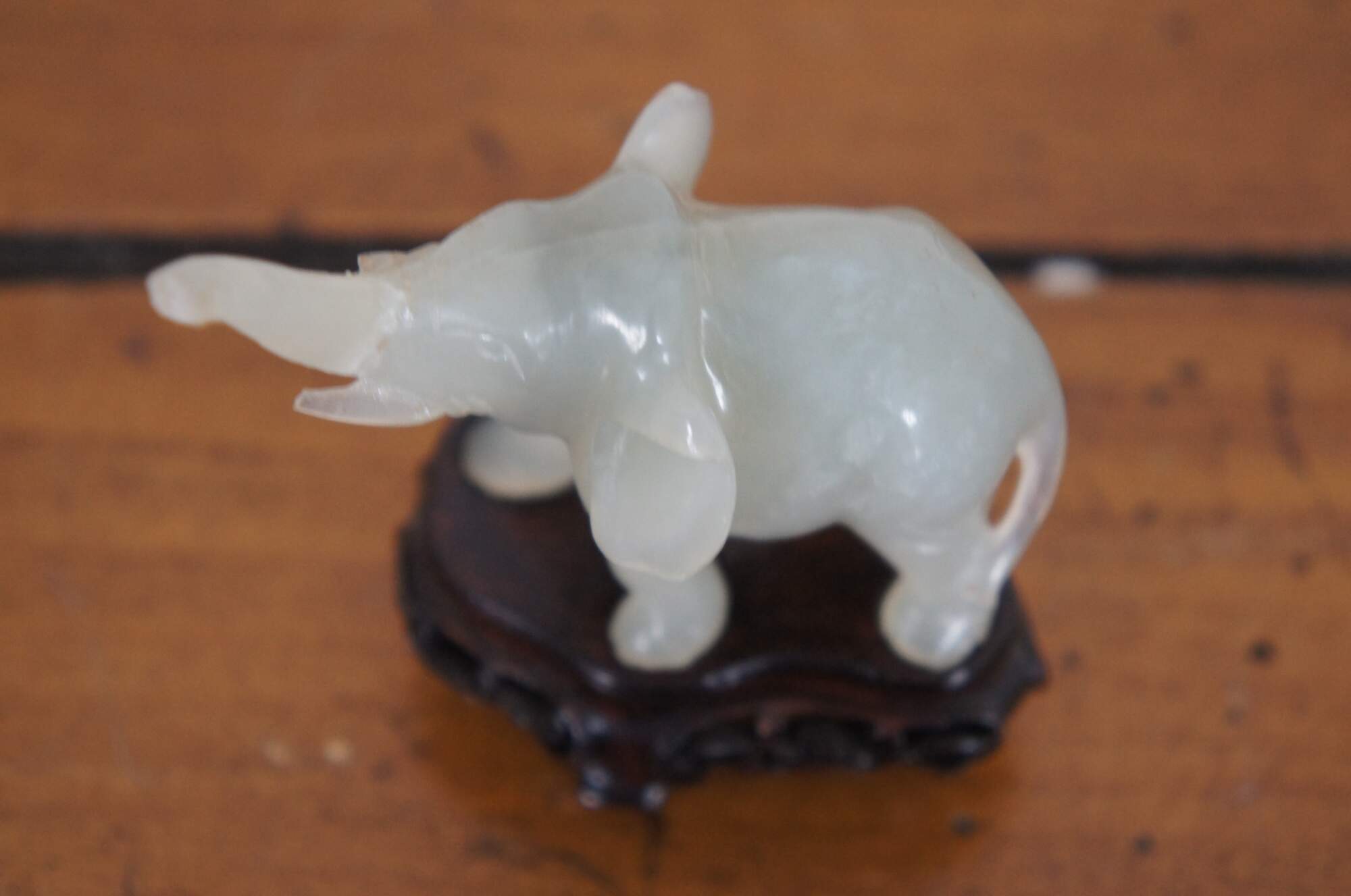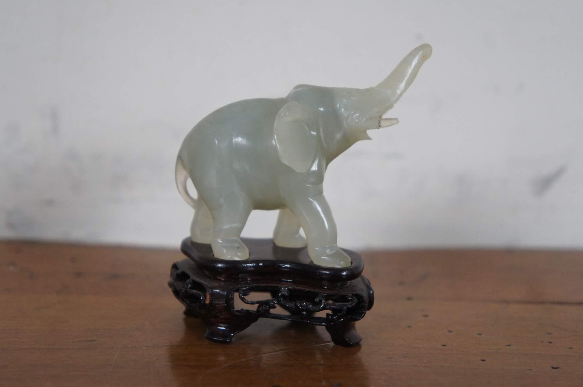 Petite vintage Chinese pale green jade carved elephant figurine with raised trunk and wood stand.