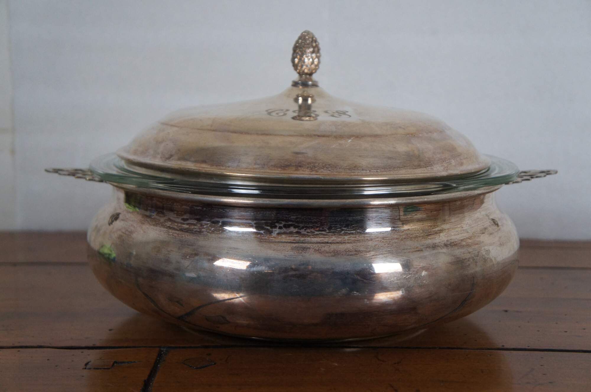 Vintage mid century Sheffield Silver Company round lidded silver plate casserole serving dish with 3 qt Pyrex glass insert. Features pierced handles and pine cone finial. Lid engraved with the initials CCP. “Brooklyn NY Incorporated in 1908. Trademark registered in 1919. Became a division of Reed & Barton Silversmiths in 1974.”