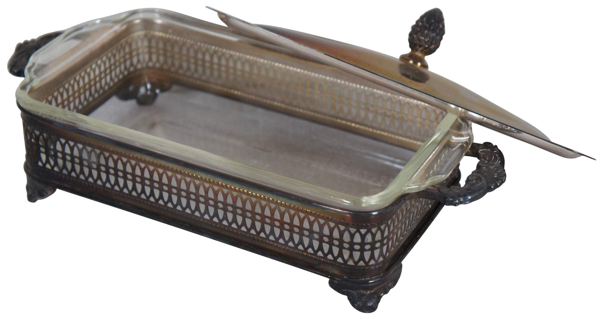 Vintage mid century Sheffield Silver Company rectangular lidded and footed silver plate vegetable serving dish with 1 Qt Fire-King glass insert. Features an open bottom, pierced sides, scalloped handles and pine cone finial. “Brooklyn NY Incorporated in 1908. Trademark registered in 1919. Became a division of Reed & Barton Silversmiths in 1974.”