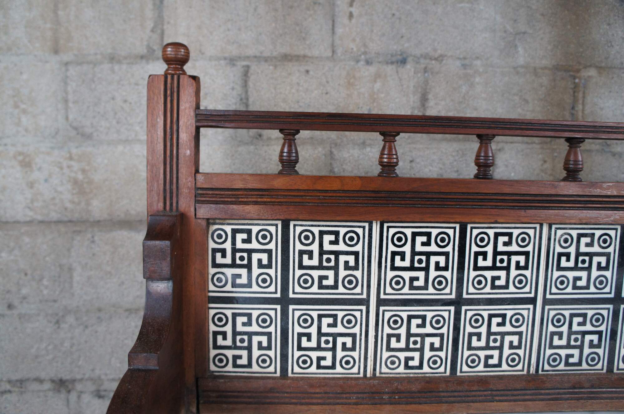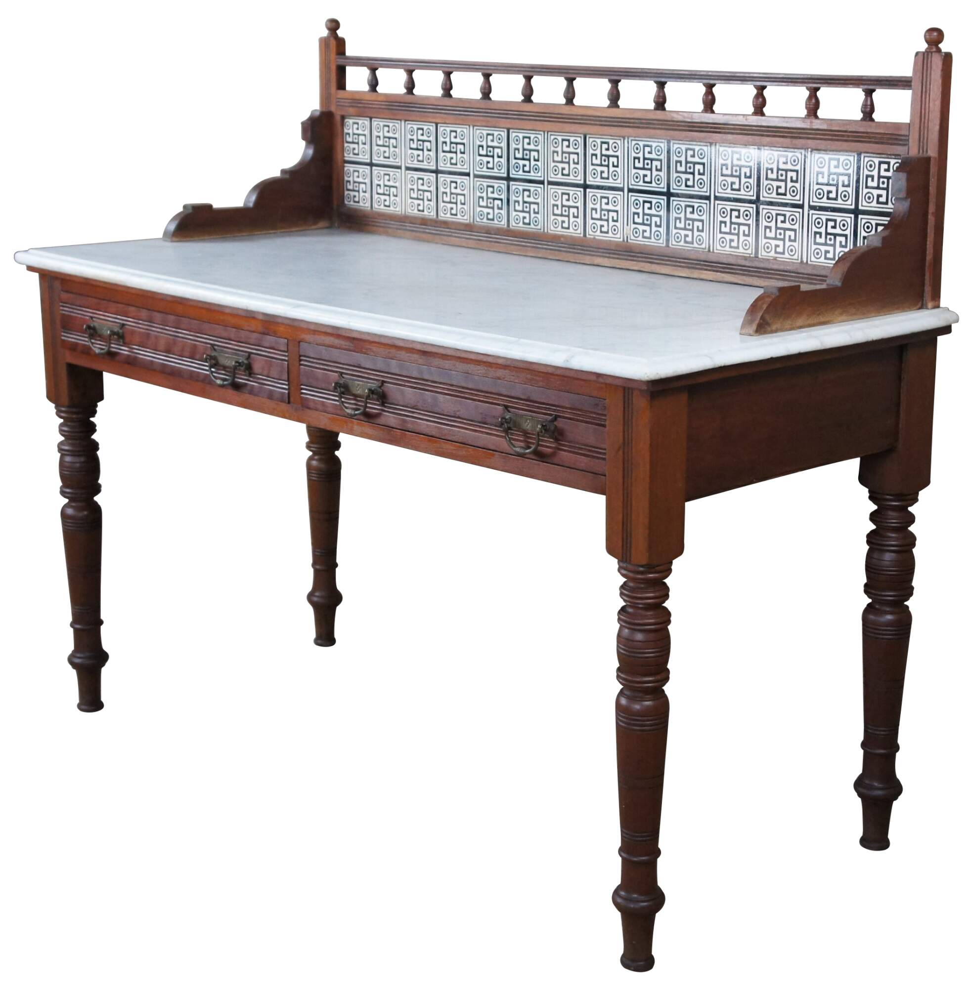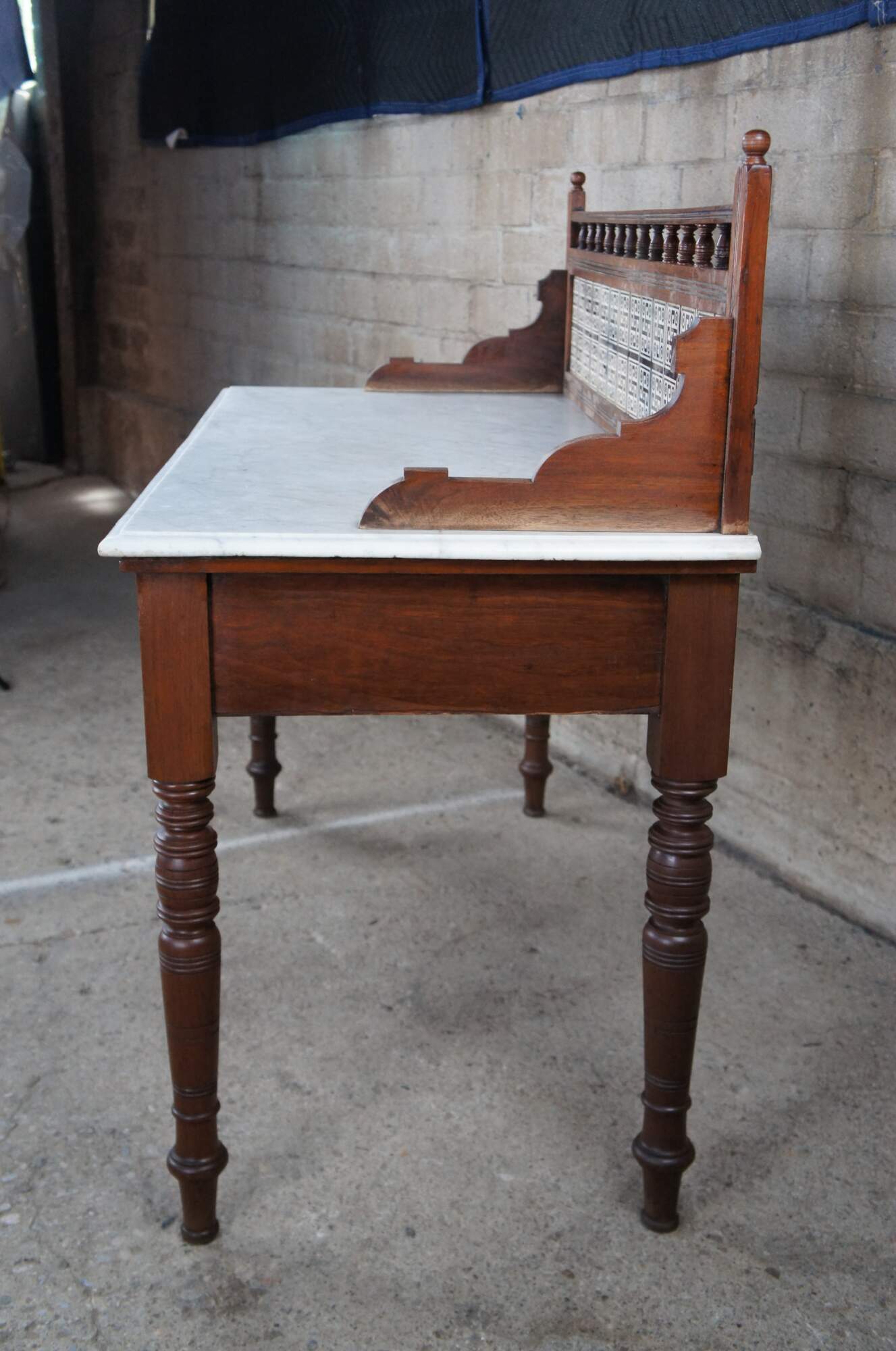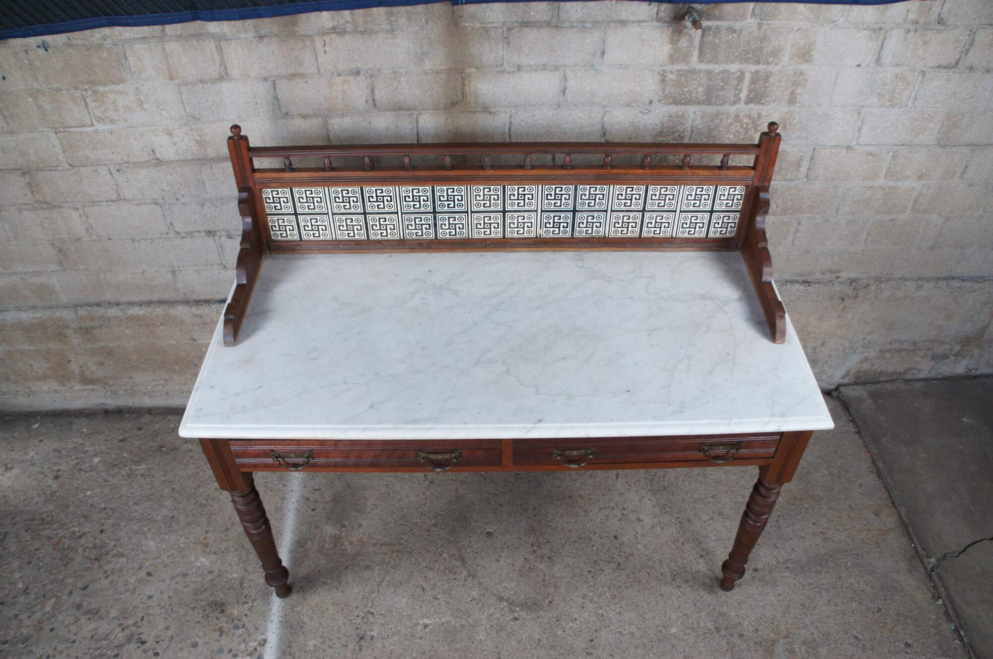 Antique Victorian Eastlake Washstand, circa last quarter 19th century. Made from walnut with a white marble top featuring a tiled backsplash and bobbin turned gallery. The two large drawers are hand dovetailed with brass hardware. Supported by turned and taperred legs leading to arrow feet. Great for use as a server, barback or desk. Backsplash is removable to allow for more workspace,