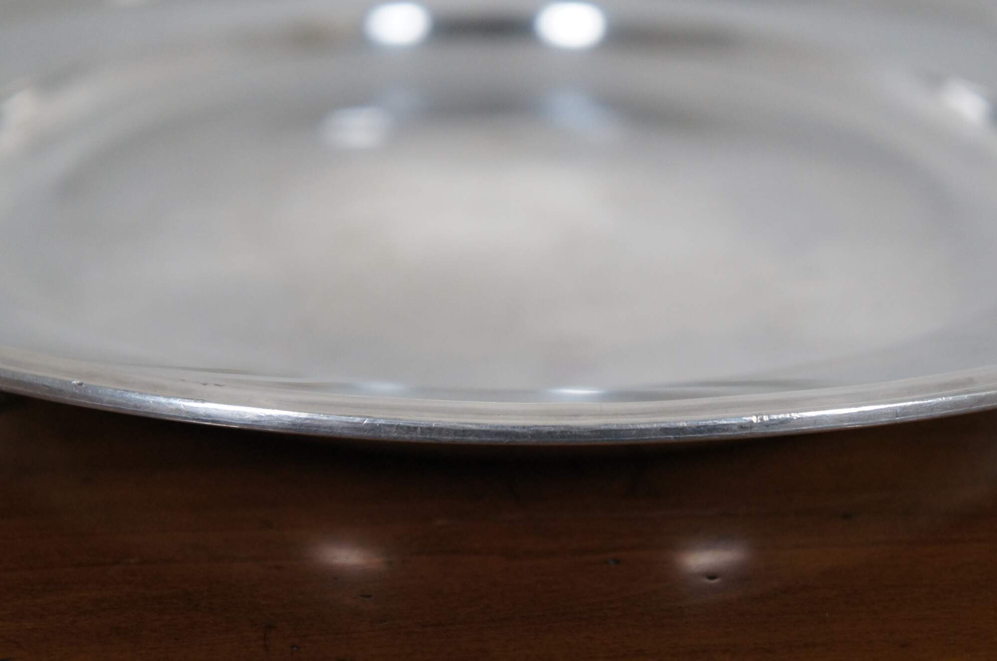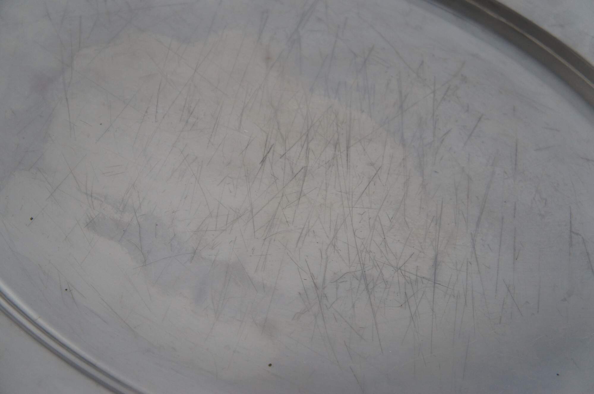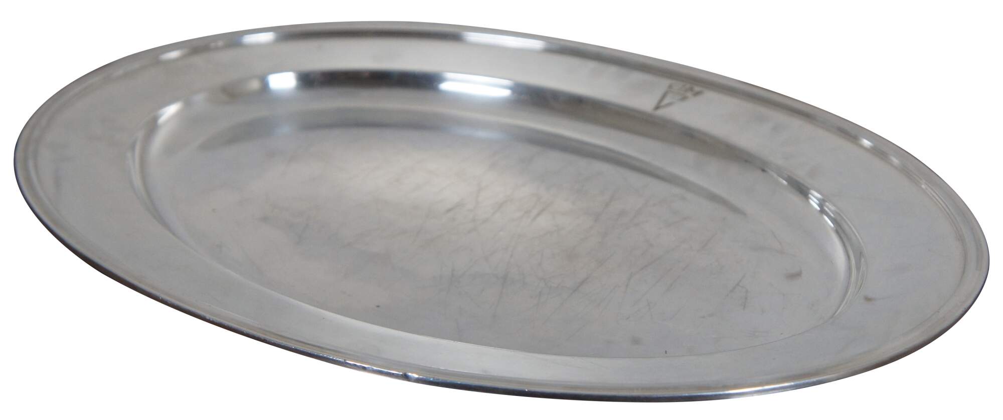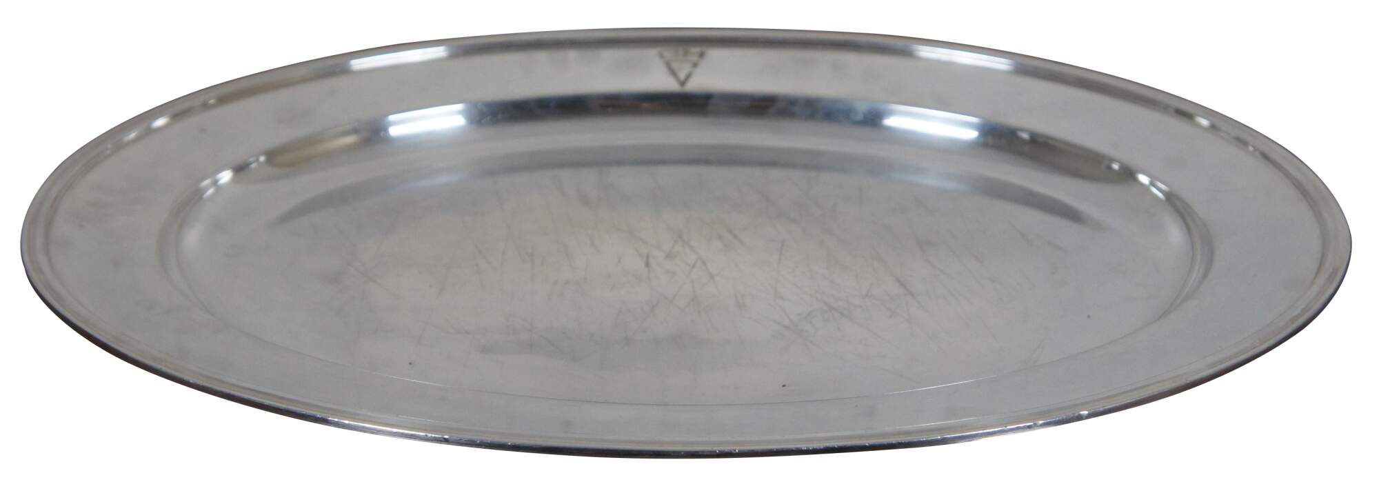 Antique 1934 Reed & Barton number 10002-20 oval silver plate serving platter; edge engraved with the initials CMC. “The Reed & Barton story began in 1824, when Isaac Babbitt created a new metal alloy - ""Britannia metal"" - in his Taunton, Massachusetts pewter shop.