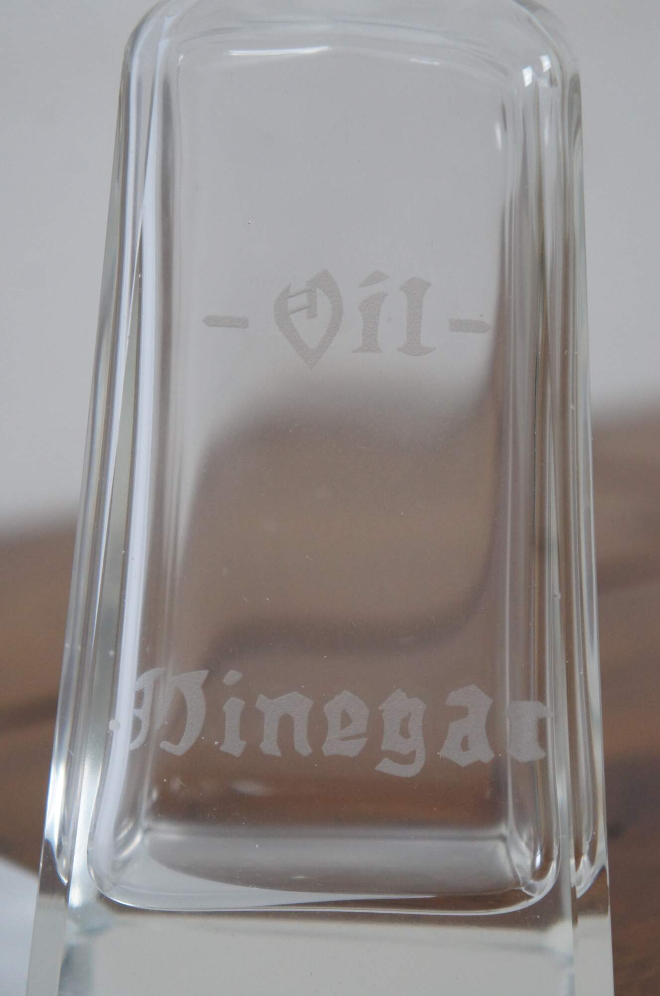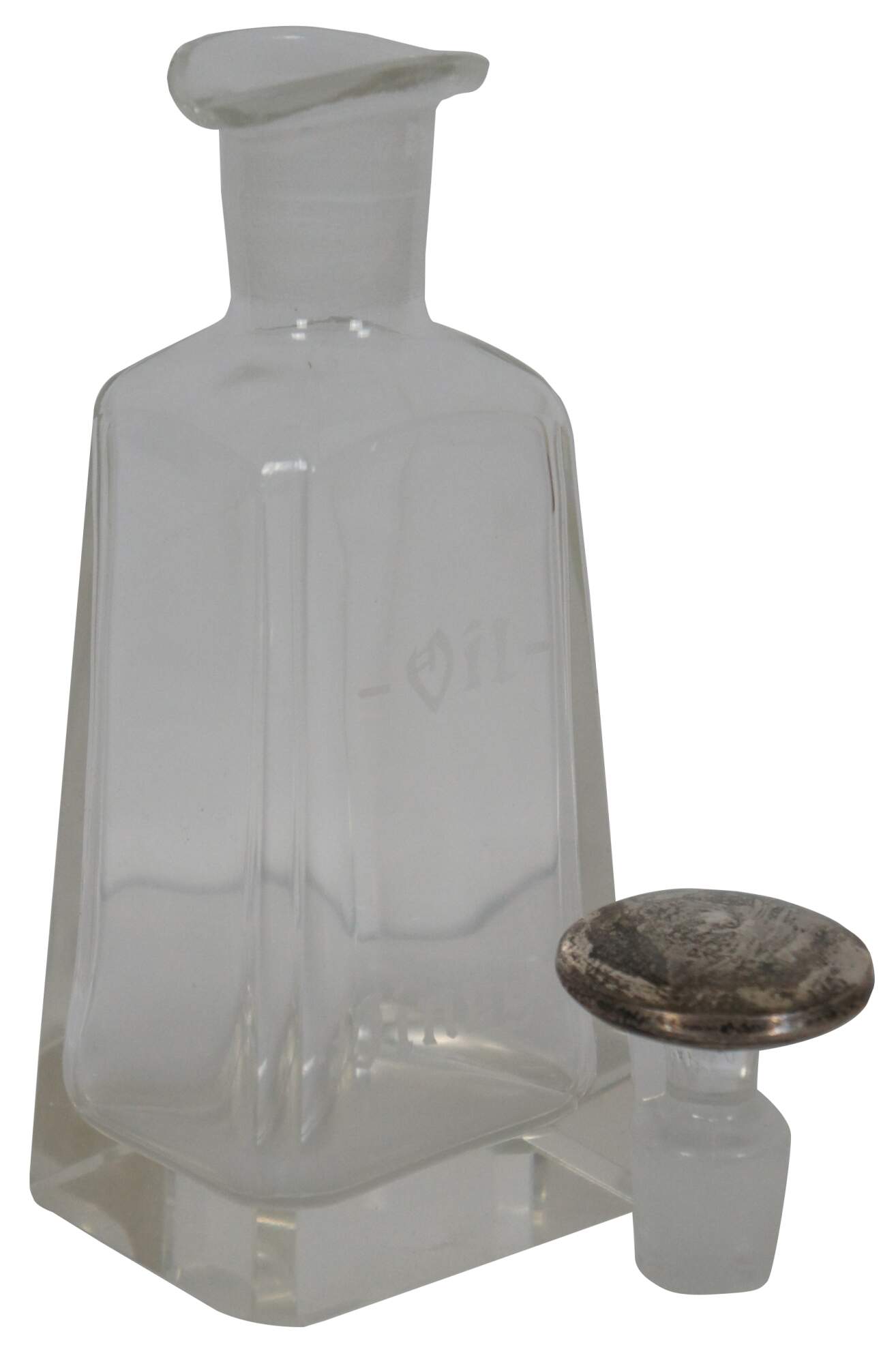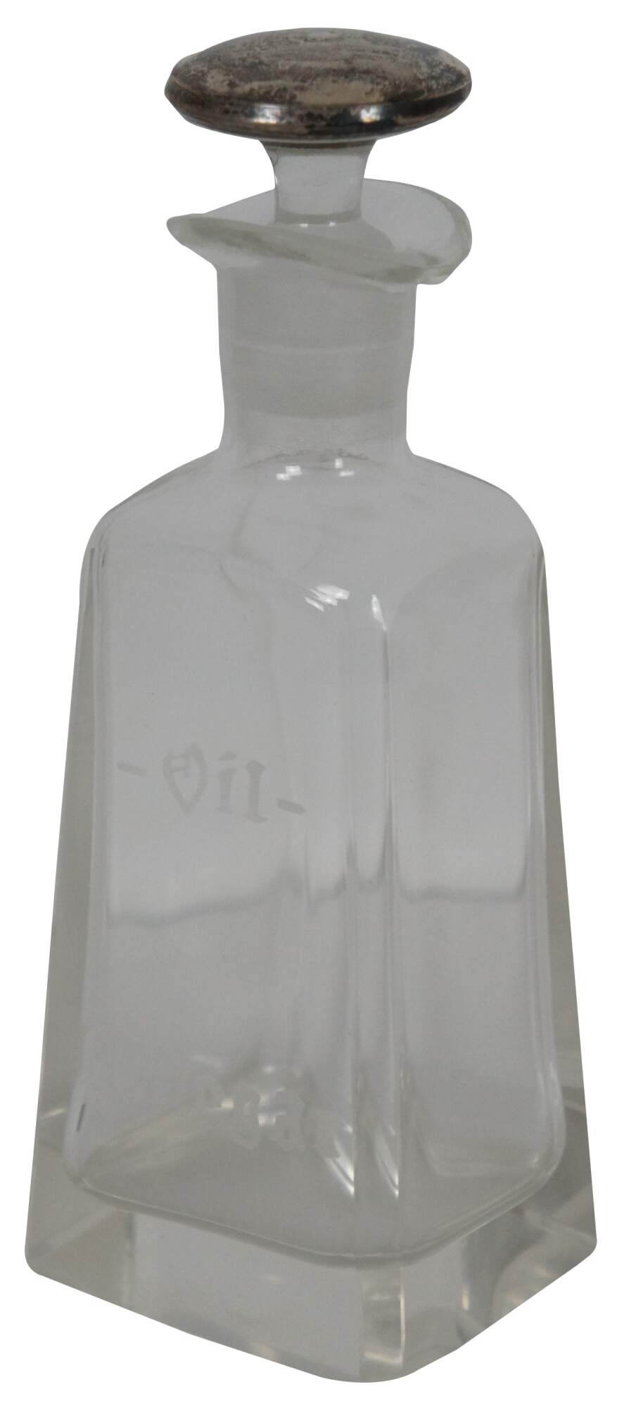 Antique glass salad dressing bottle etched with the words Oil and Vinegar with a line indicating the proportion of each you should fill the bottle with. Stopper is clad in 925 sterling silver.