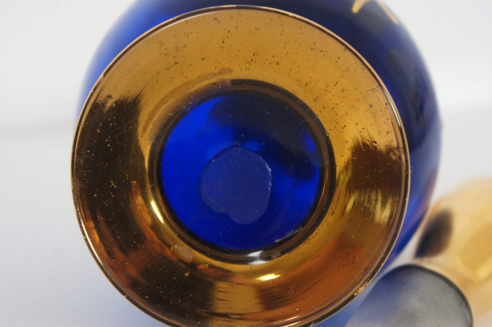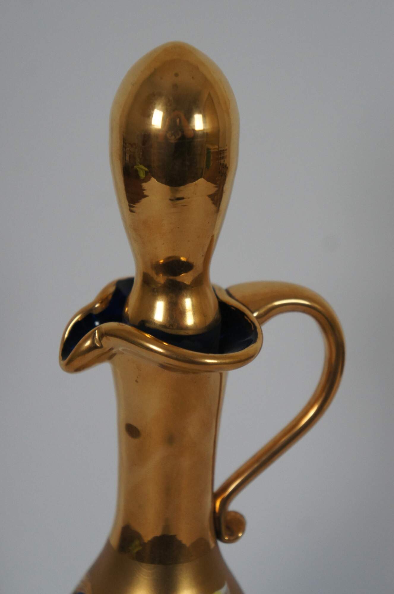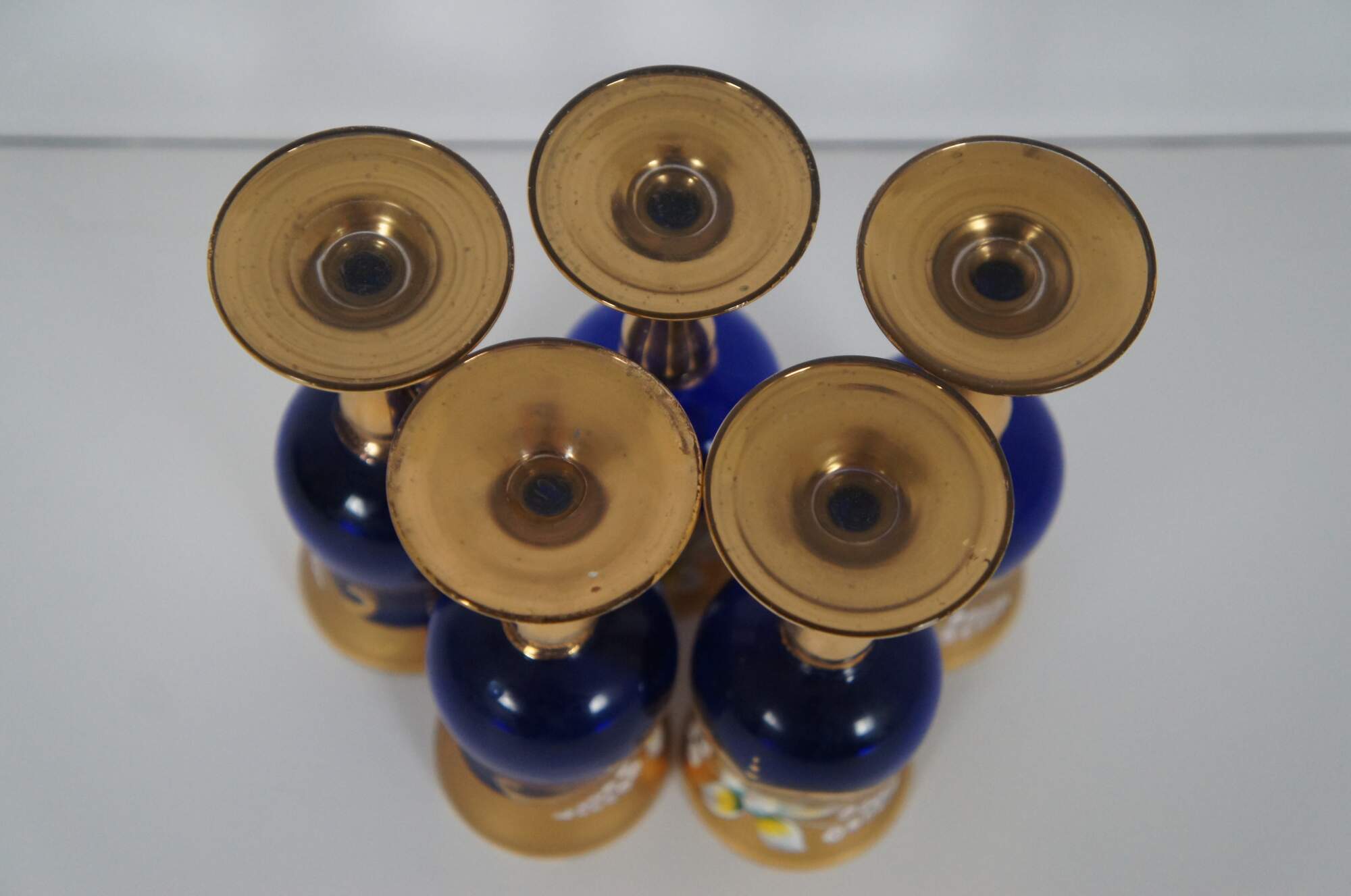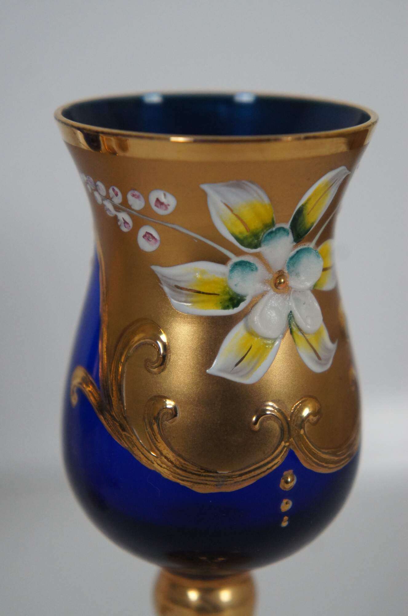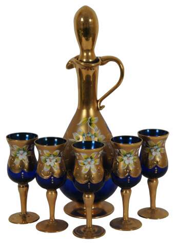Elegant hand blown Bohemian or Czech art glass bar decanter and cordial goblet set in cobalt blue glass, painted in gold with white and yellow flowers.