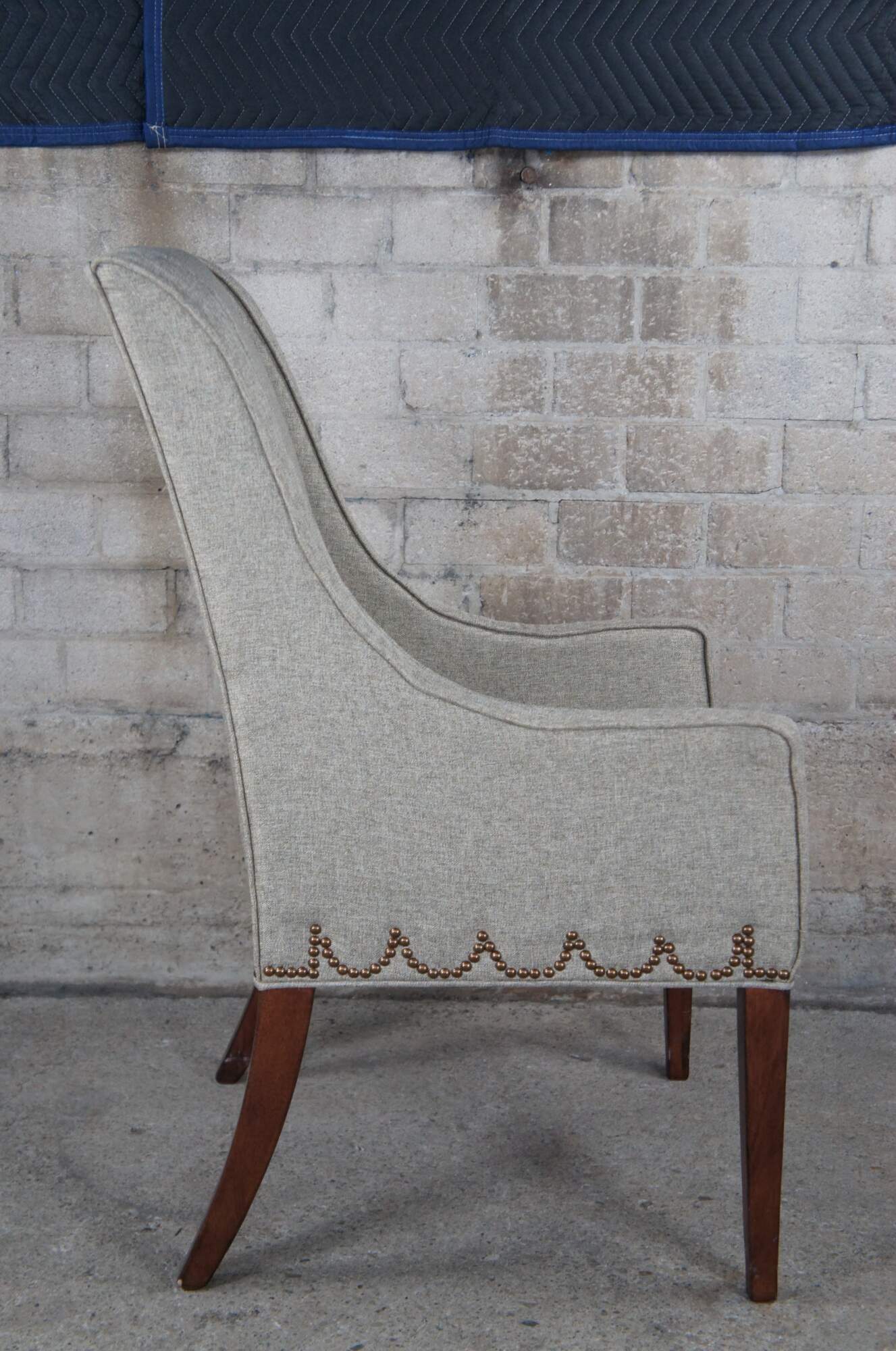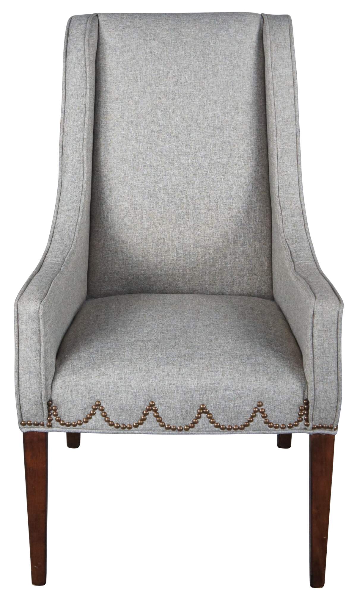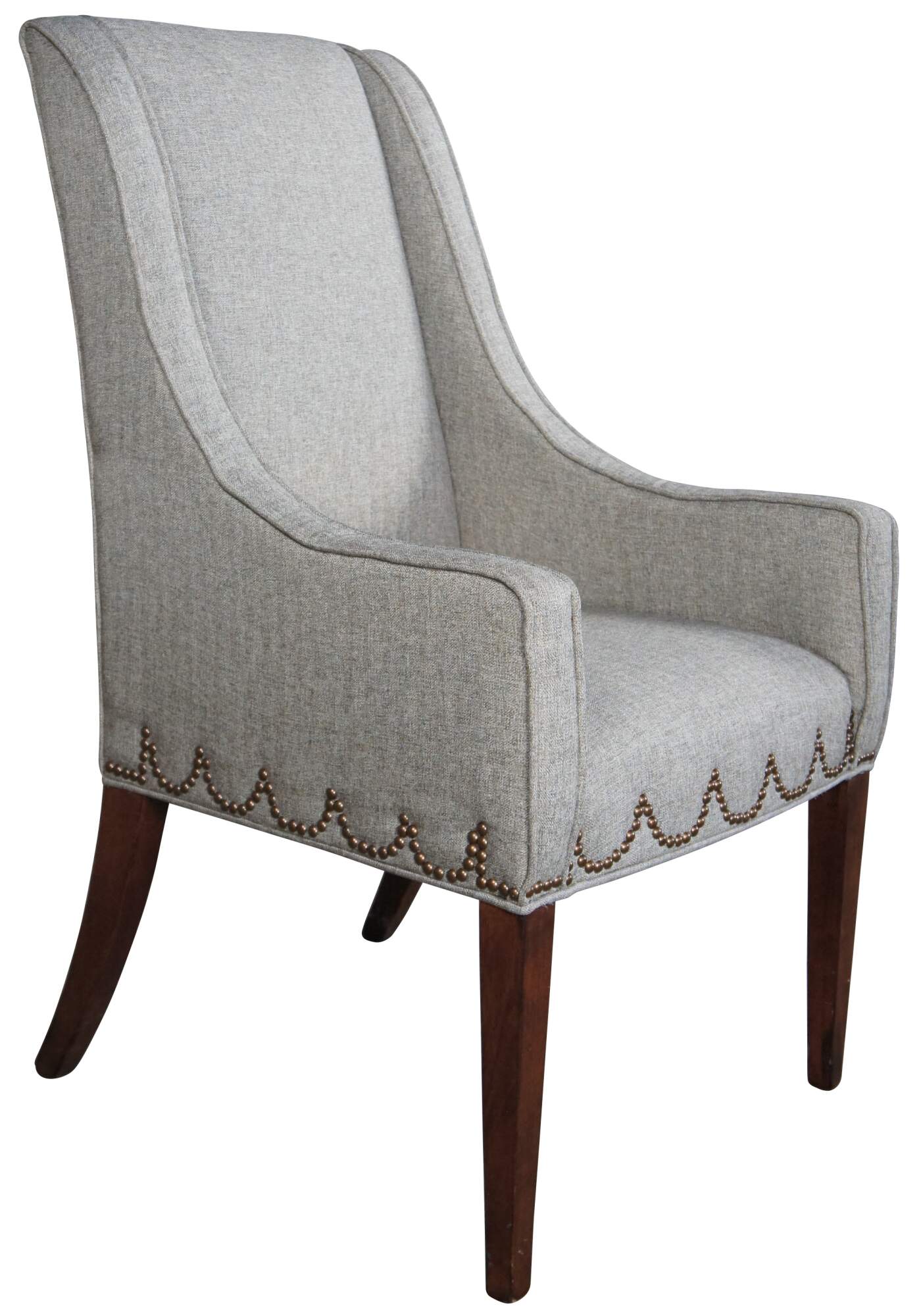 Universal Furniture Gray Slipper arm chair. Graceful lines with Hepplewhite styling, nailhead trim and square tapered mahogany finished legs.