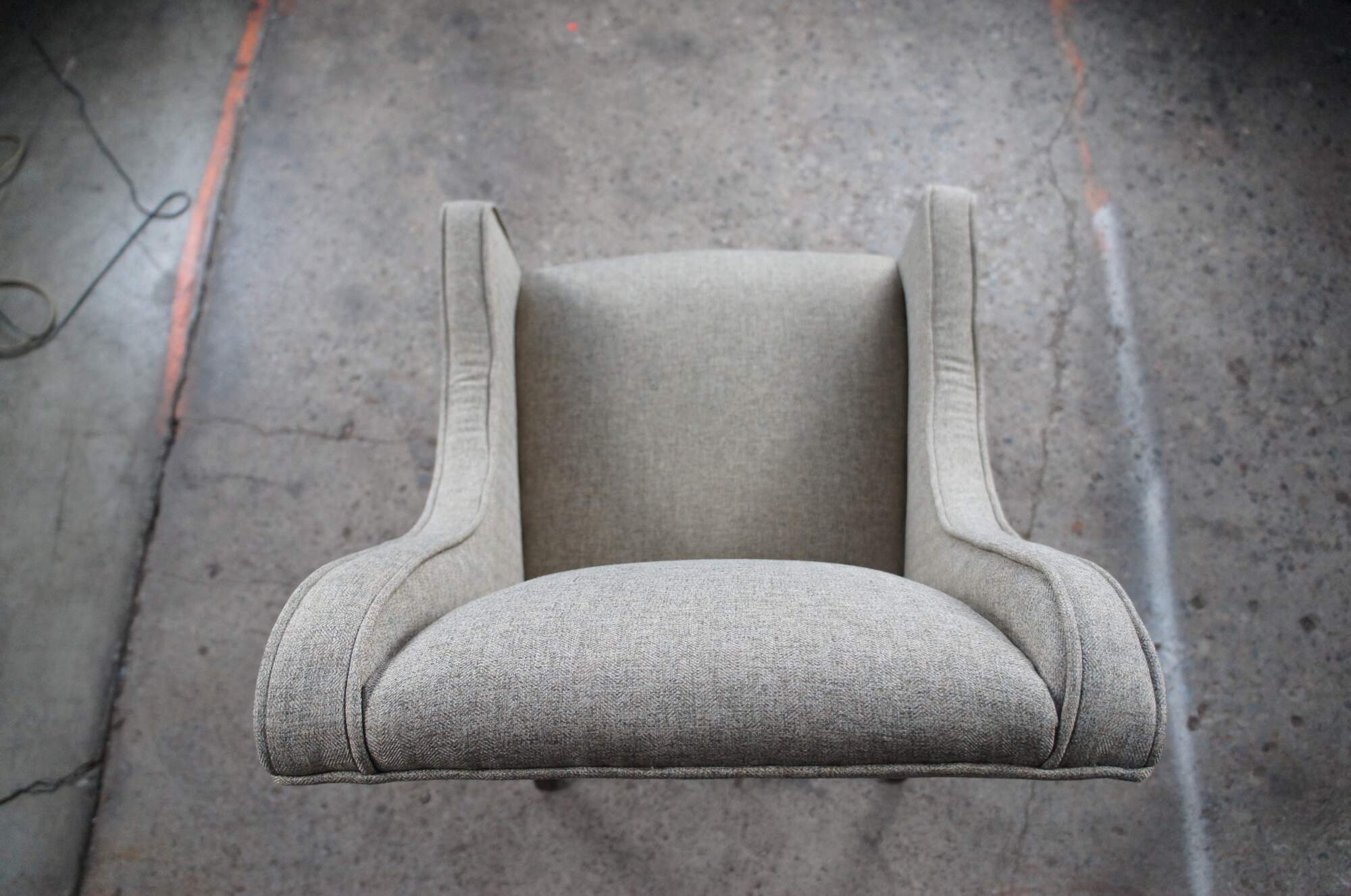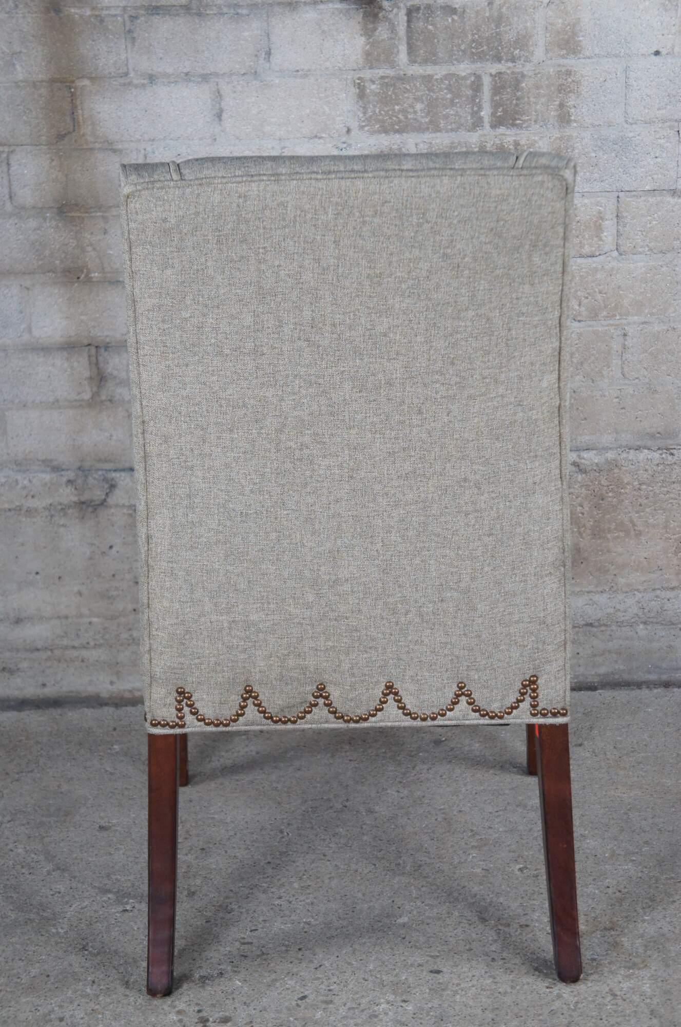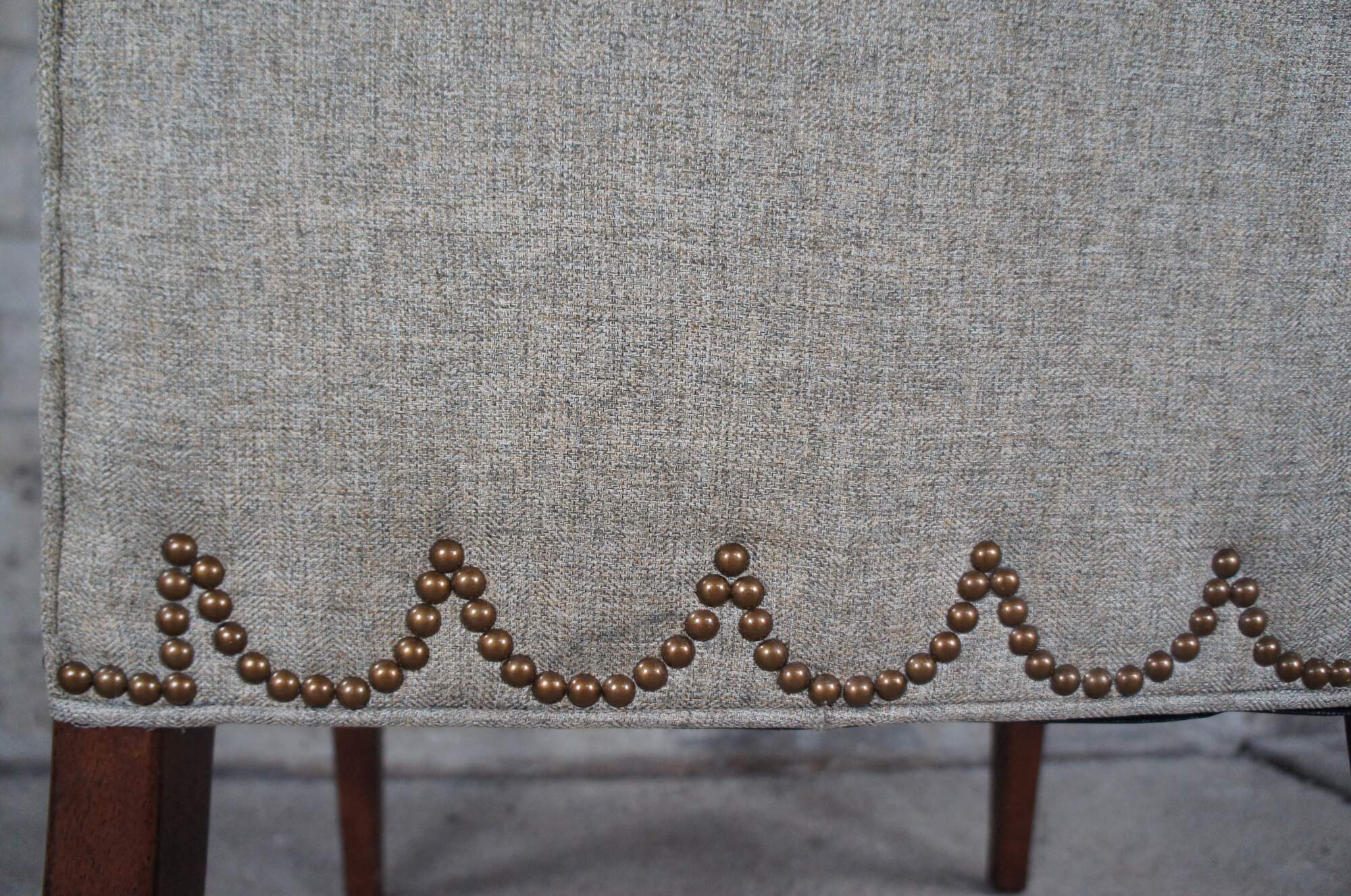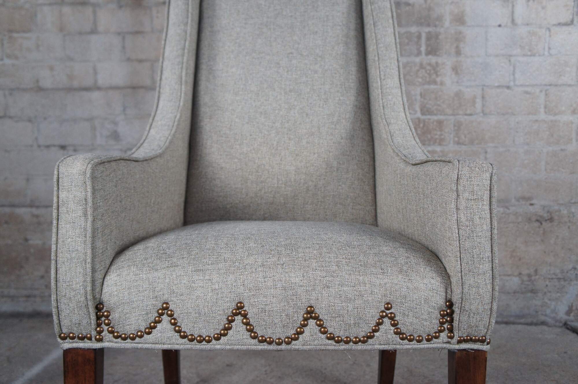 Universal Furniture Gray Slipper arm chair. Graceful lines with Hepplewhite styling, nailhead trim and square tapered mahogany finished legs.