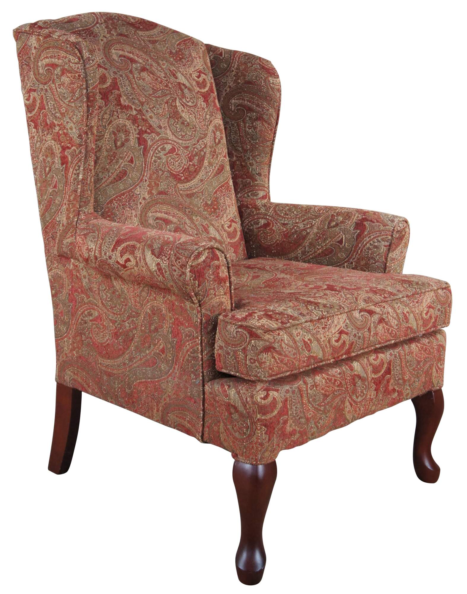 Pair of Best Home Furnishing Wing Chairs. Upholstered in a red and gold fabric with spice finished legs.