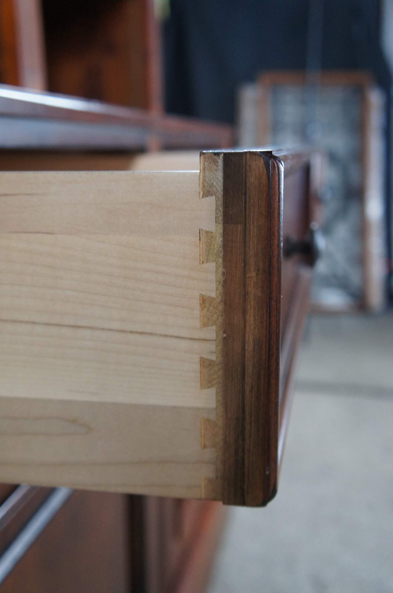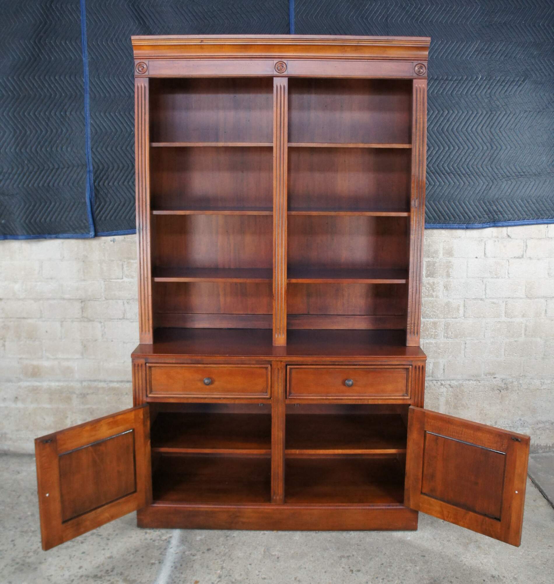 Ethan Allen British Classics Bookcase, 29-9663 & 29-9664. Handcrafted in American workshops. Made from maple in Victorian Revival styling. Features a hutch with three shelves over lower cabinet with two dovetailed drawers and lower storage. Complimented by circular medallions, fluted pilasters & stiles and metal hardware.