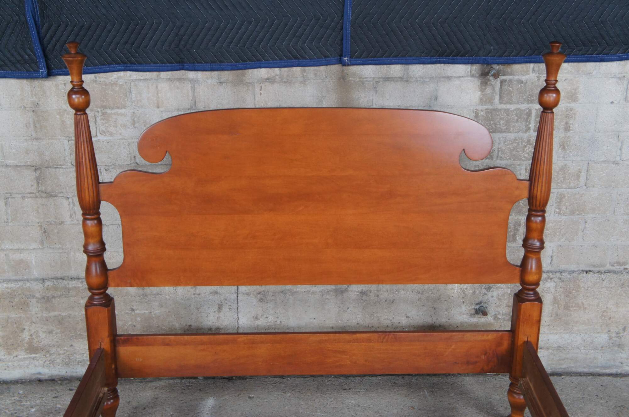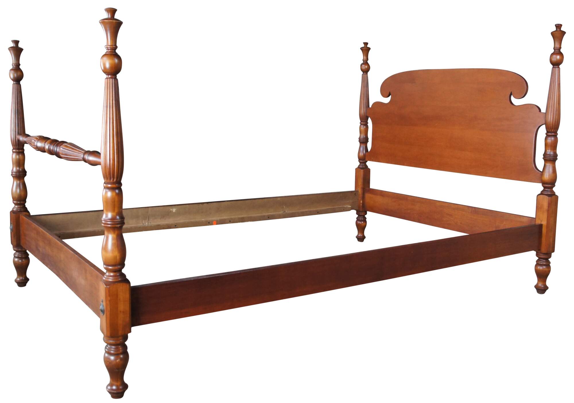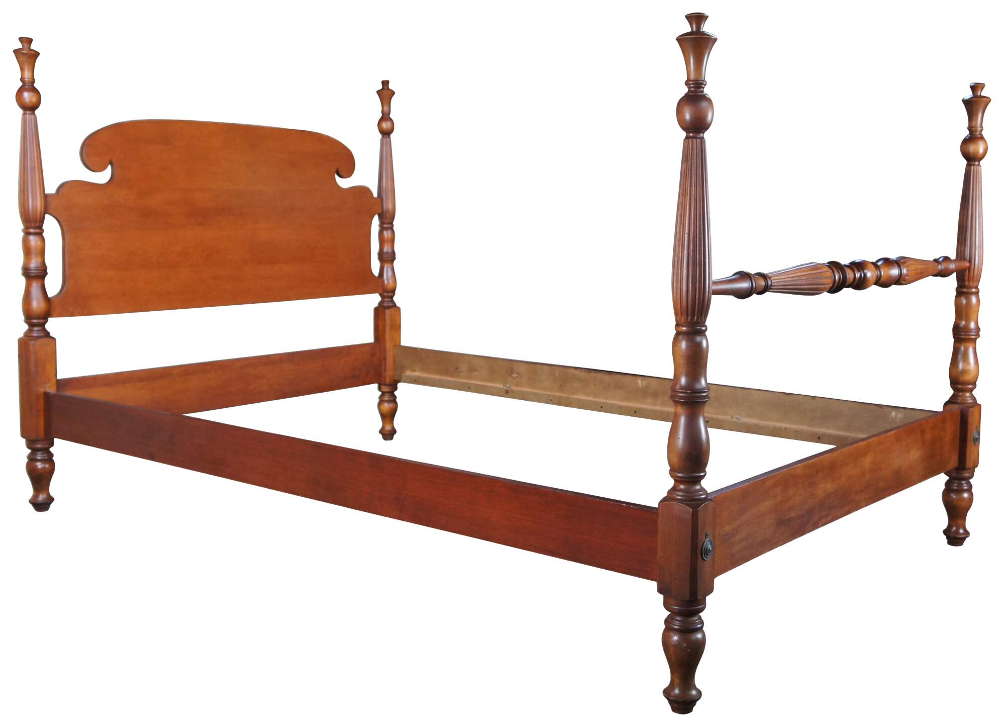A beautiful classic Statton Trutype Americana four-poster cherry bed. Produced by Statton Furniture Manufacturing Company, Hagerstown, Maryland, the Trutype Americana brand was bench-made by individual craftsman. Features Early American styling with blanket rail, reeded turned posts and thistle finials. The thistle is the national flower of Scotland and it stands for independence.