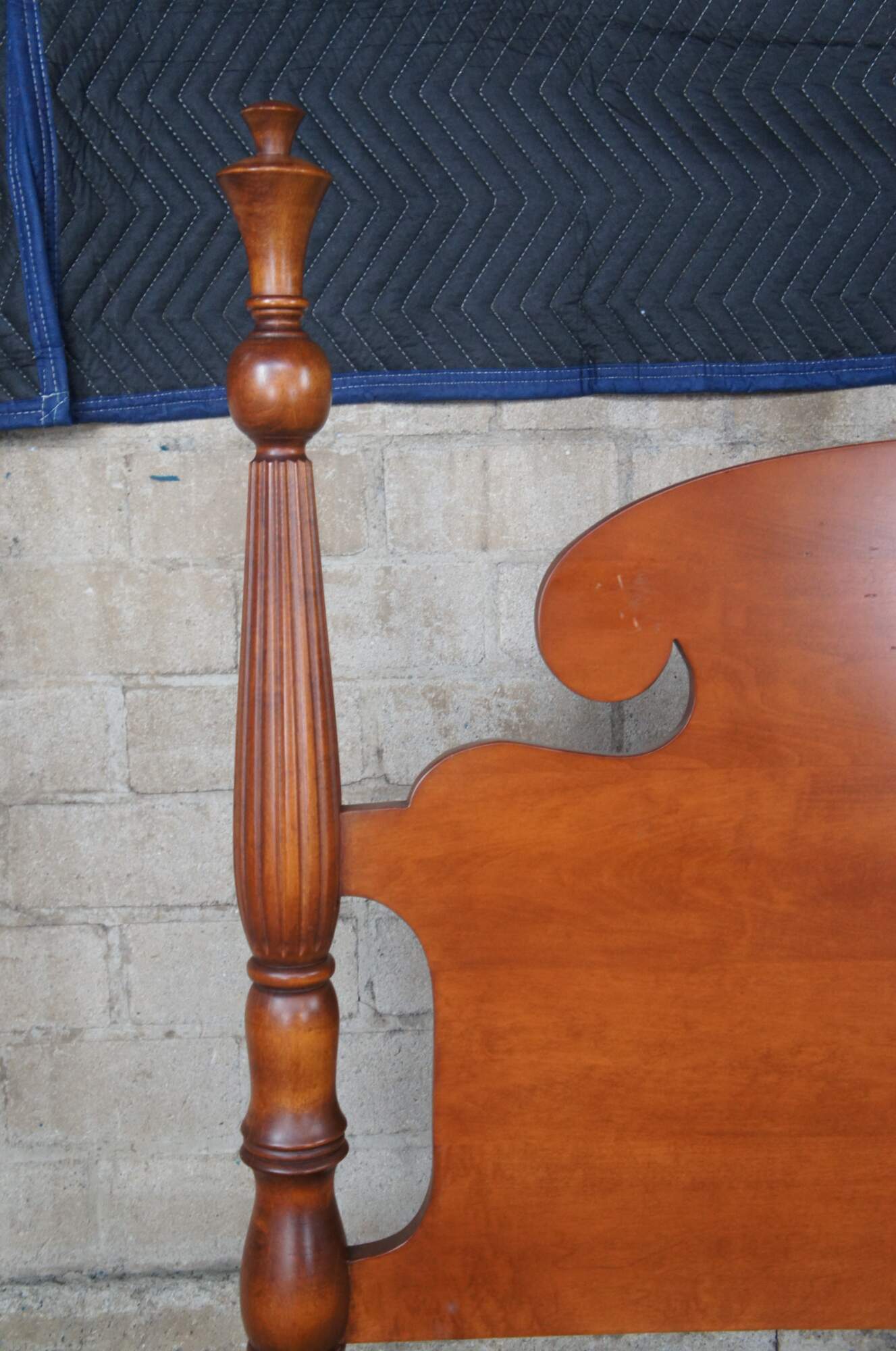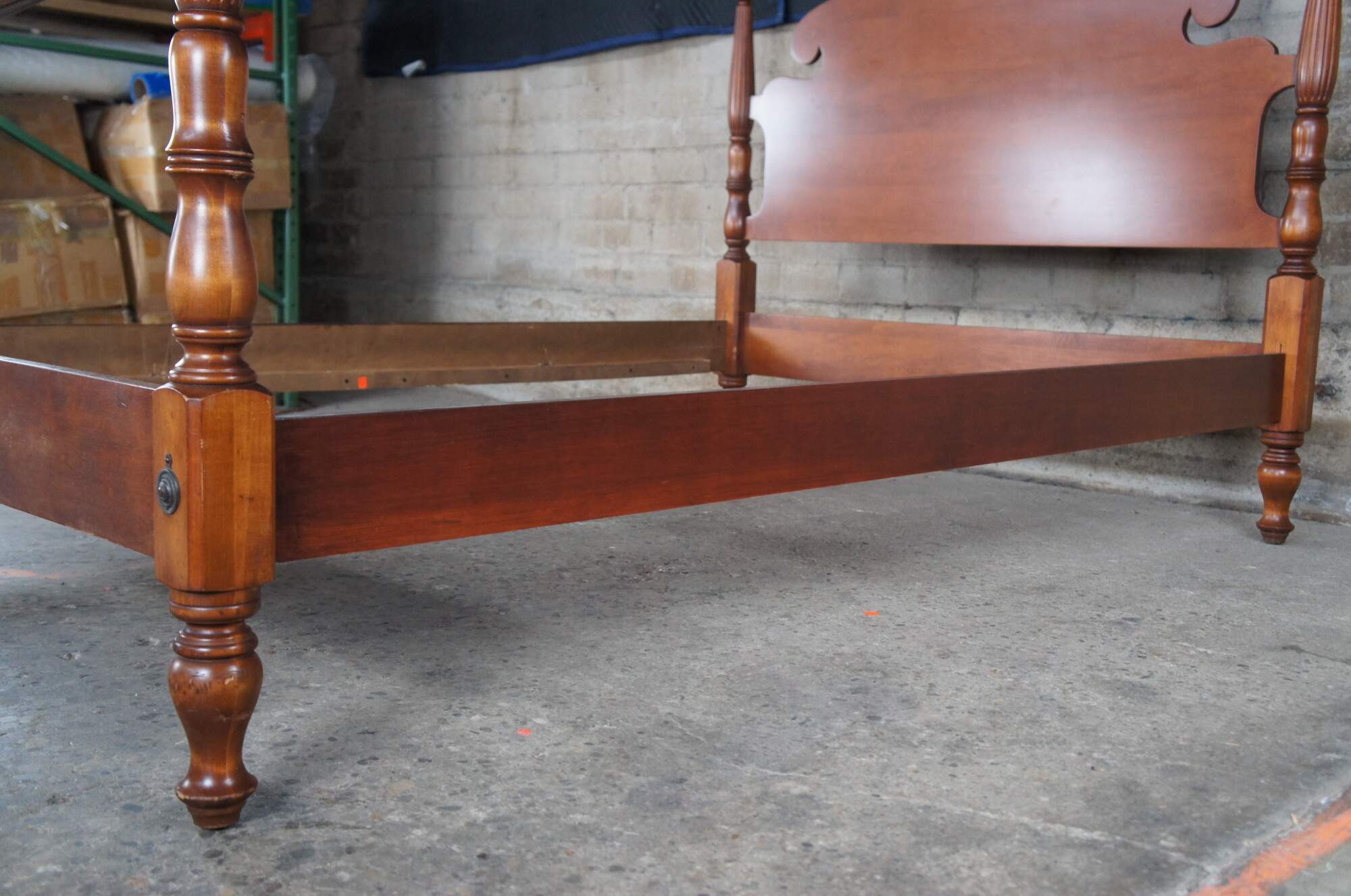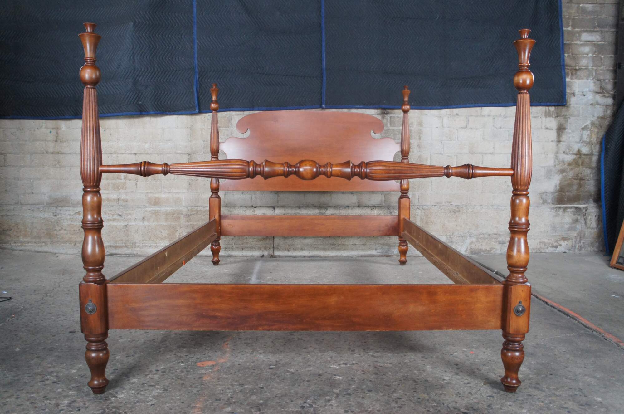 A beautiful classic Statton Trutype Americana four-poster cherry bed. Produced by Statton Furniture Manufacturing Company, Hagerstown, Maryland, the Trutype Americana brand was bench-made by individual craftsman. Features Early American styling with blanket rail, reeded turned posts and thistle finials. The thistle is the national flower of Scotland and it stands for independence.