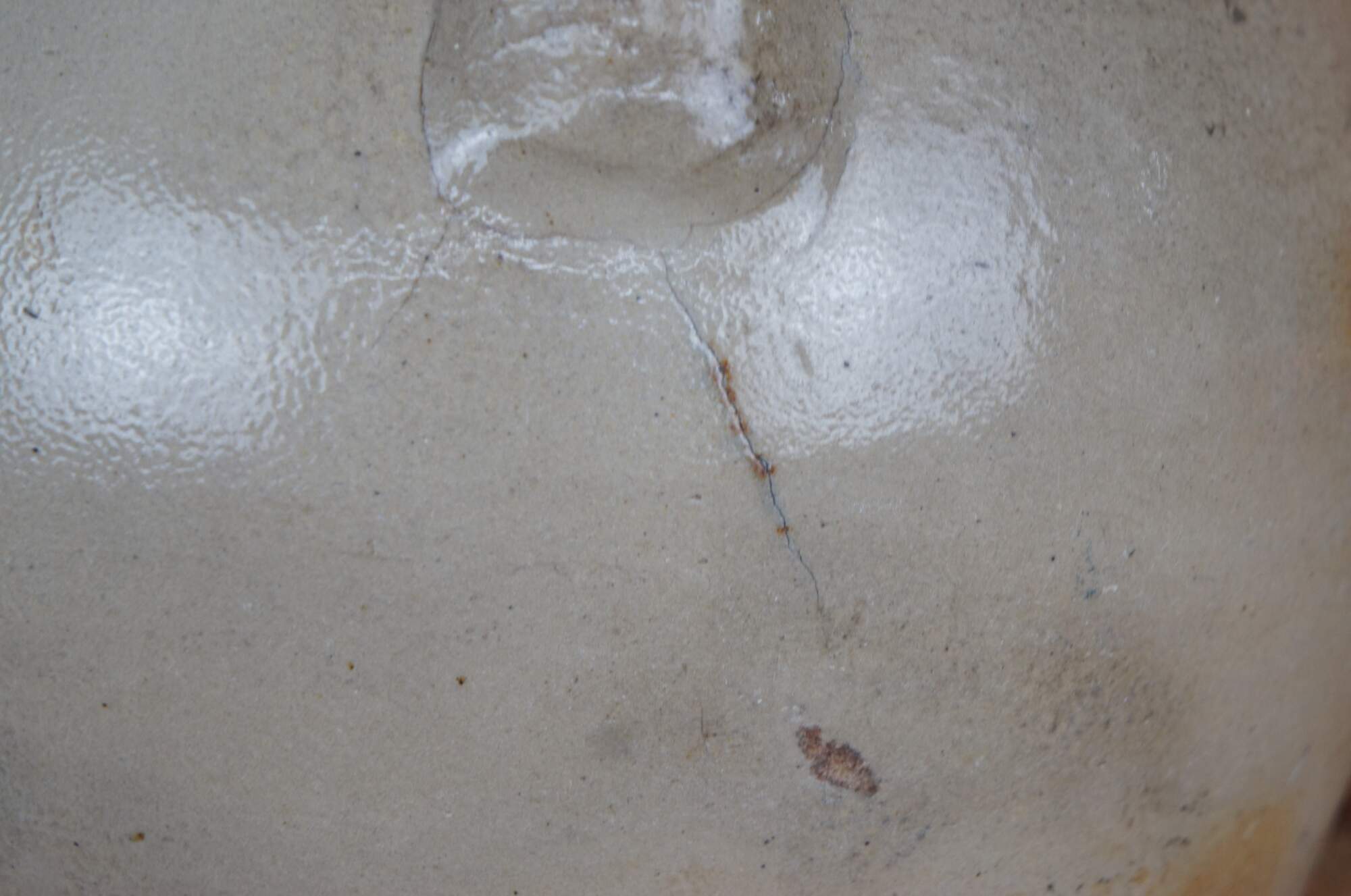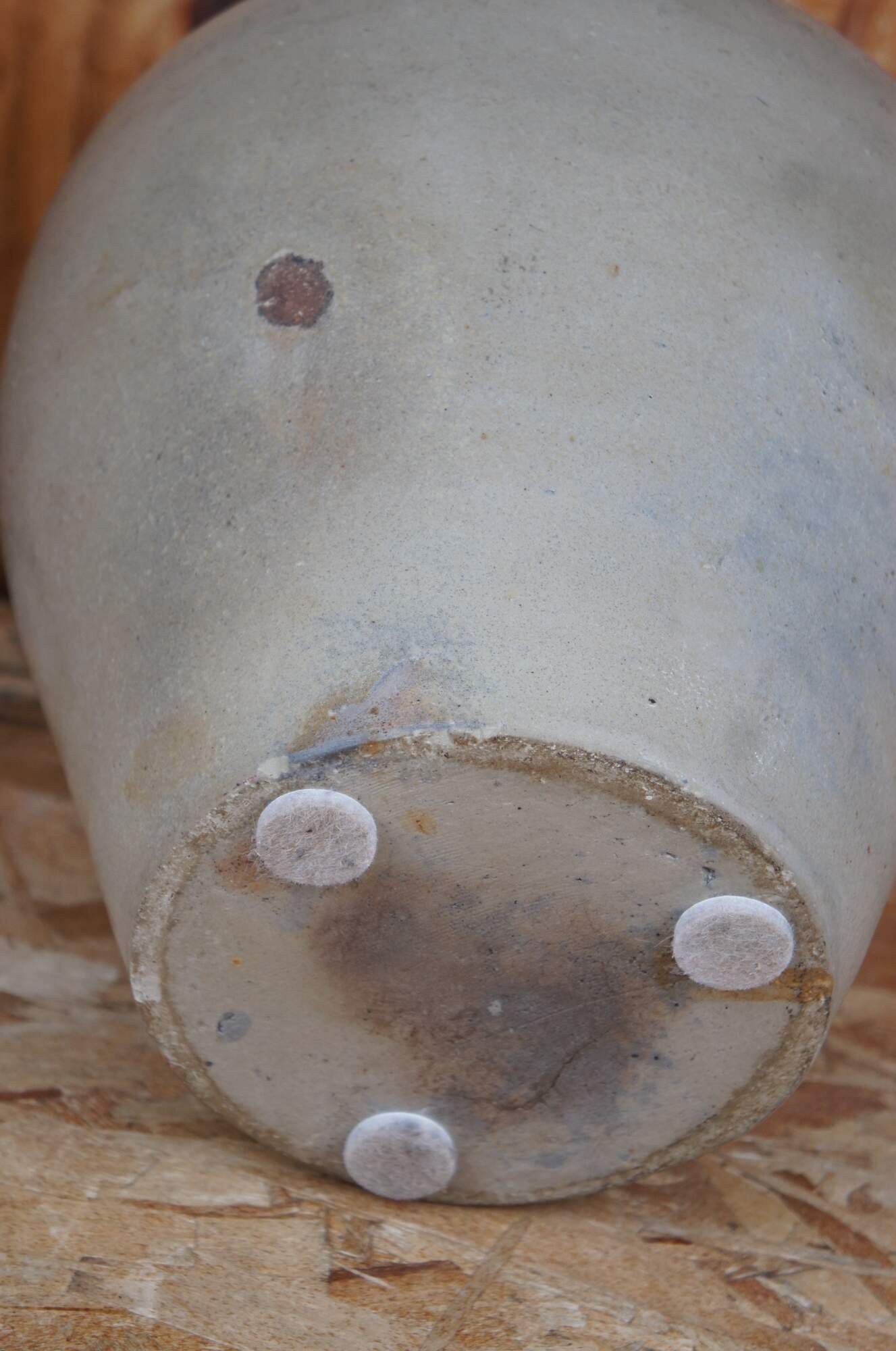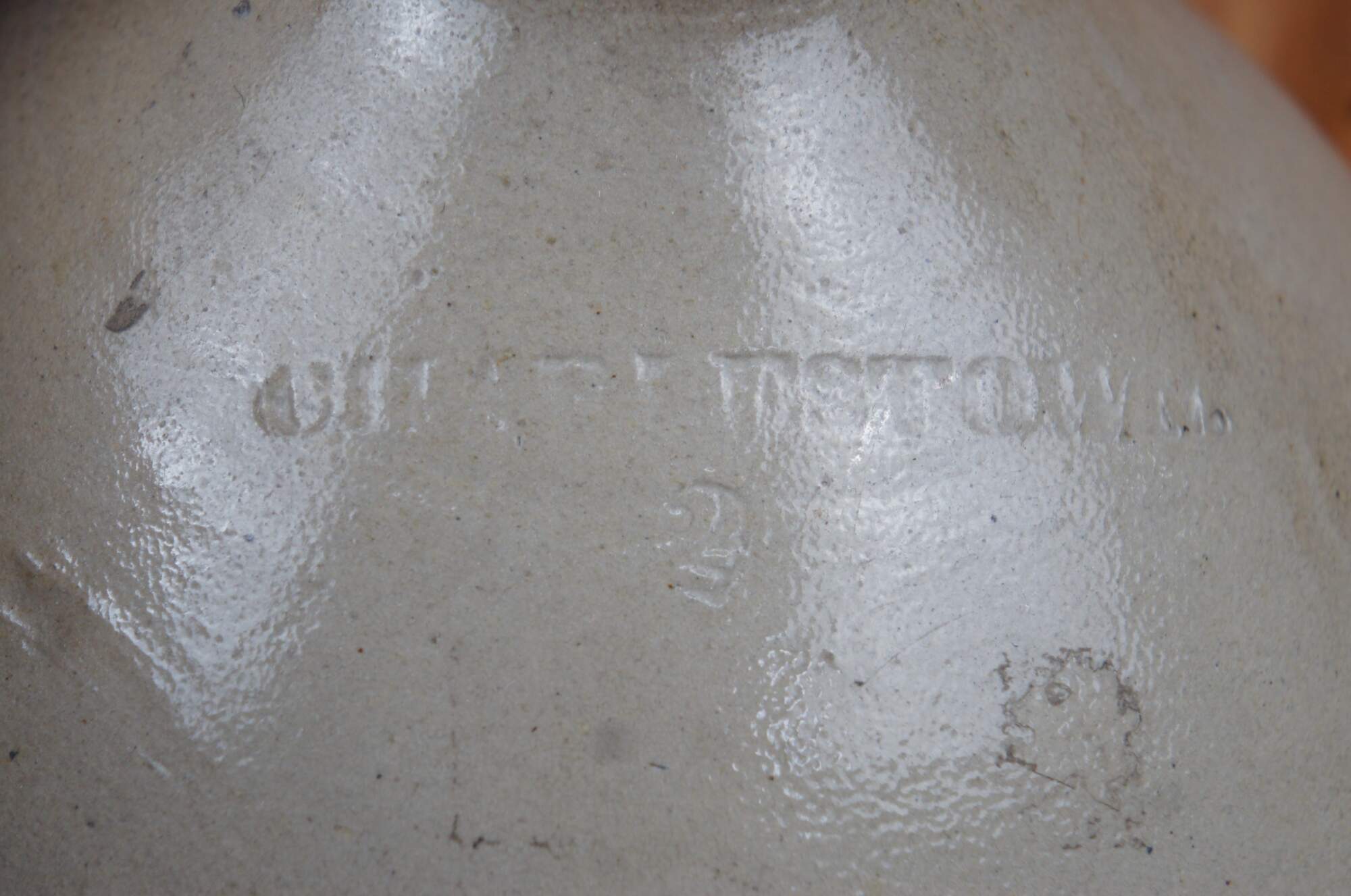Two primitive 19th century antique salt glaze earthenware or stoneware crocks / jugs featuring a two gallon Charlestown Massachusettes jug and a one gallon other.