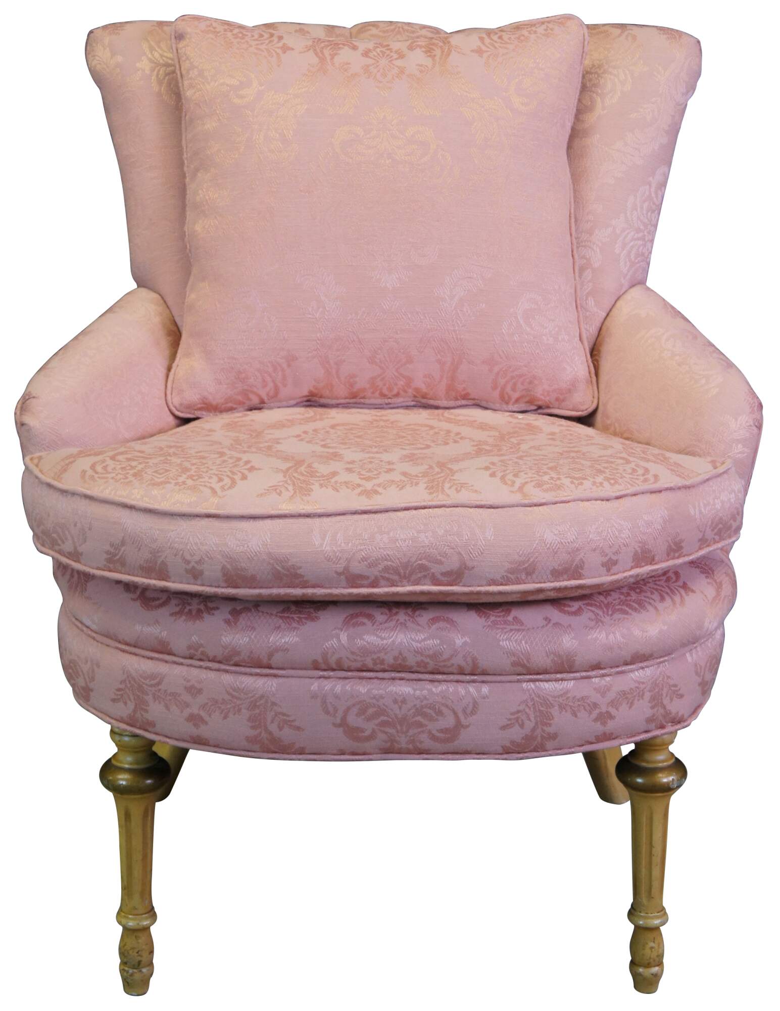 A quaint channel back vanity or accent chair by Robert W. Irwin Furniture Company. Upholstered in an elegant pink brocade with throw pillow. Supported by turned, tapered and fluted legs leading to arrow feet with saber legs along the rear. The legs have a provincial finish with gold trim. Circa 1928-1940