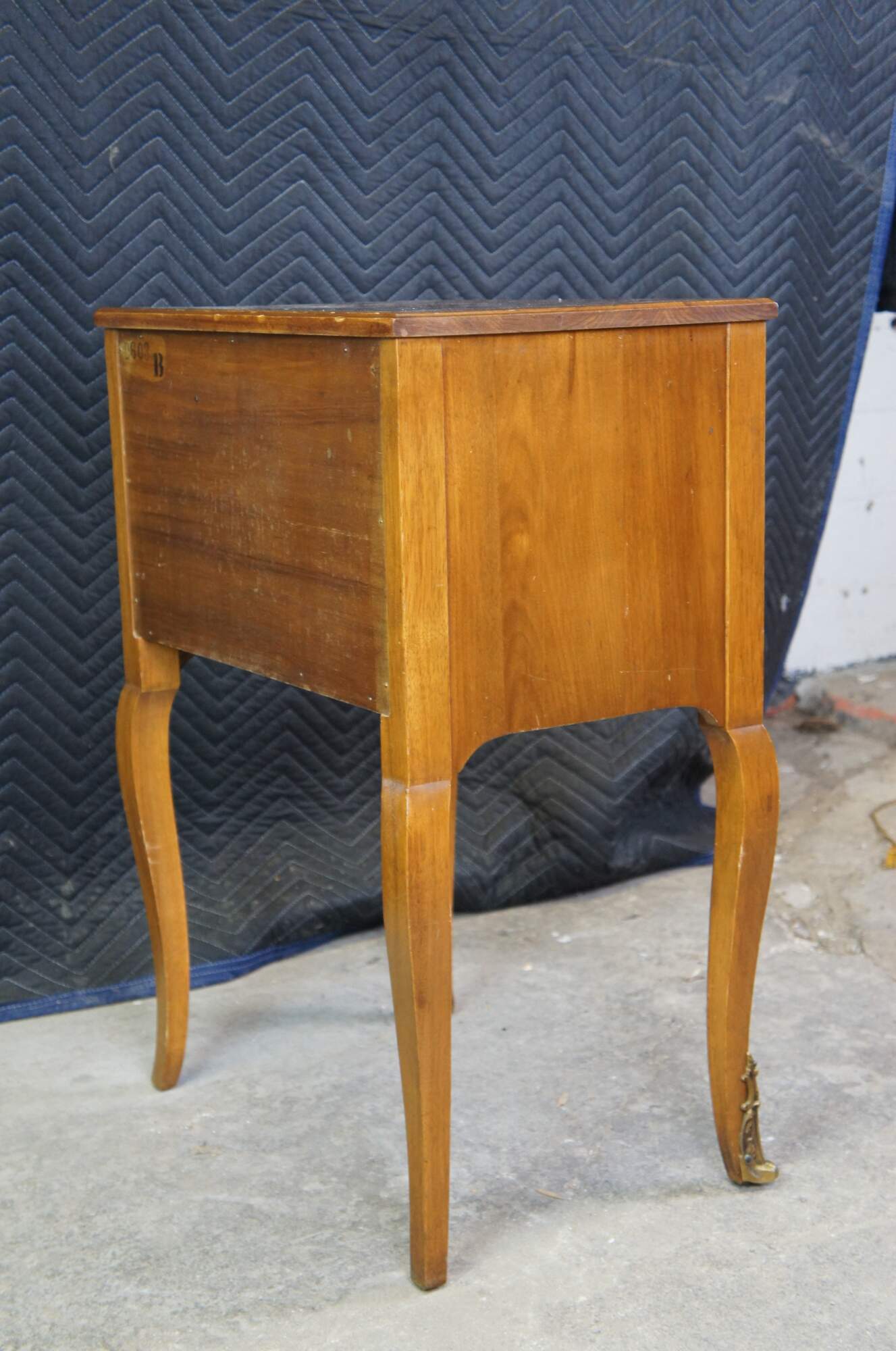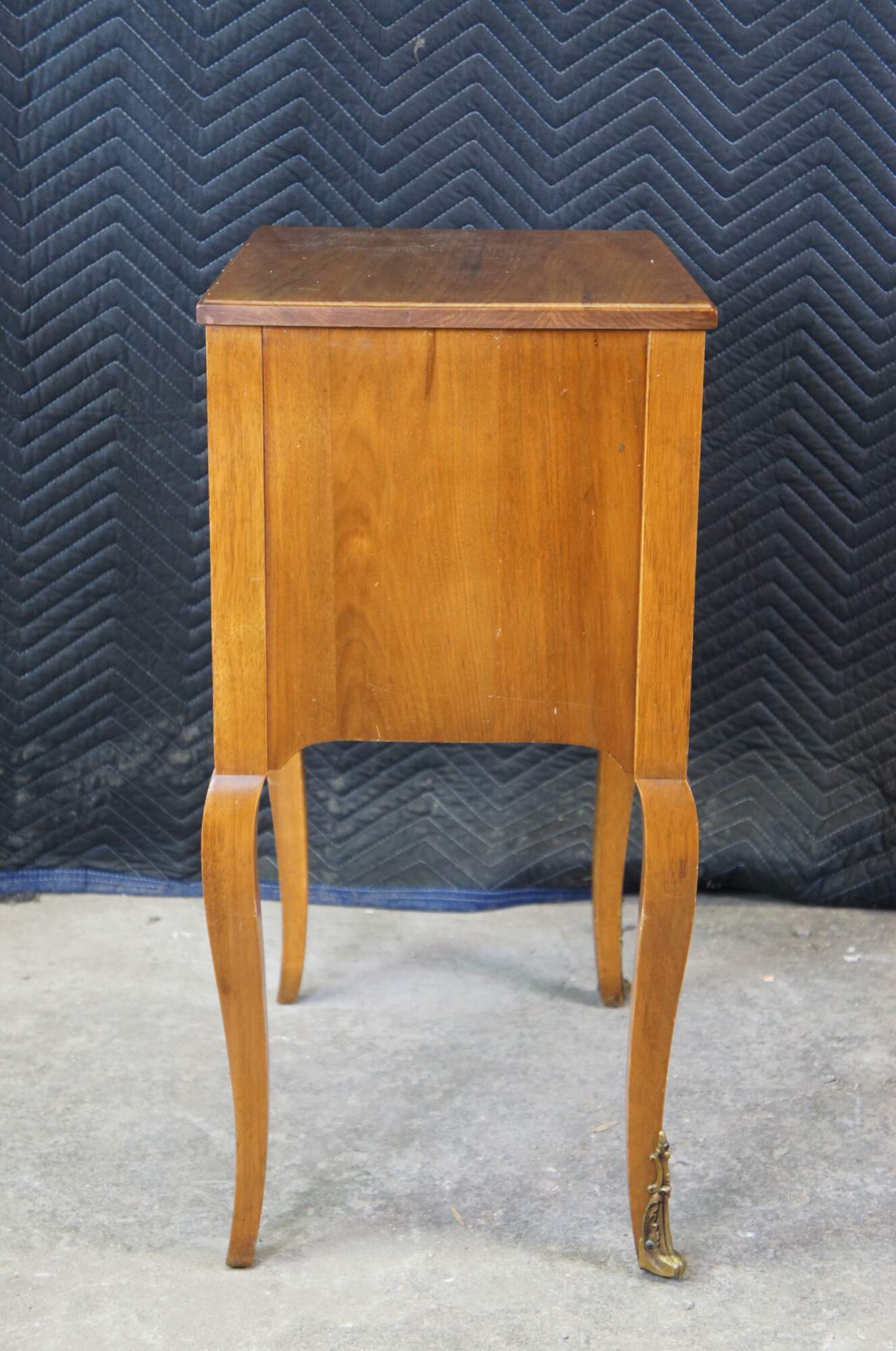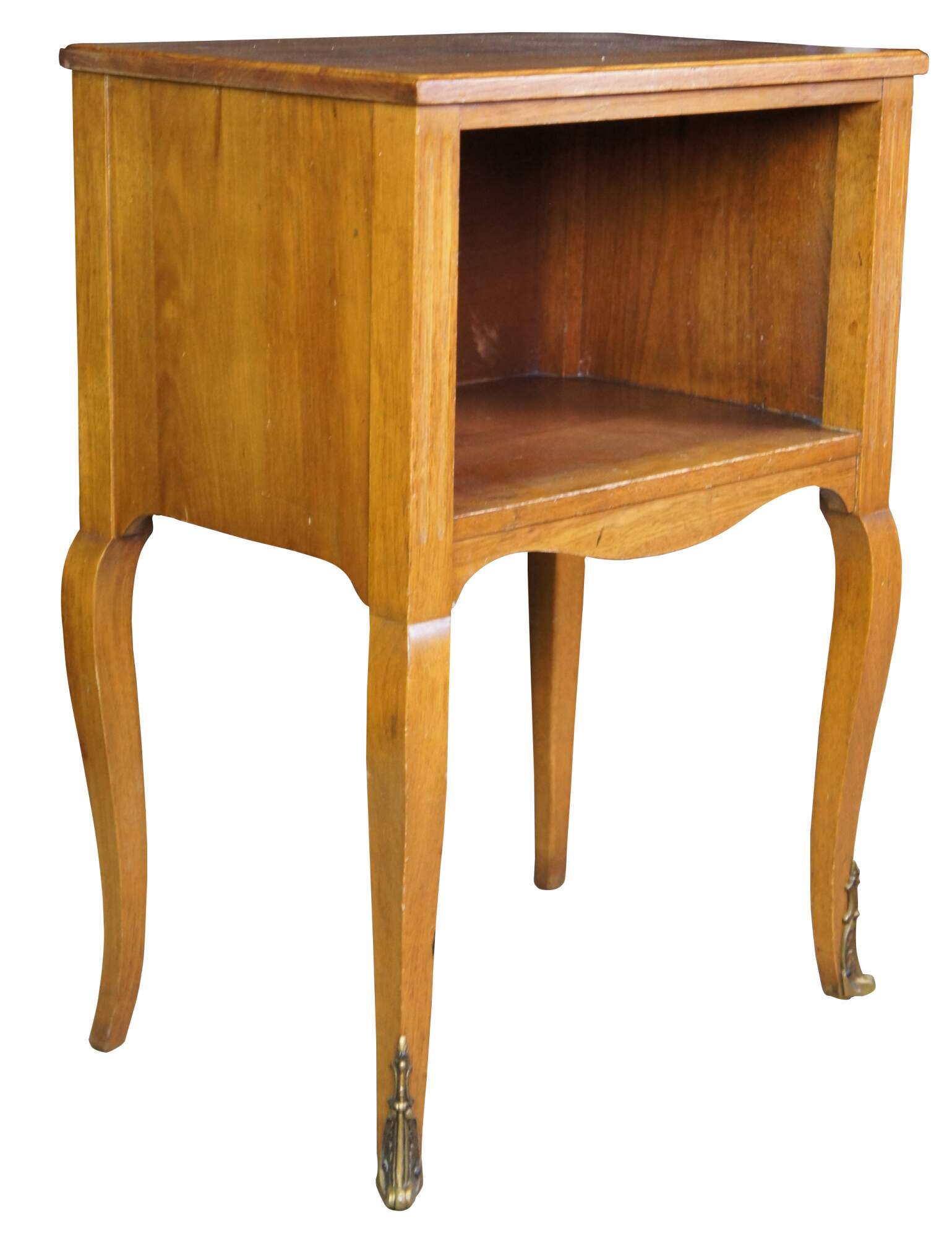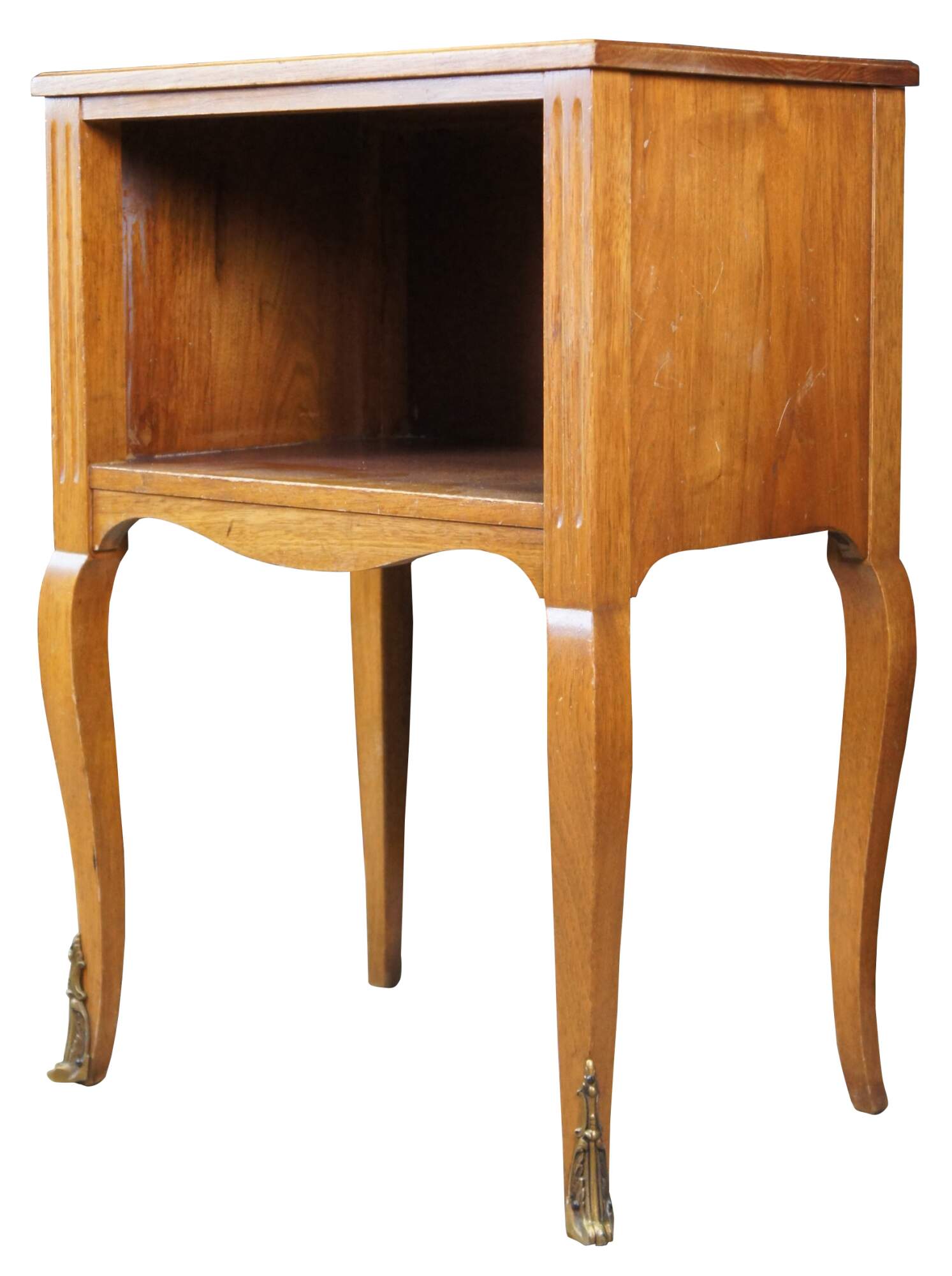 A lovely nightstand or accent table by Robert W. Irwin Furniture Company. Crafted from French Walnut in Louis XV styling. Features a rectangular form with open cubby flanked by fluted stiles, serpentine apront and long cabriole legs with ormolu mounts. Circa 1928-1940