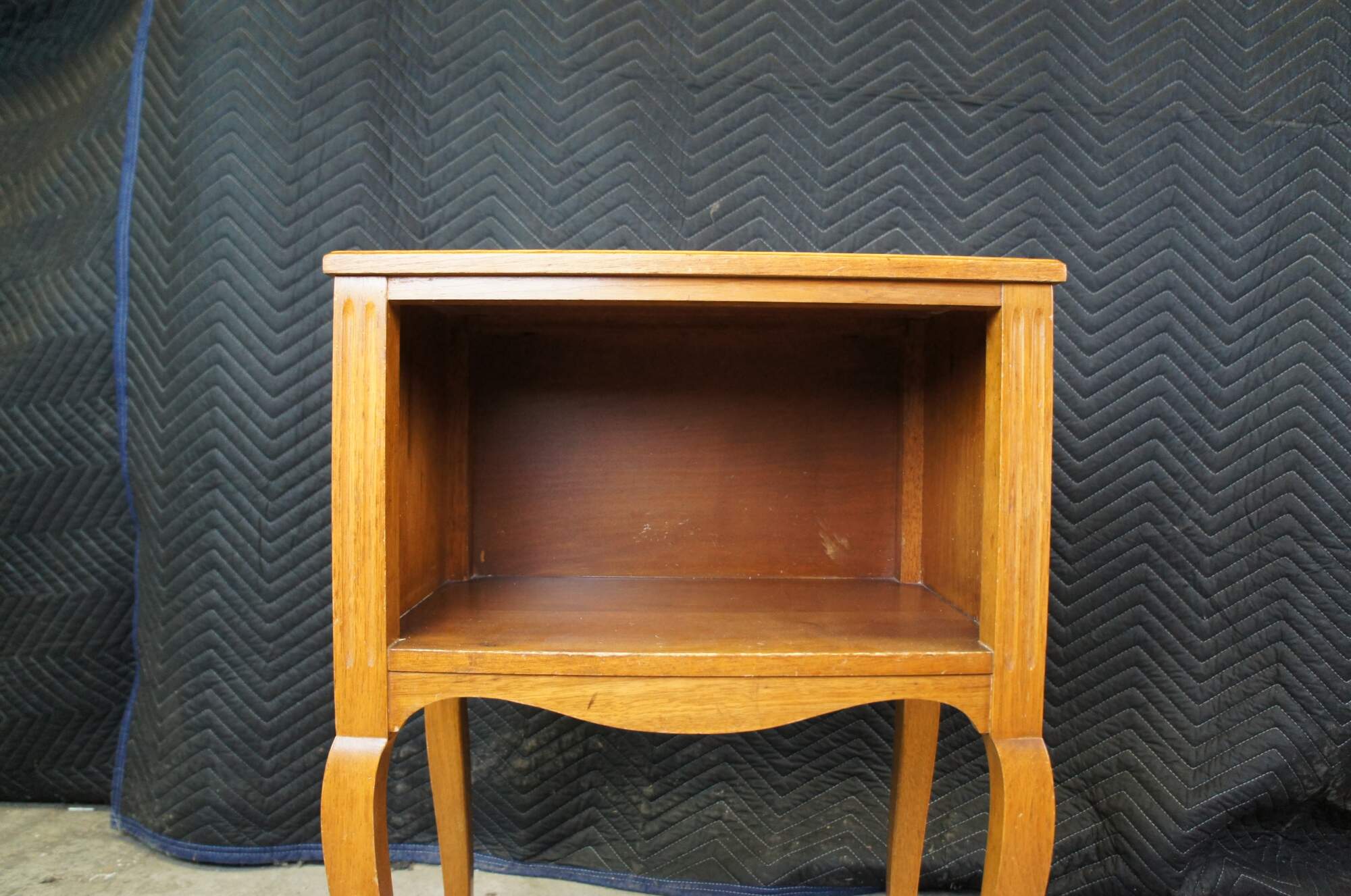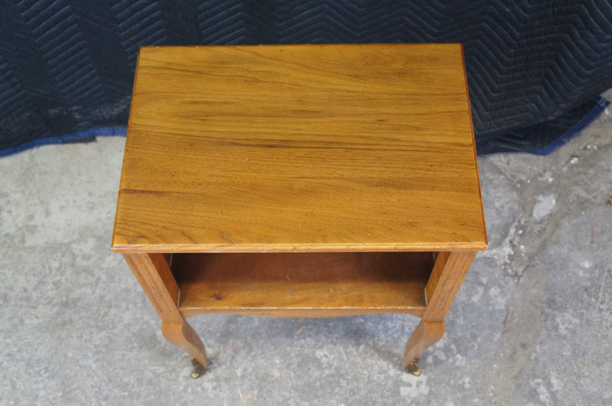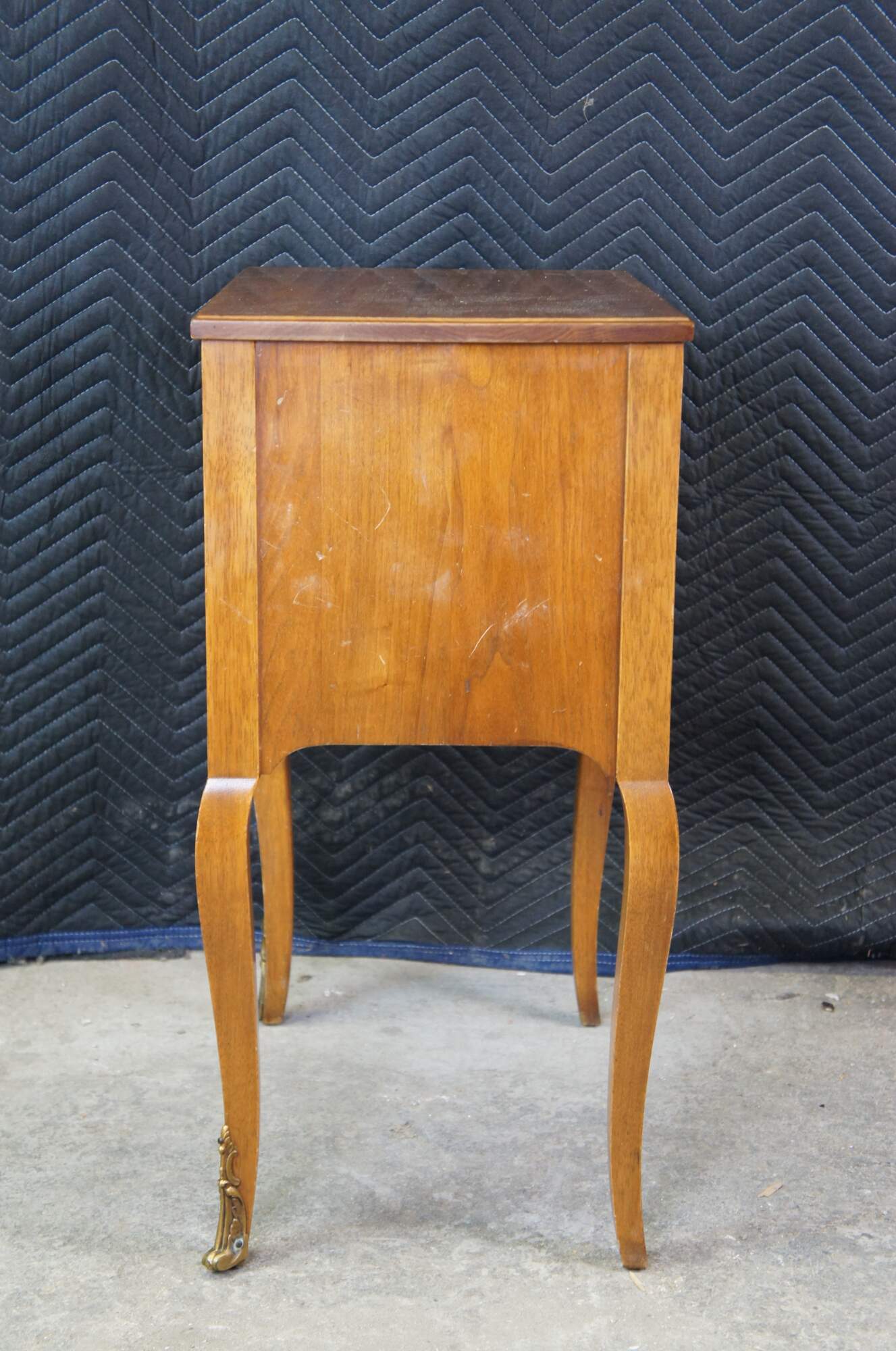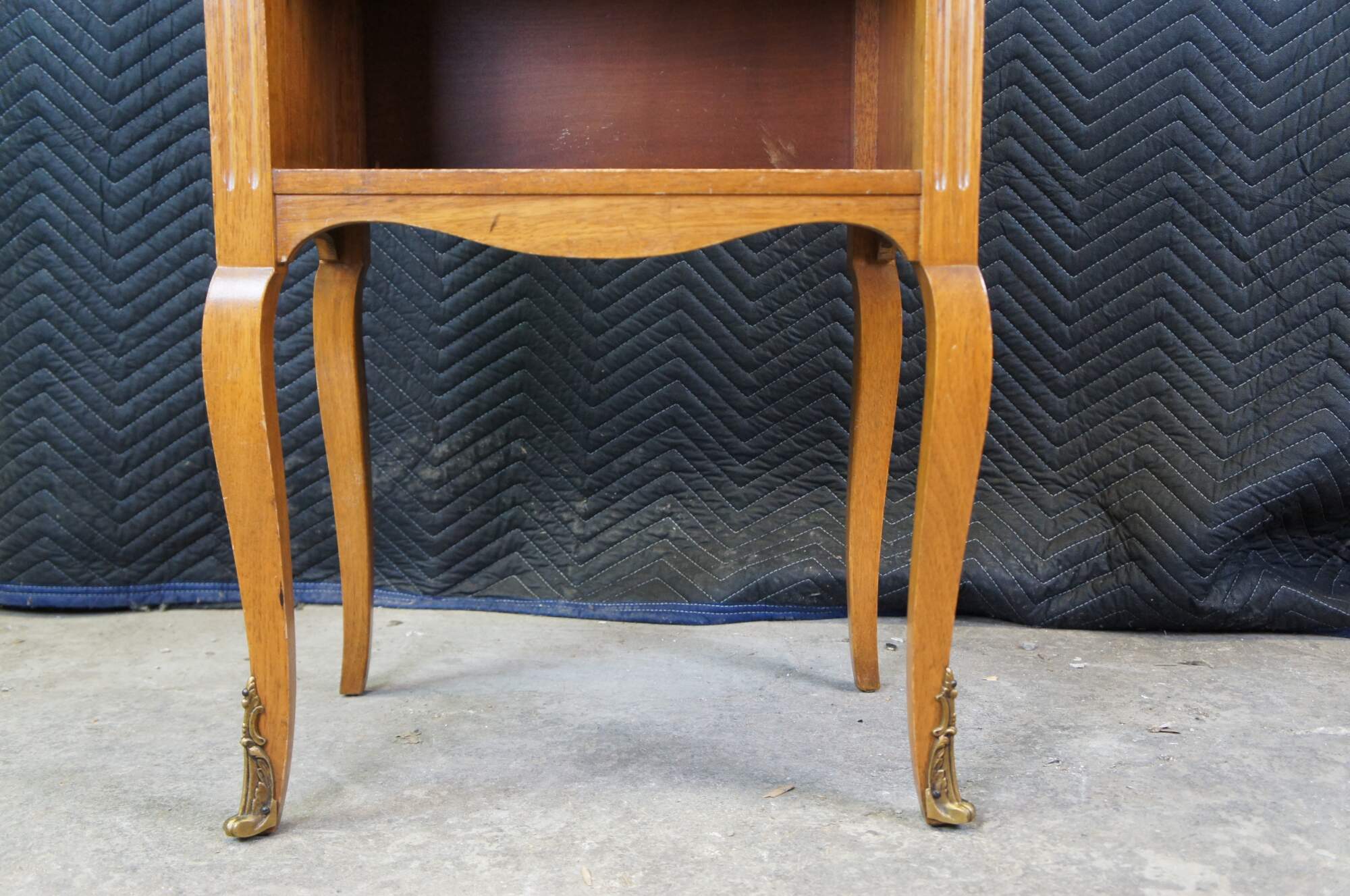 A lovely nightstand or accent table by Robert W. Irwin Furniture Company. Crafted from French Walnut in Louis XV styling. Features a rectangular form with open cubby flanked by fluted stiles, serpentine apront and long cabriole legs with ormolu mounts. Circa 1928-1940