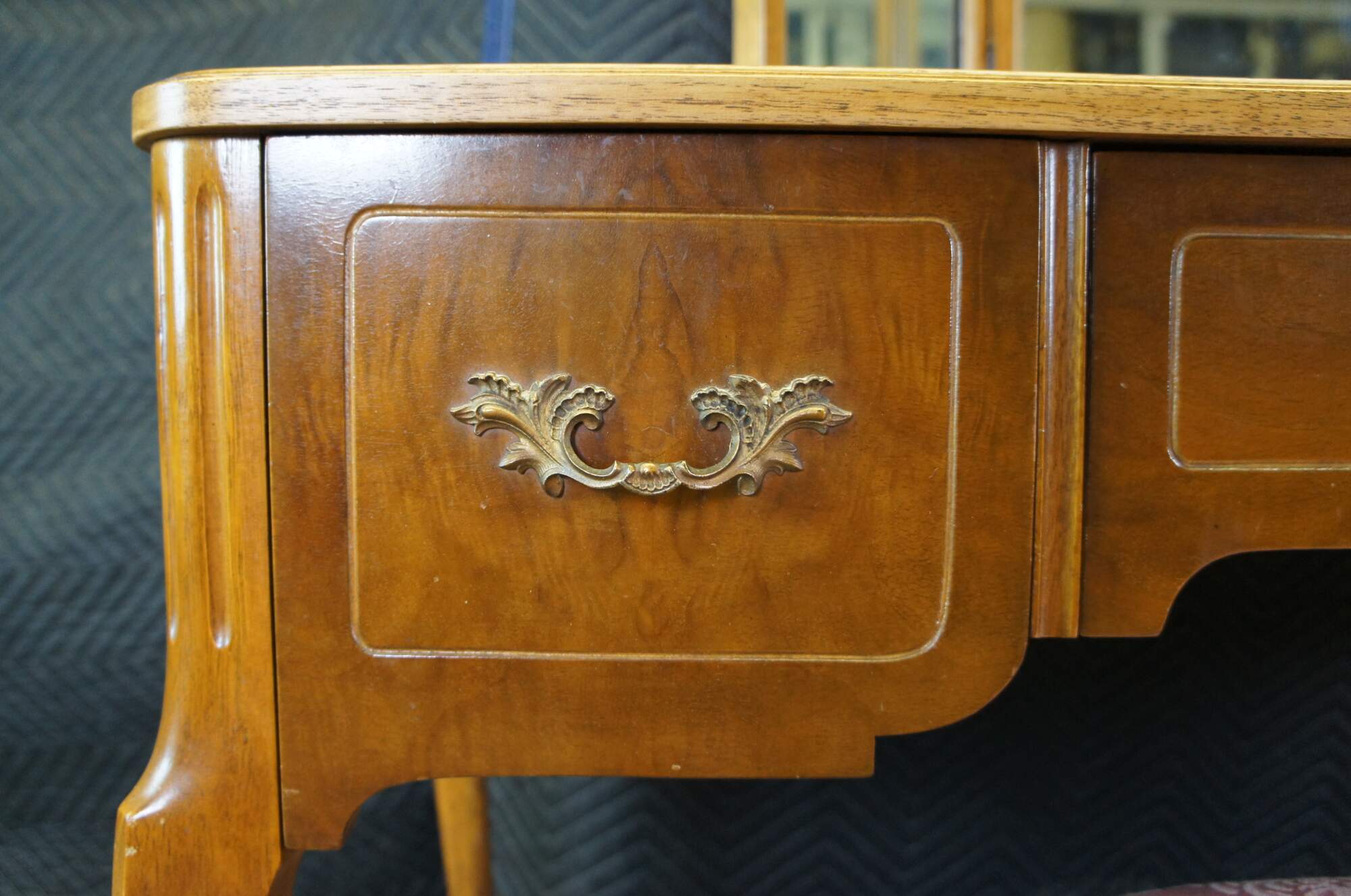 An exquisite dressing table, trifold mirror and stool by Robert W. Irwin Furniture Company. Circa 1928-1940. Crafted from French Walnut in Louis XV styling. Features a rectangular form with three drawers having a burled walnut front, long cabriole legs and ormolu mounts. Matching stool upholstered in a pink brocade fabric. Trifold mirror removes allowing for use as a writing desk.