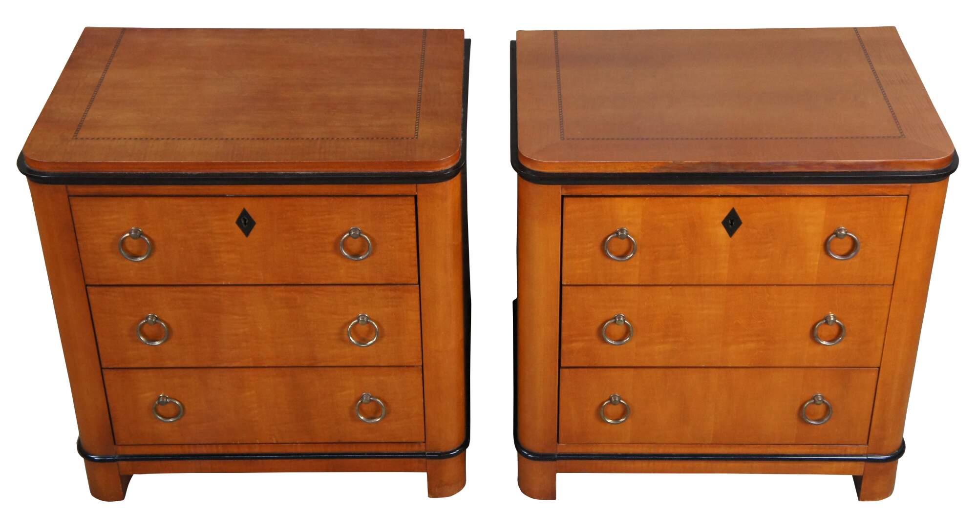 Late 20th century pair of bedside tables by National Mt. Airy. Made from curly maple with three dovetailed drawers, ebonized trim, brass knocker handles, and branding along the top. Includes a locktable top drawer with diamond shaped escutcheon.