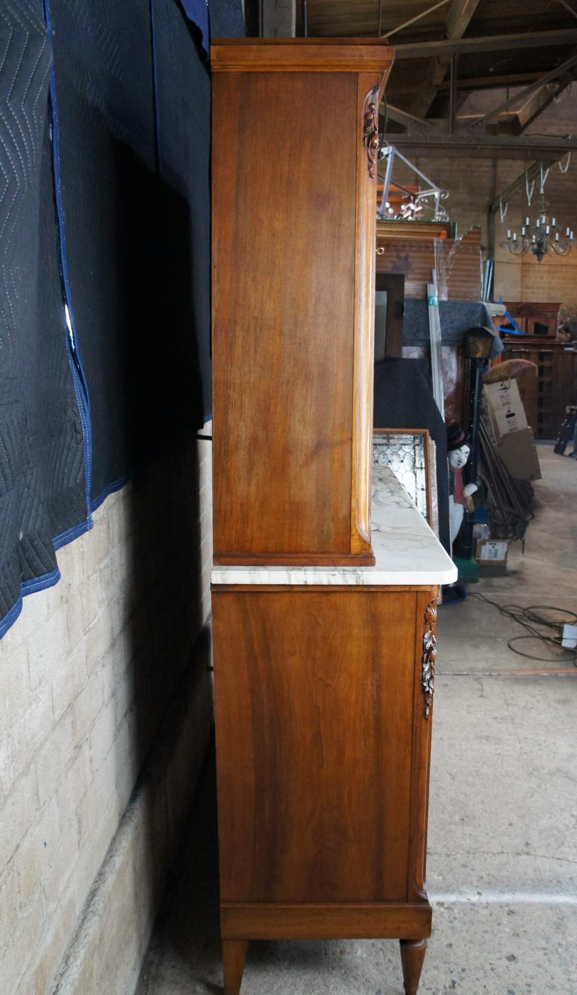 Antique Victorian era French Renaissance Huntboard, circa 1890s. Made from walnut with beautiful foliate hand carvings, a white marble top and intricate mirrored hutch. Buffet portion features three drawers with beaded carving and neoclassical brass hardware. Beneath the drawers is a large cupboard area for storage. Hutch features a central out cove with beveled mirror flanked by three drawers along each side surmounted by an upper display section with one glass shelf. The stiles of the cabinet are chamfered with meticulous floral and leaf carvings. This theme is mimicked throughout each cabinet door with an elegant ribbon tying the bouquets together. The cabinet is supported by turned and tapered feet. Includes functional locks and keys. This cabinets unique form allows for versatility. Great for use as a buffet, server, sideboard, china cabinet or barback