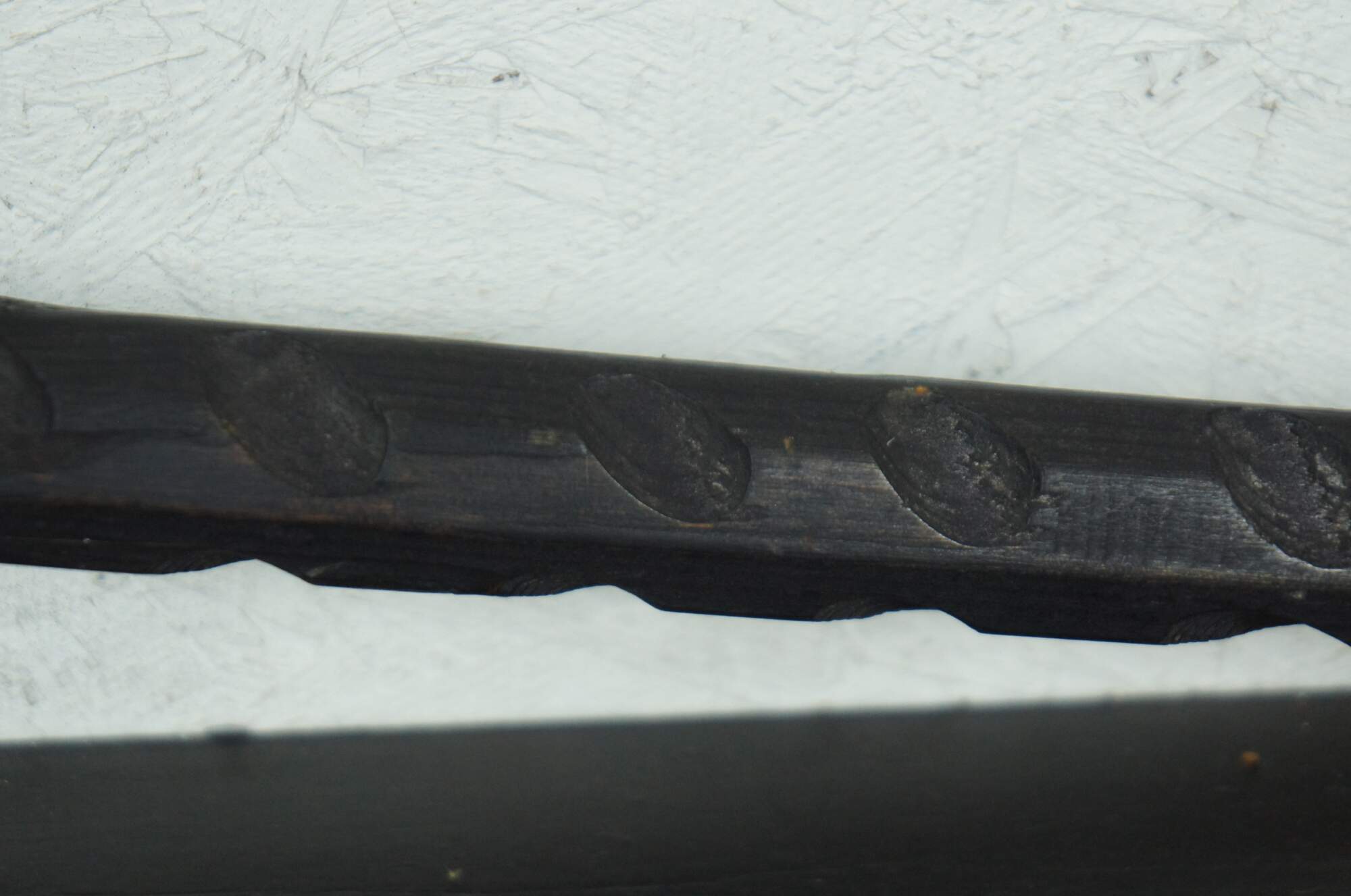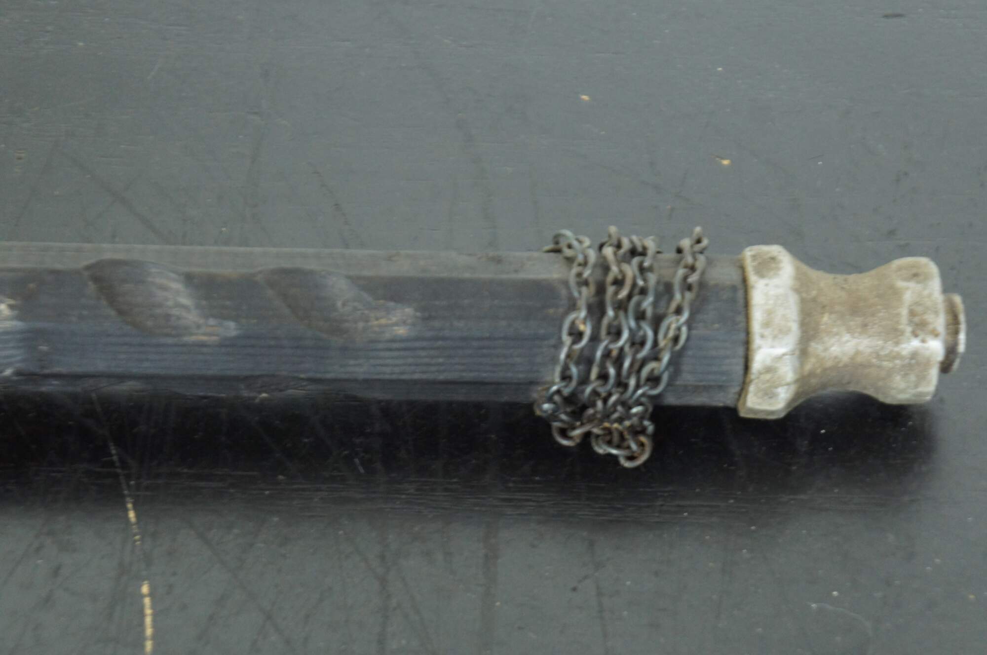 Vintage reproduction medieval style battle axe with a long black wood handle studded decoratively with nails and accented with chain.
