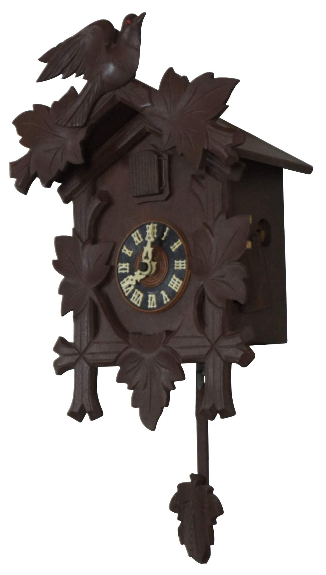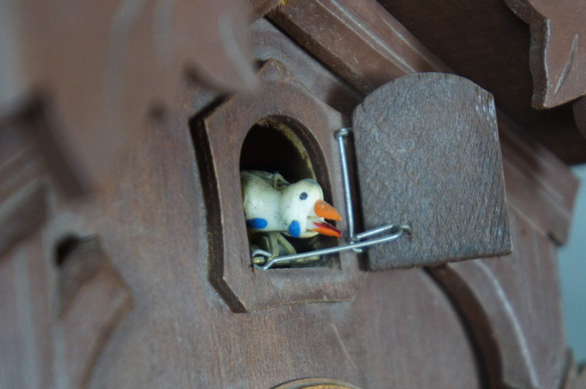 Antique circa 1930’s German Black Forest cuckoo clock decorated with carved branches, leaves and bird with orange glass eye; includes two pine cone weights. G. M. Angem works, marked on back German 605 F.