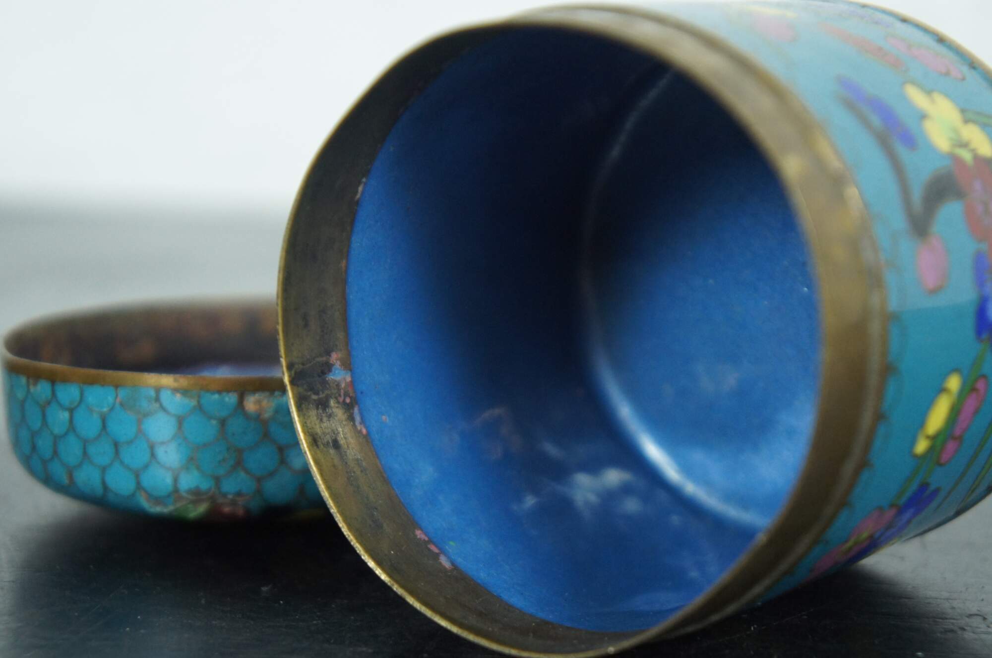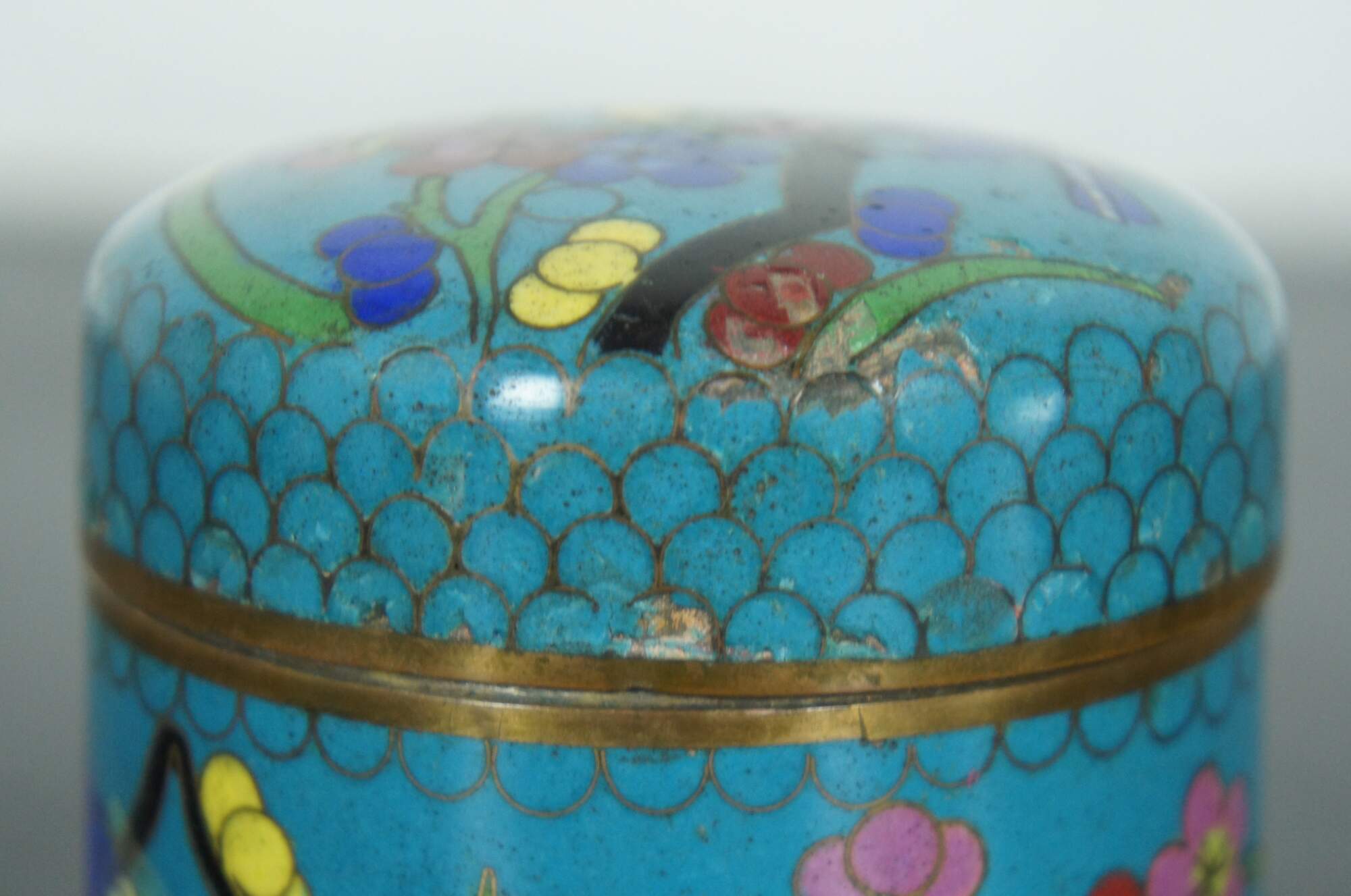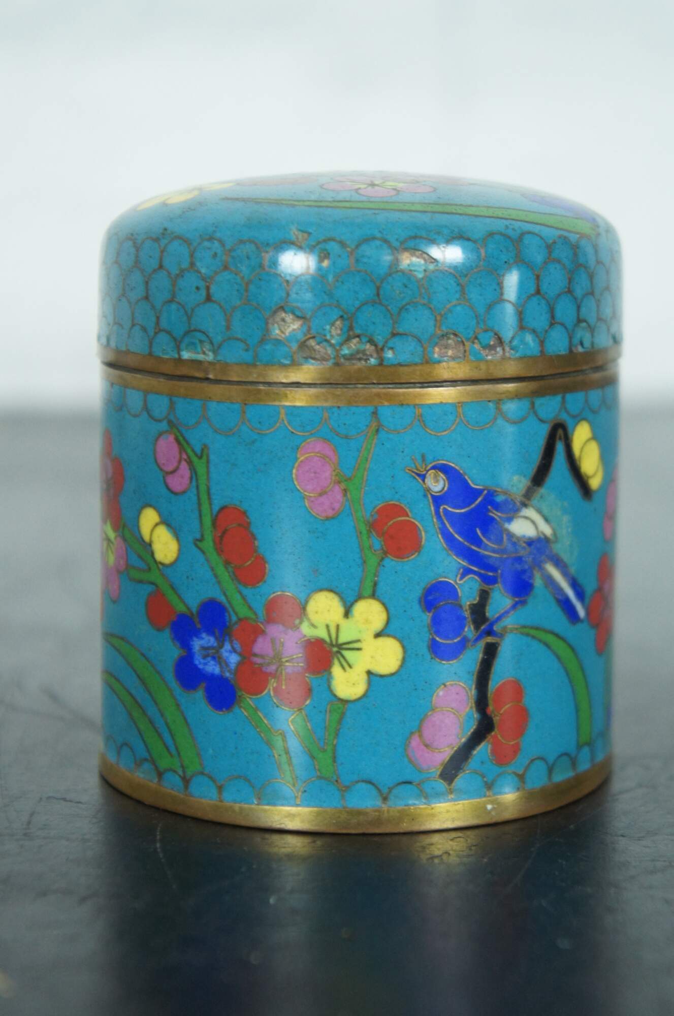 Vintage Chinese cloisonne enamel small tea caddy or canister featuring red and yellow flowers with blue birds on a turquoise ground.