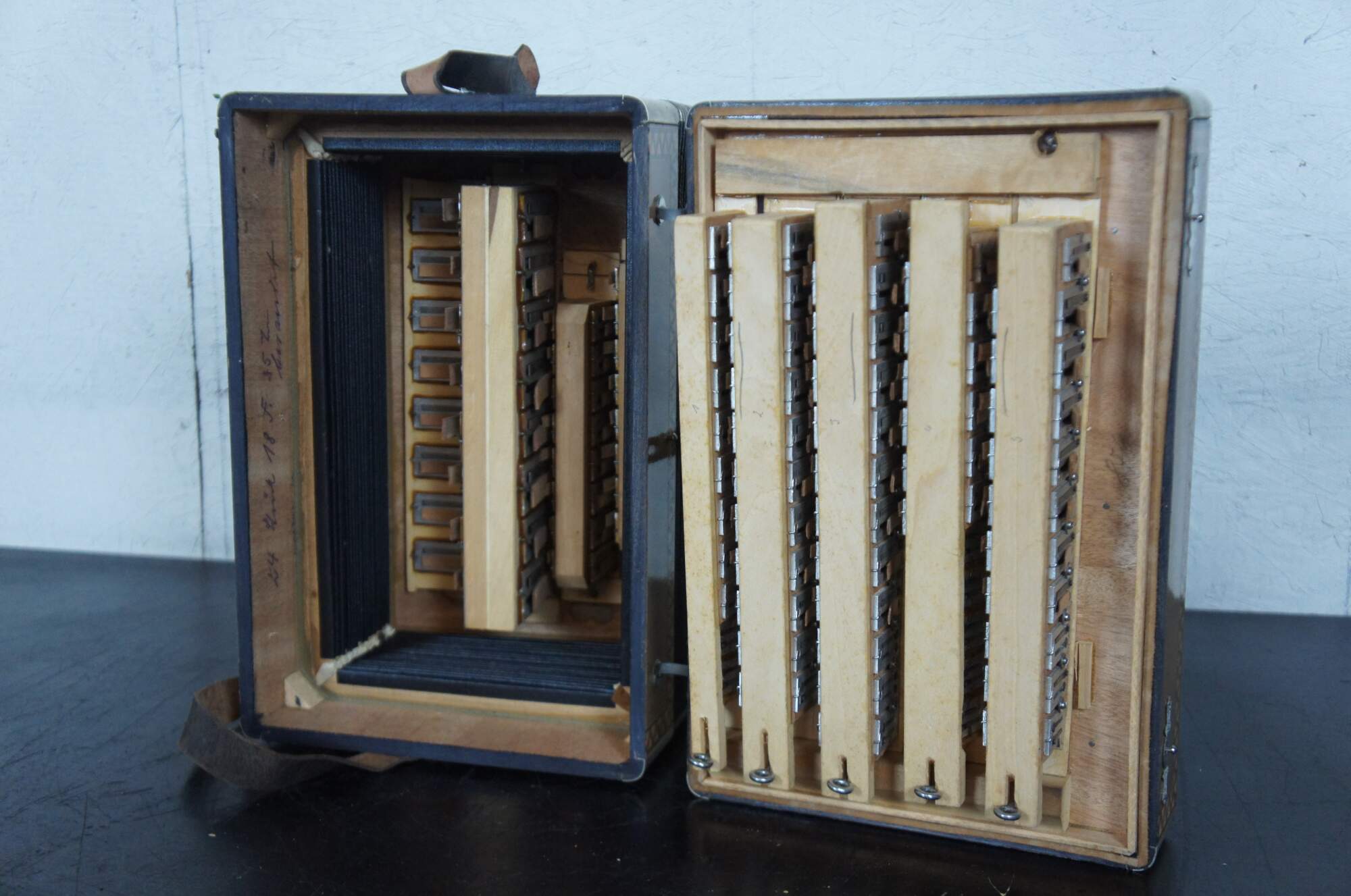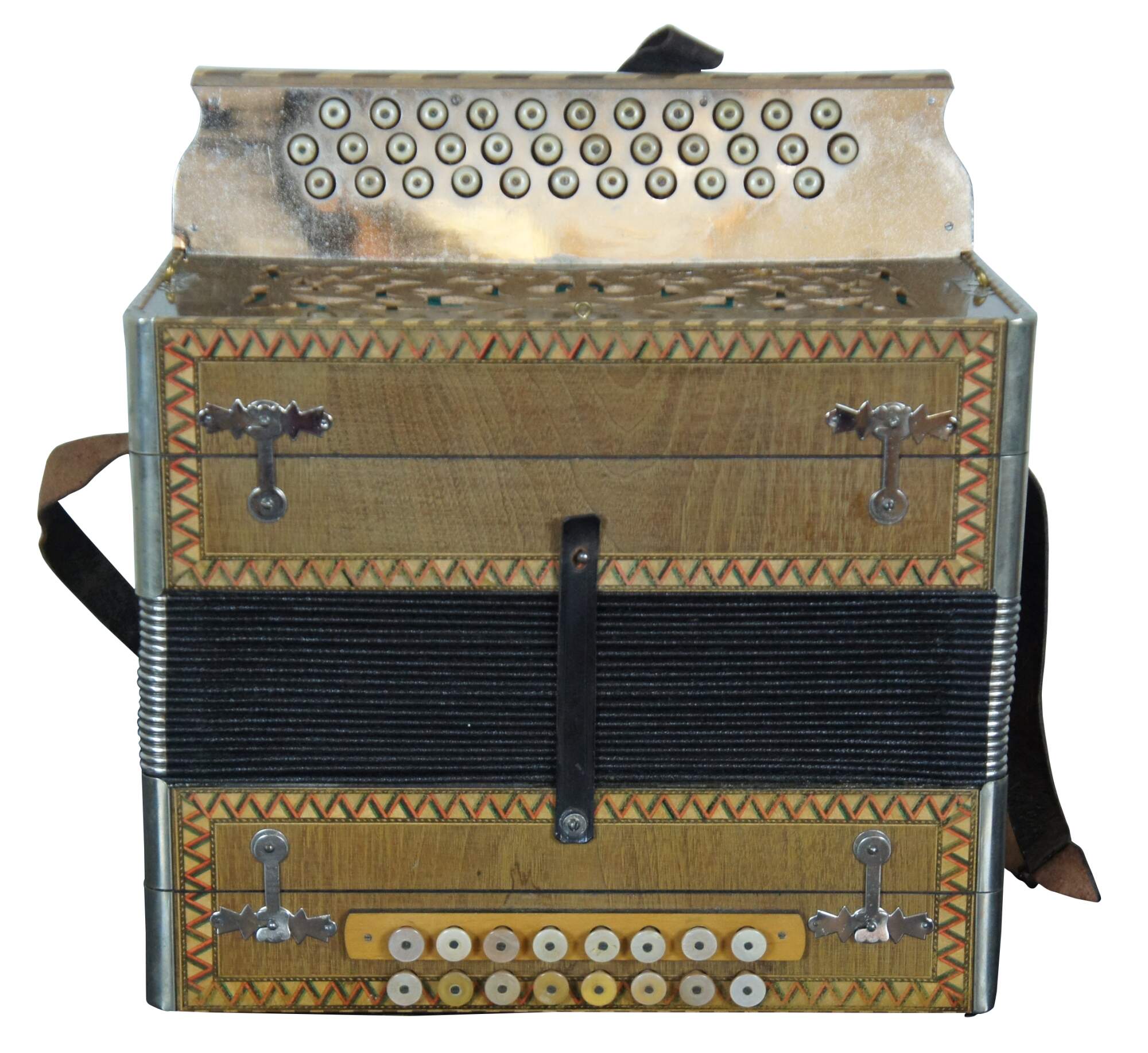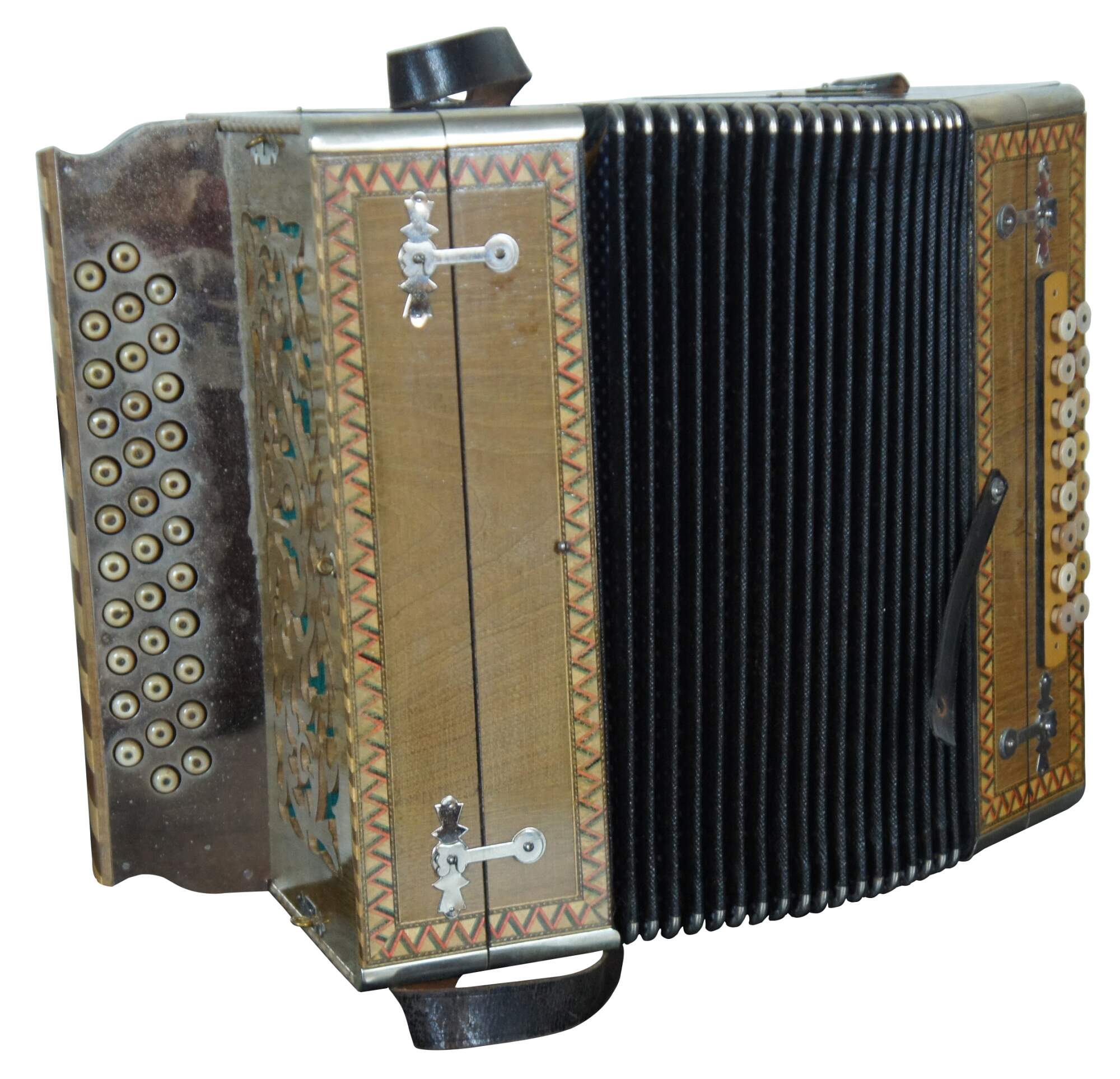 Antique inlaid parquetry design and painted accordion or squeezebox with mother of pearl buttons, leather strap, and a wooden case lined with green baize / felt, made by Meinel & Herold Musikinstrumente-Harmonikafabrik Klingenthal (Sachsen).