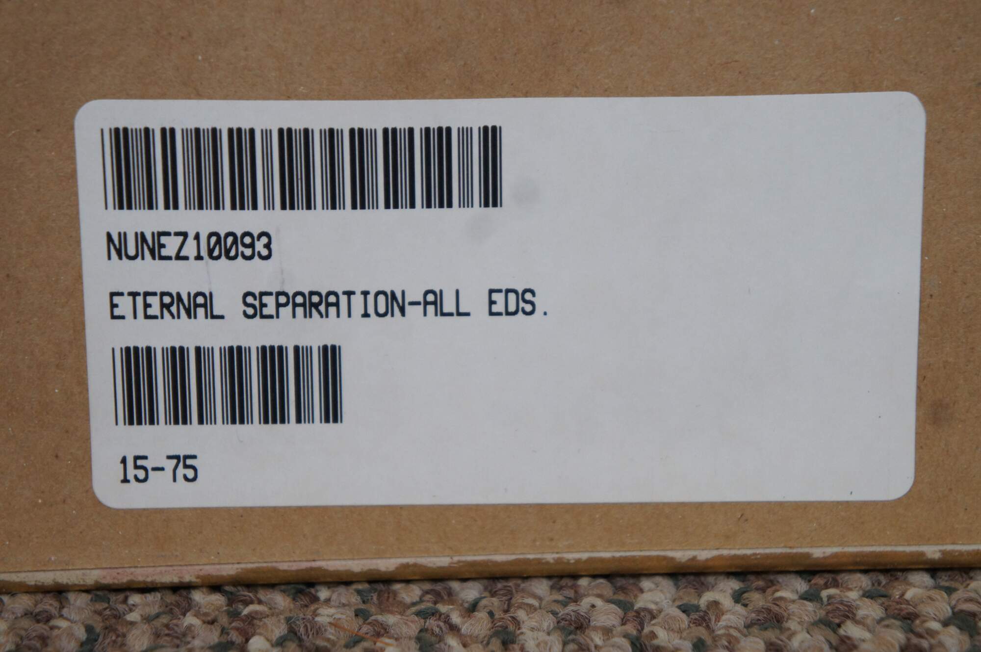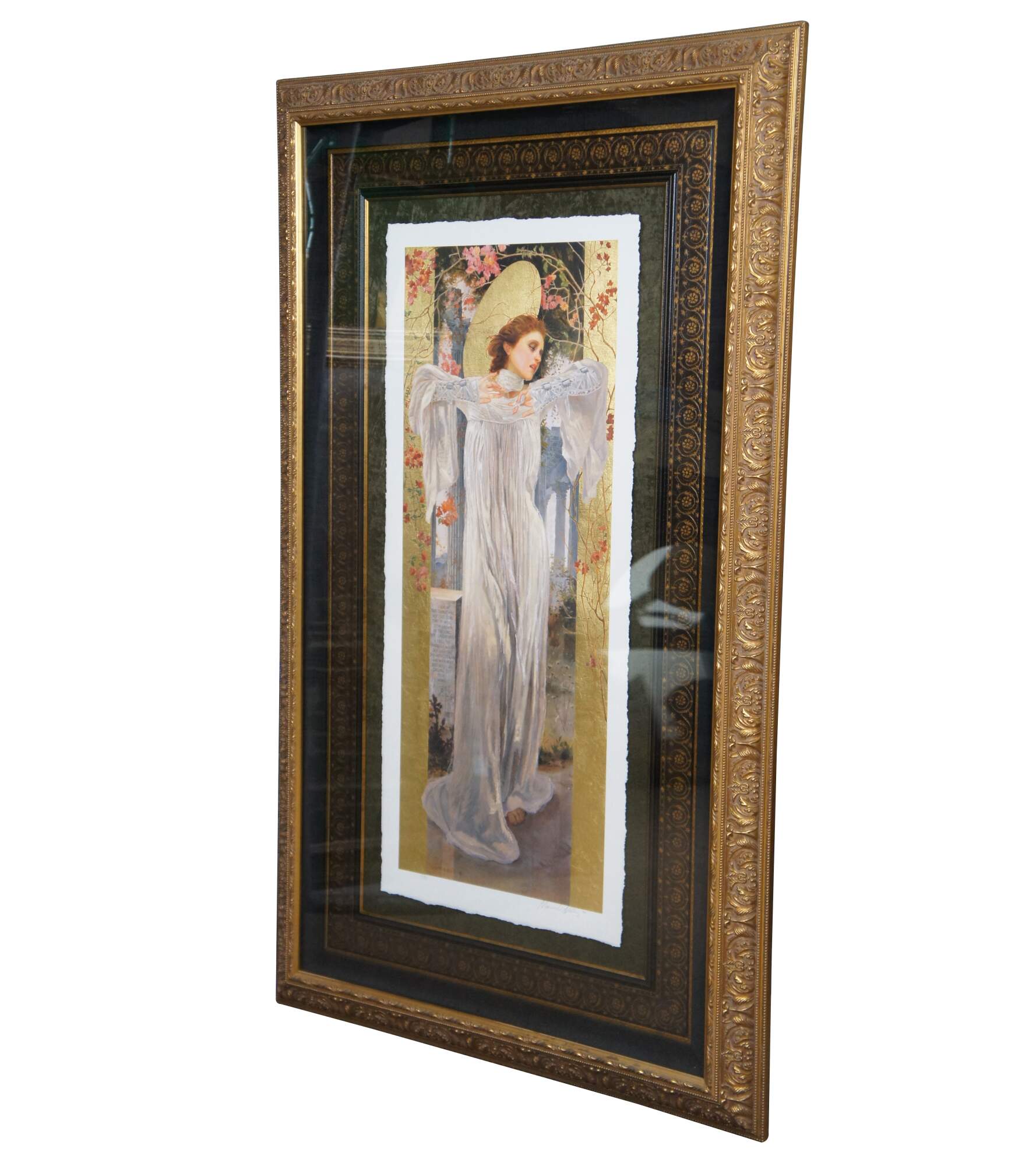 Elaborately framed gilded / gold leaf giclee print of “Eternal Separation” by Manuel Nunez in 2000, pencil signed and numbered 15/75. The art shows a female figure in a long white gown with a golden halo behind her head, standing in a colonnade, under an arch of flowering branches, framed on either side with panels of gold leaf.