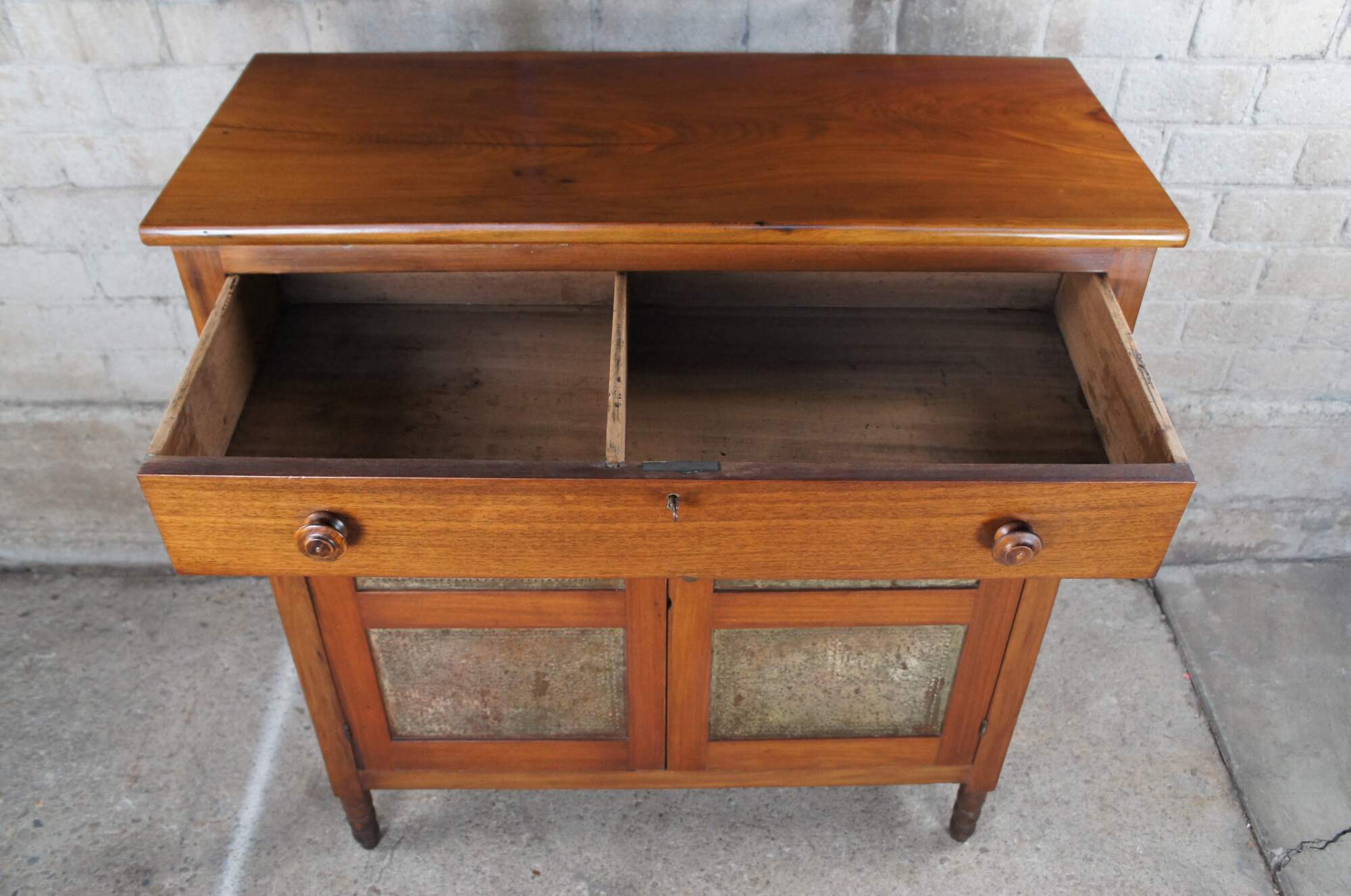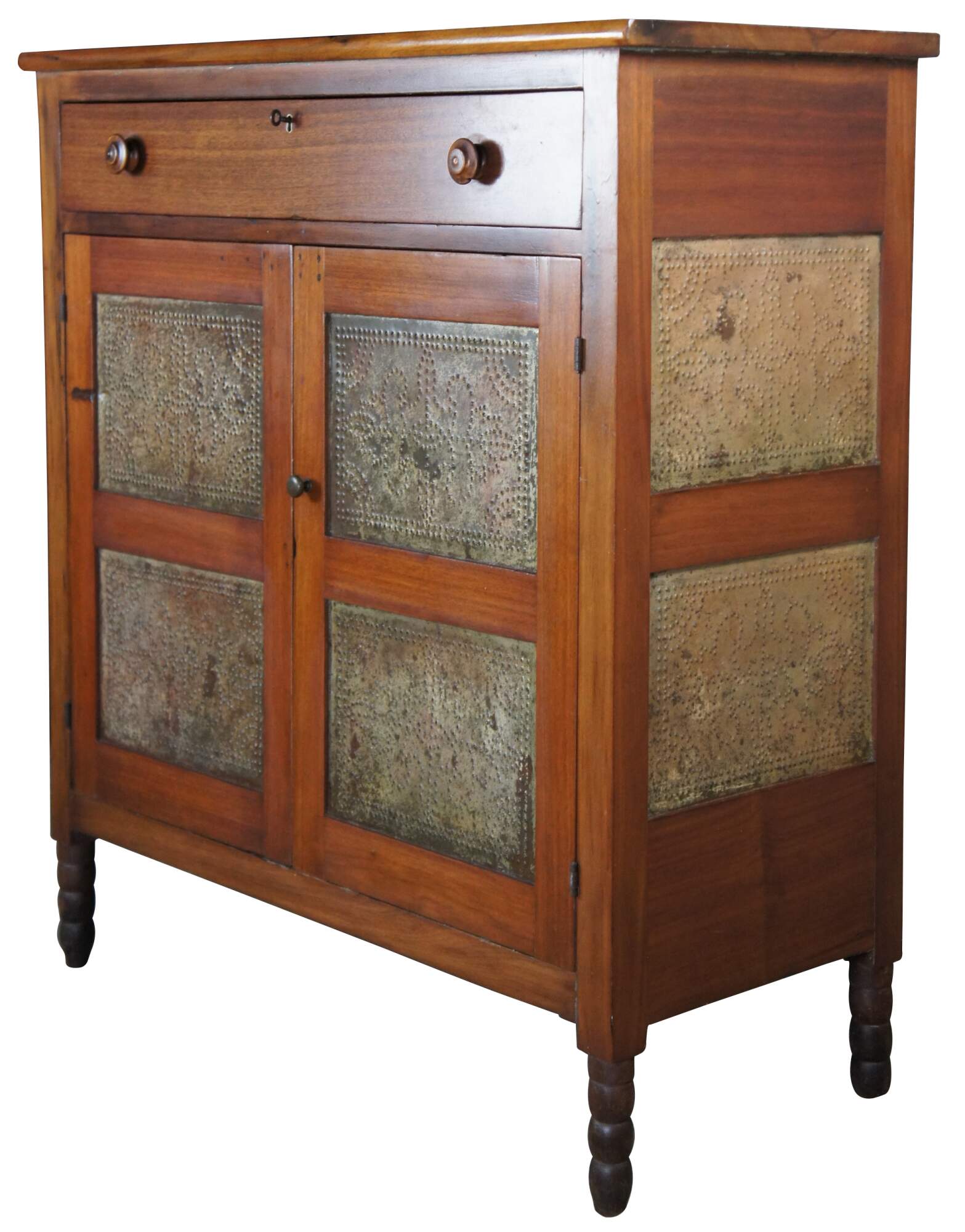 Antique American Country farmhouse pie safe, cupboard or kitchen cabinet. Made of walnut featuring punched tin panels, turned nubby legs and upper hand dovetailed divided locking drawer. Circa first half 19th century.
